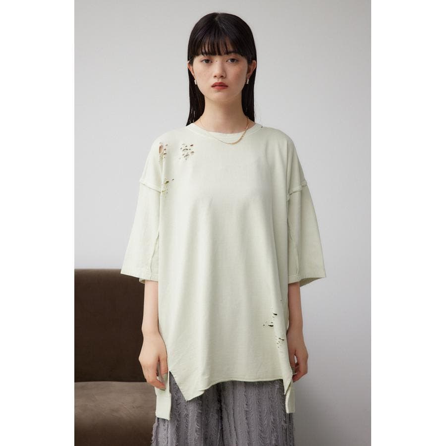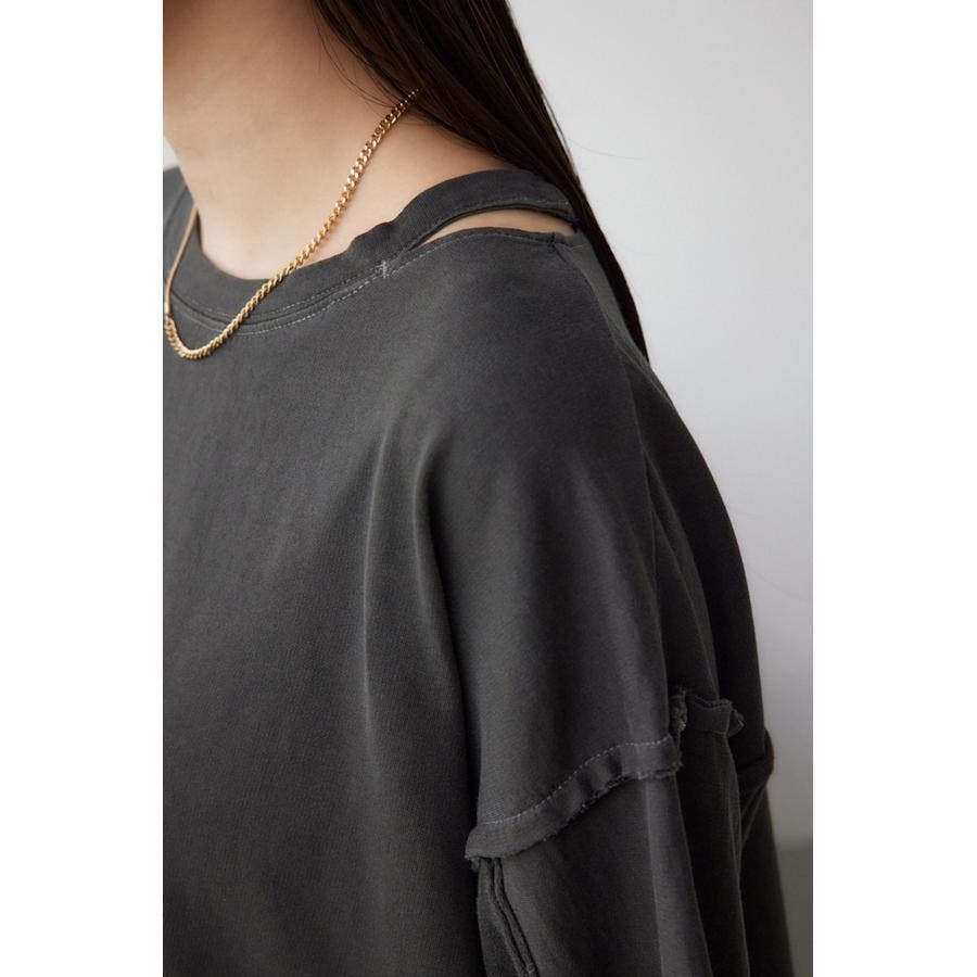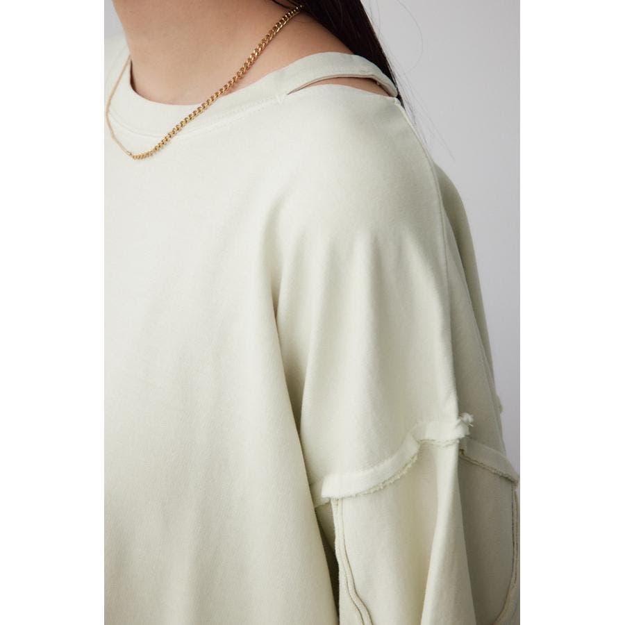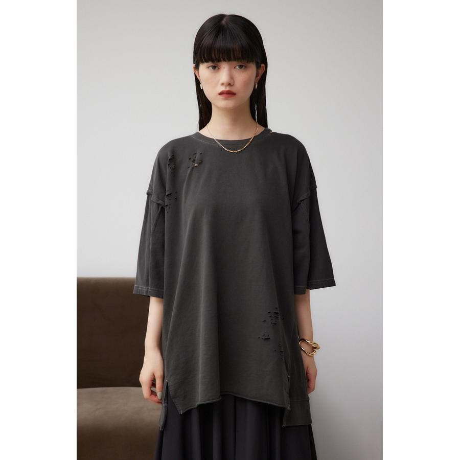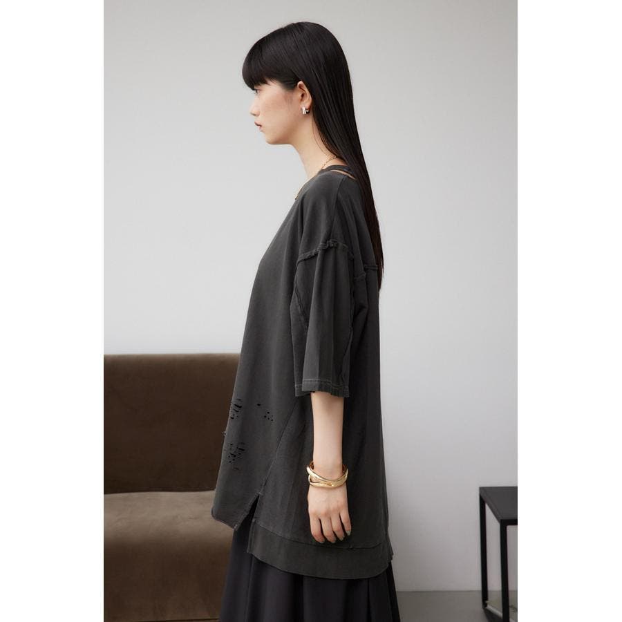 ダメージ加工と、切り替えデザインがポイントの裏毛トップスです。