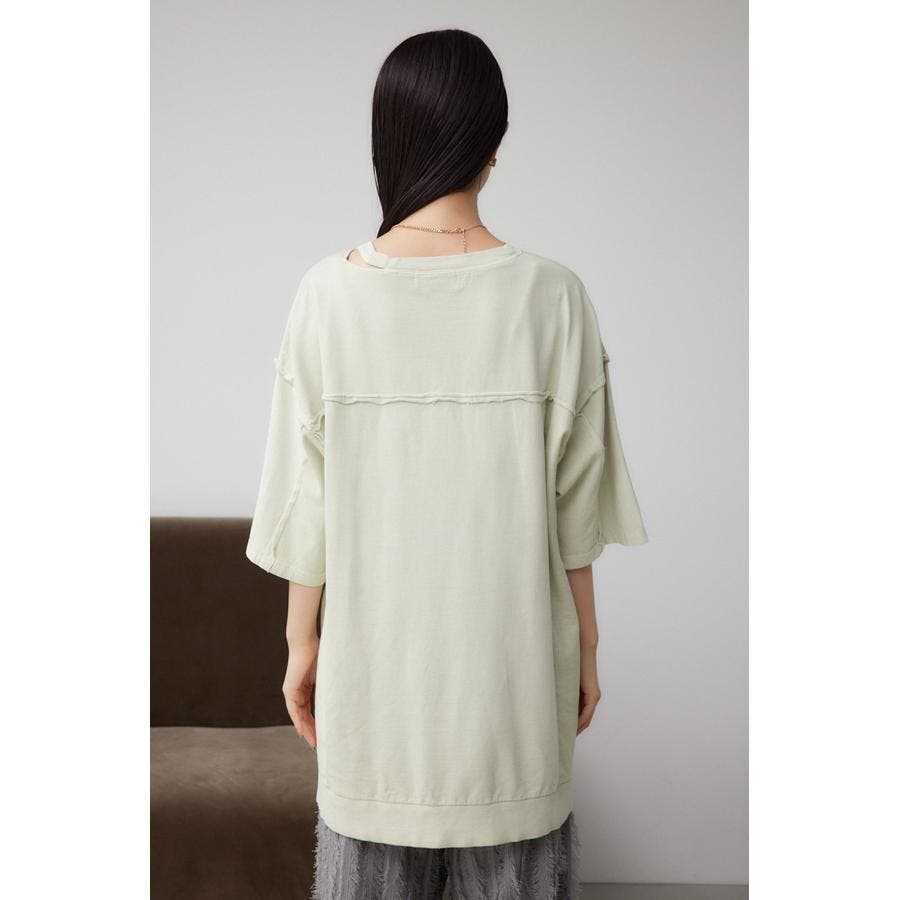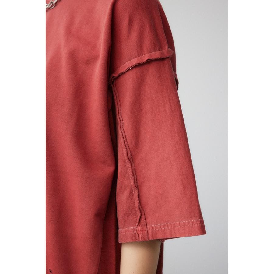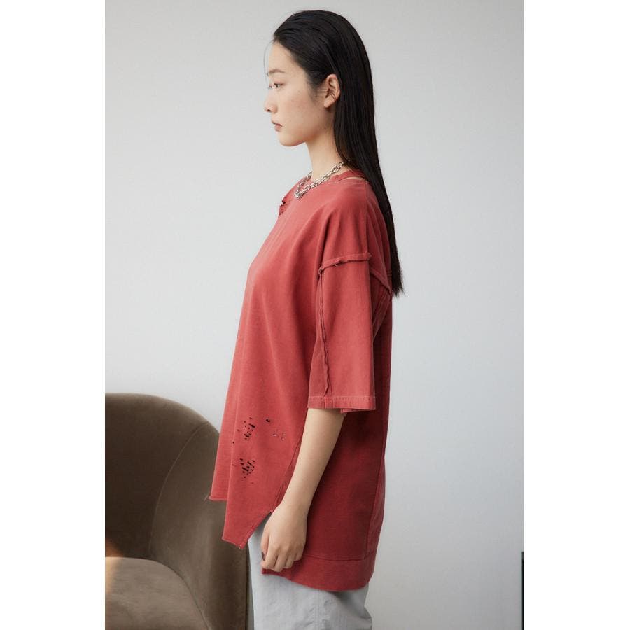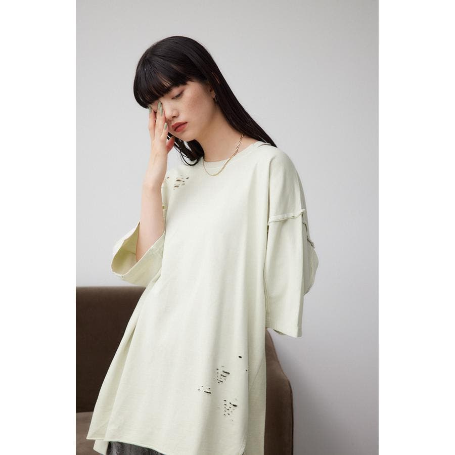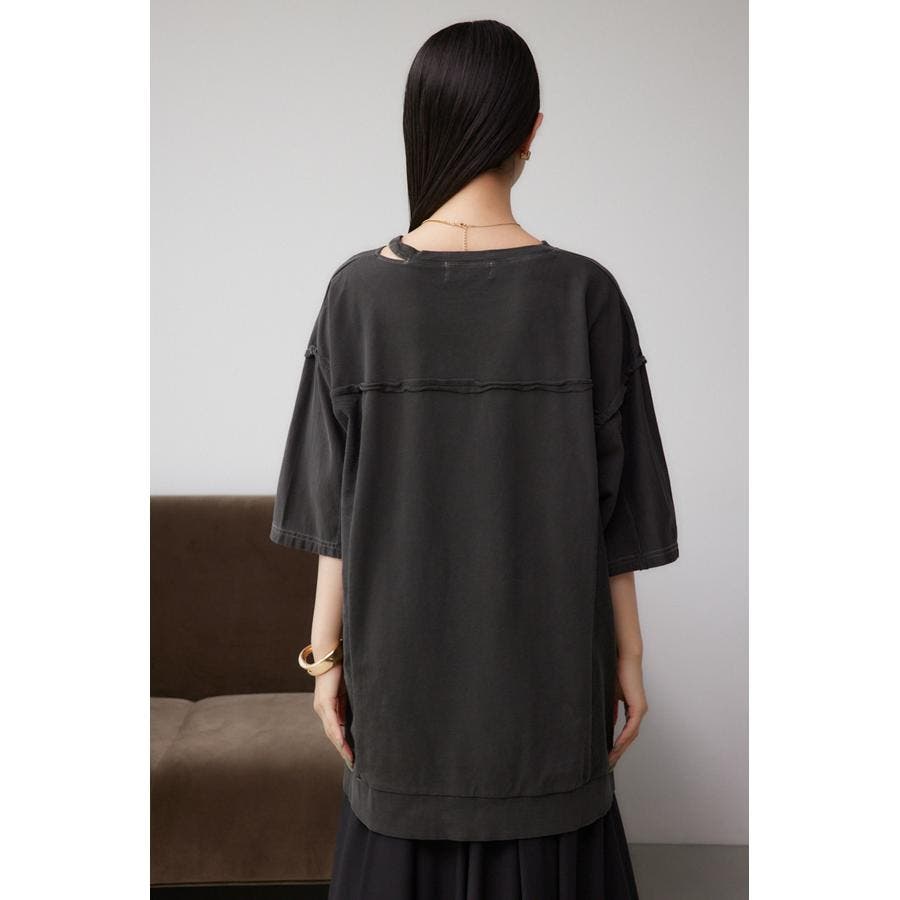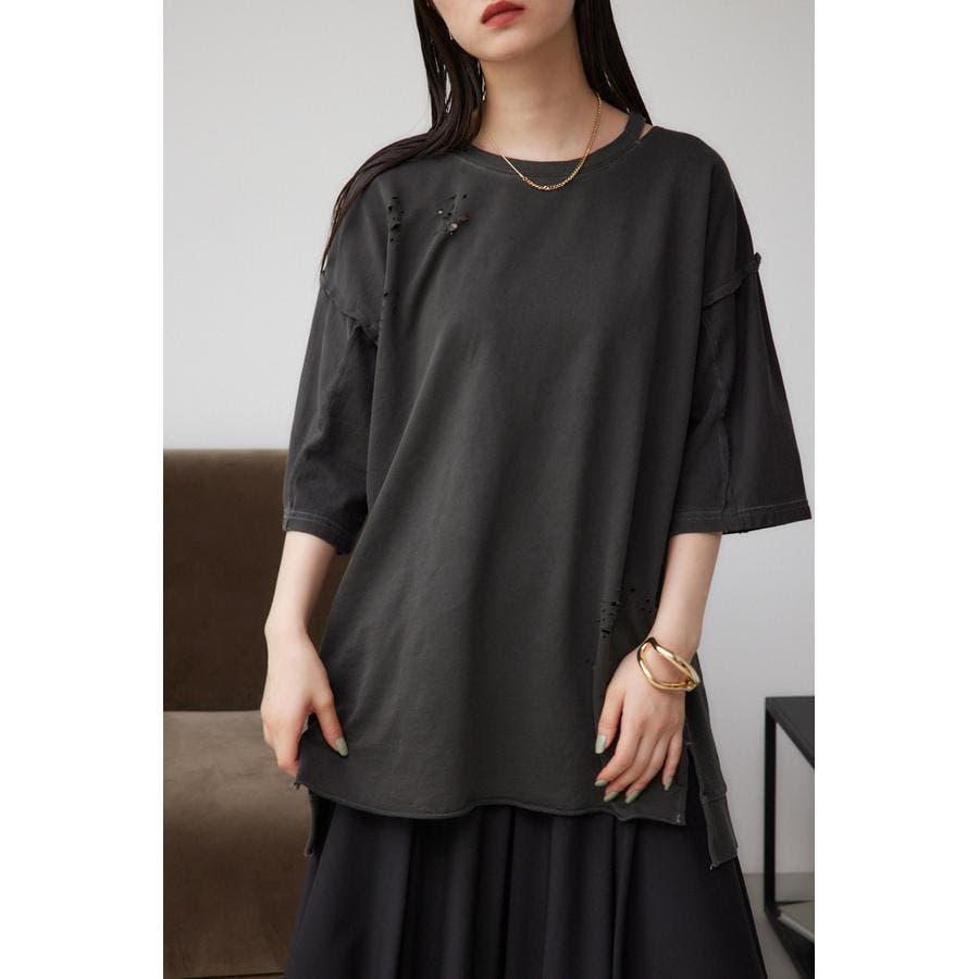 ダメージ加工と、切り替えデザインがポイントの裏毛トップスです。