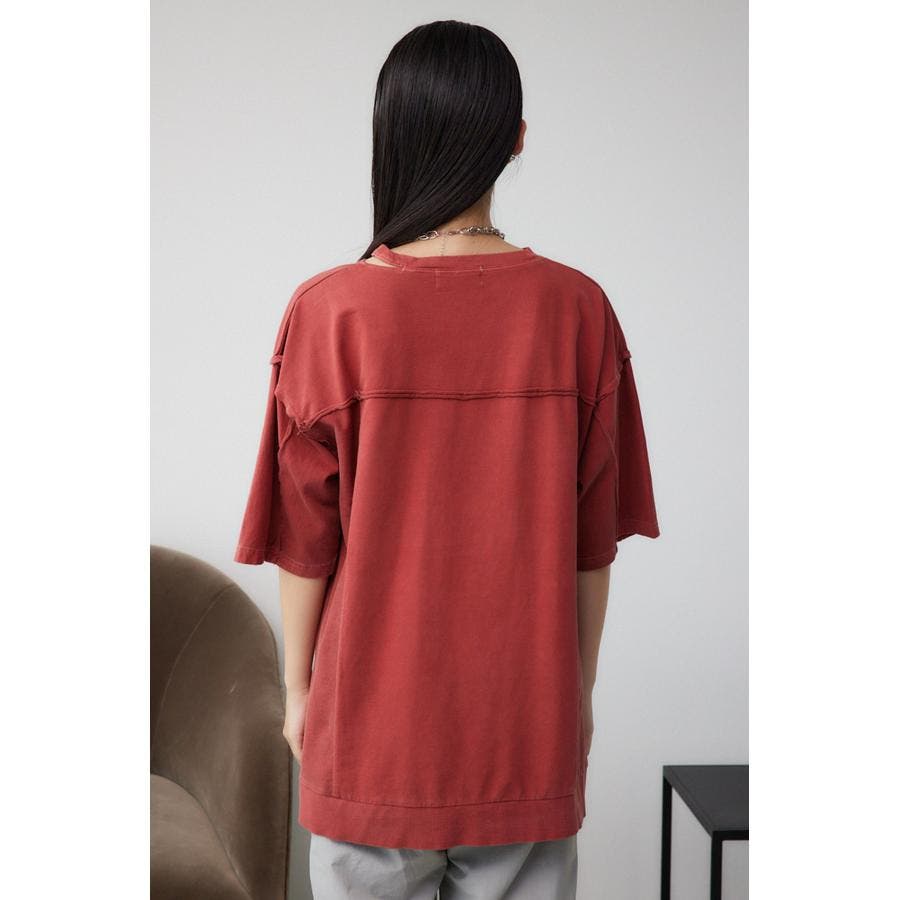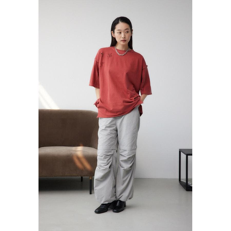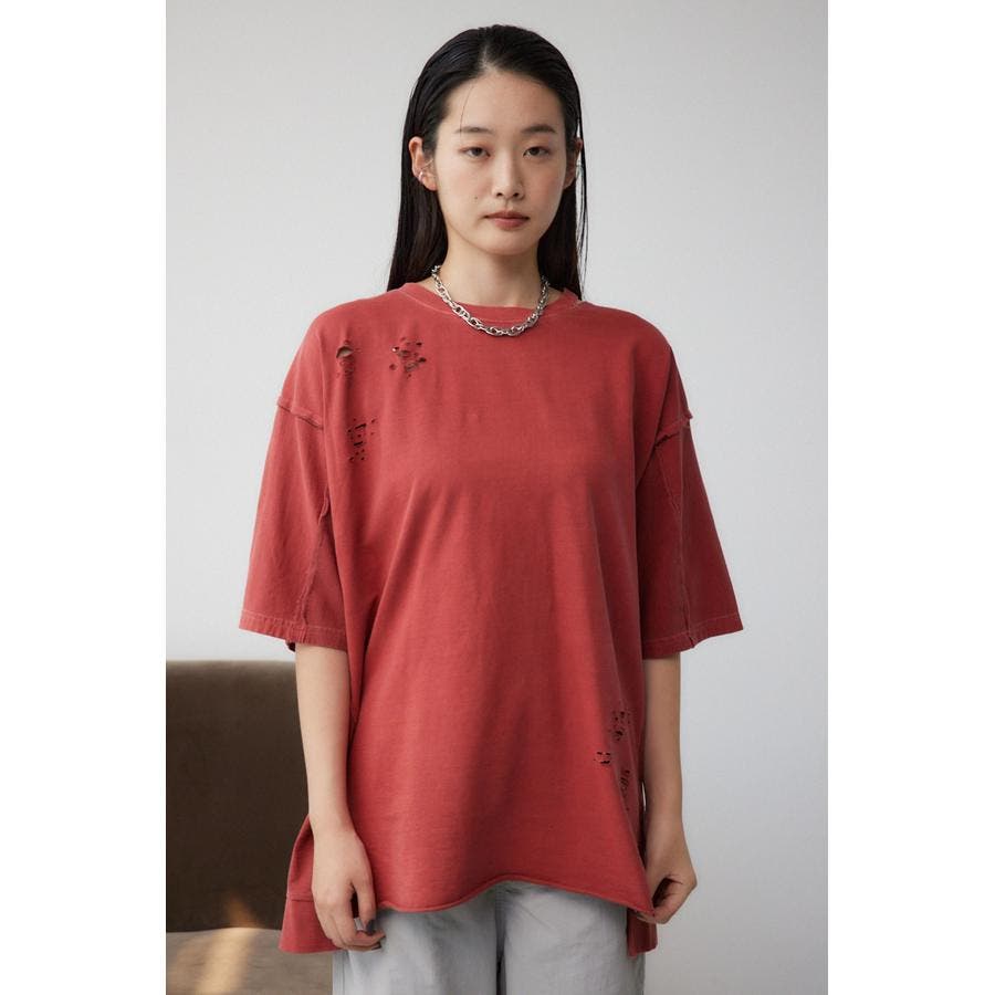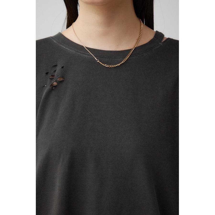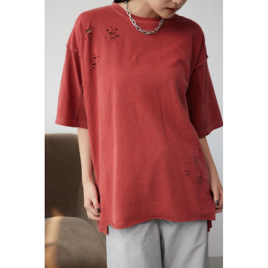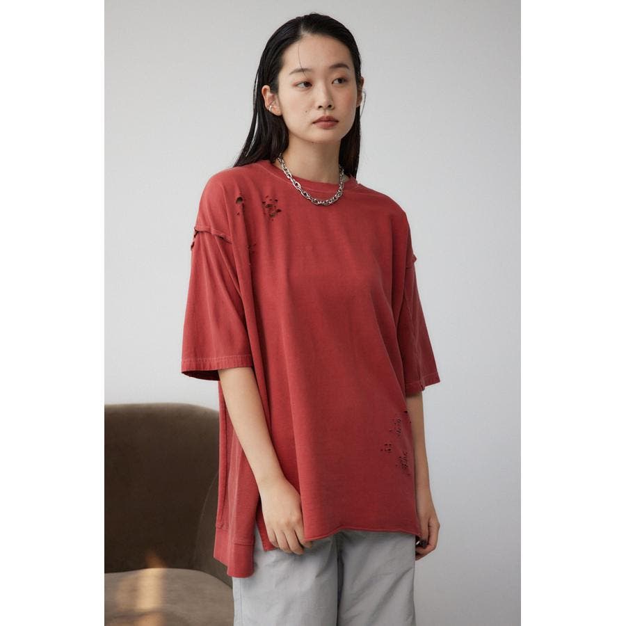 ダメージ加工と、切り替えデザインがポイントの裏毛トップスです。