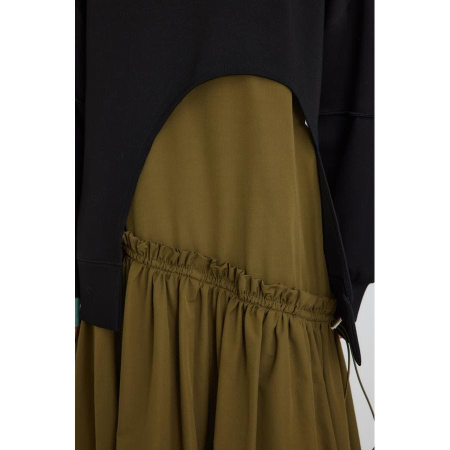 裾の大胆なヘムカットを活かし、シャツとのレイヤードやワンピースの上から合わせるレイヤードスタイルがおすすめです。