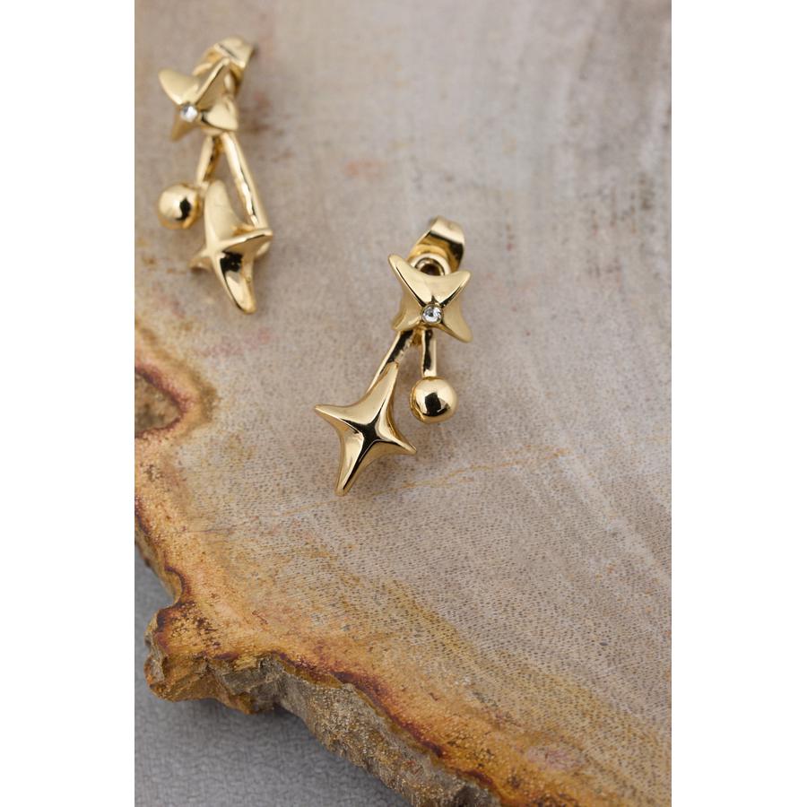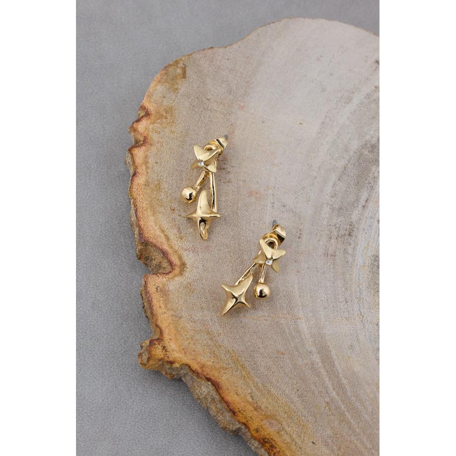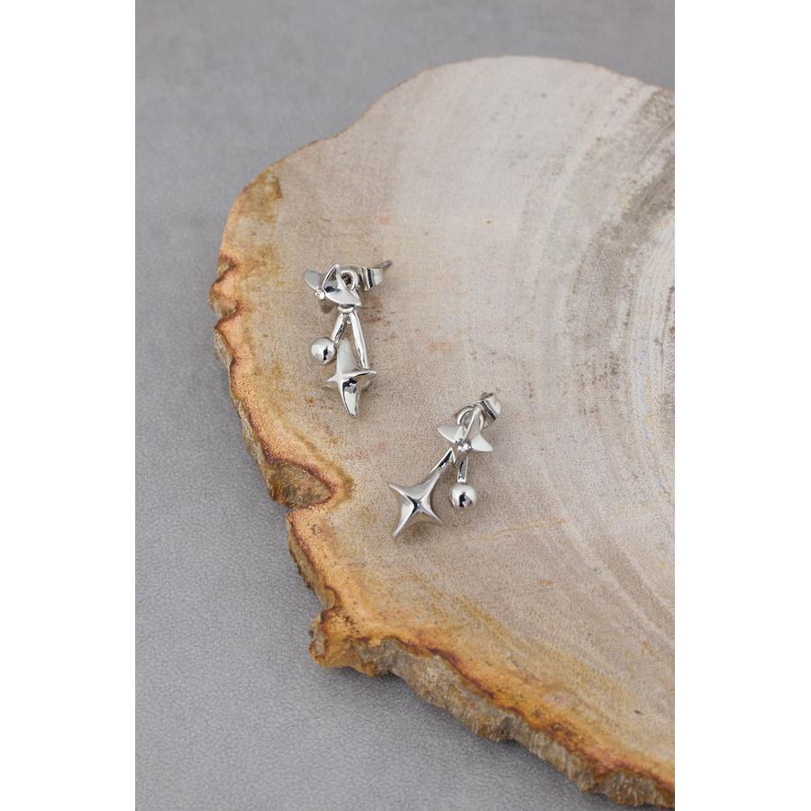 表にはダイヤモチーフ、キャッチ側には長めのパーツを配置し、ダイヤとラインストーンを組み合わせることで、耳たぶの下からモチーフが出現。