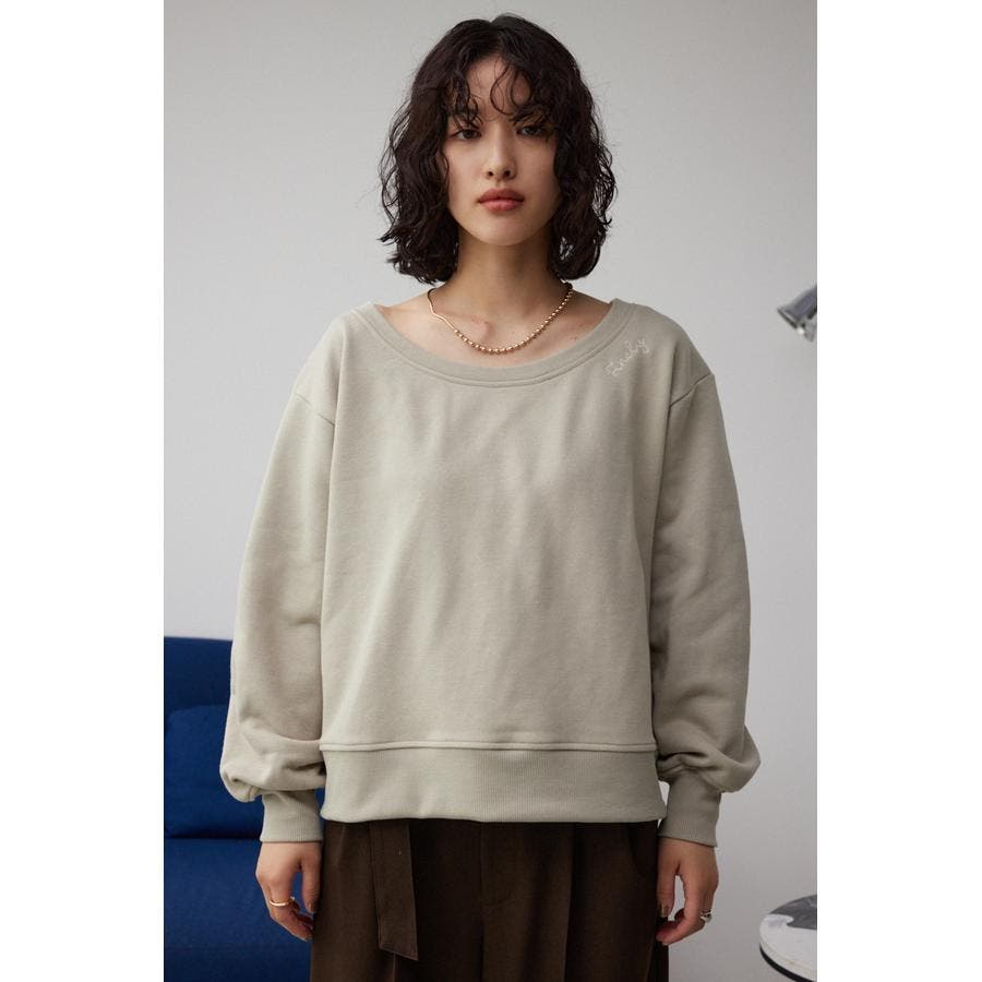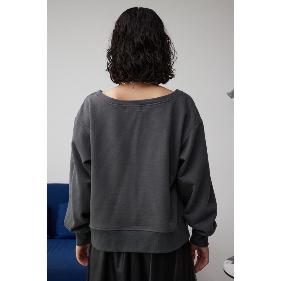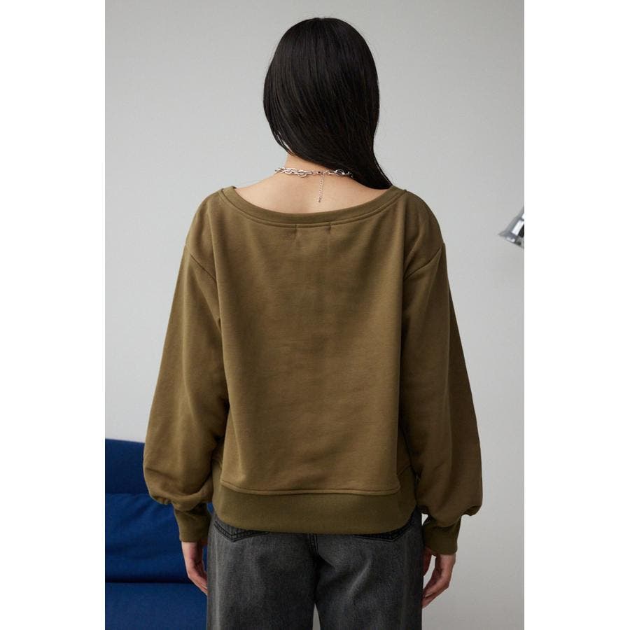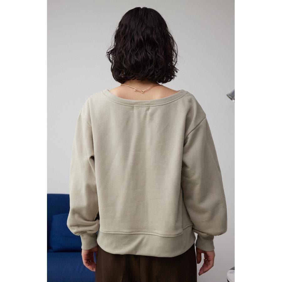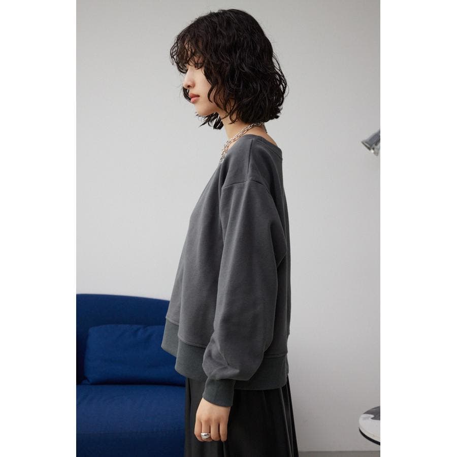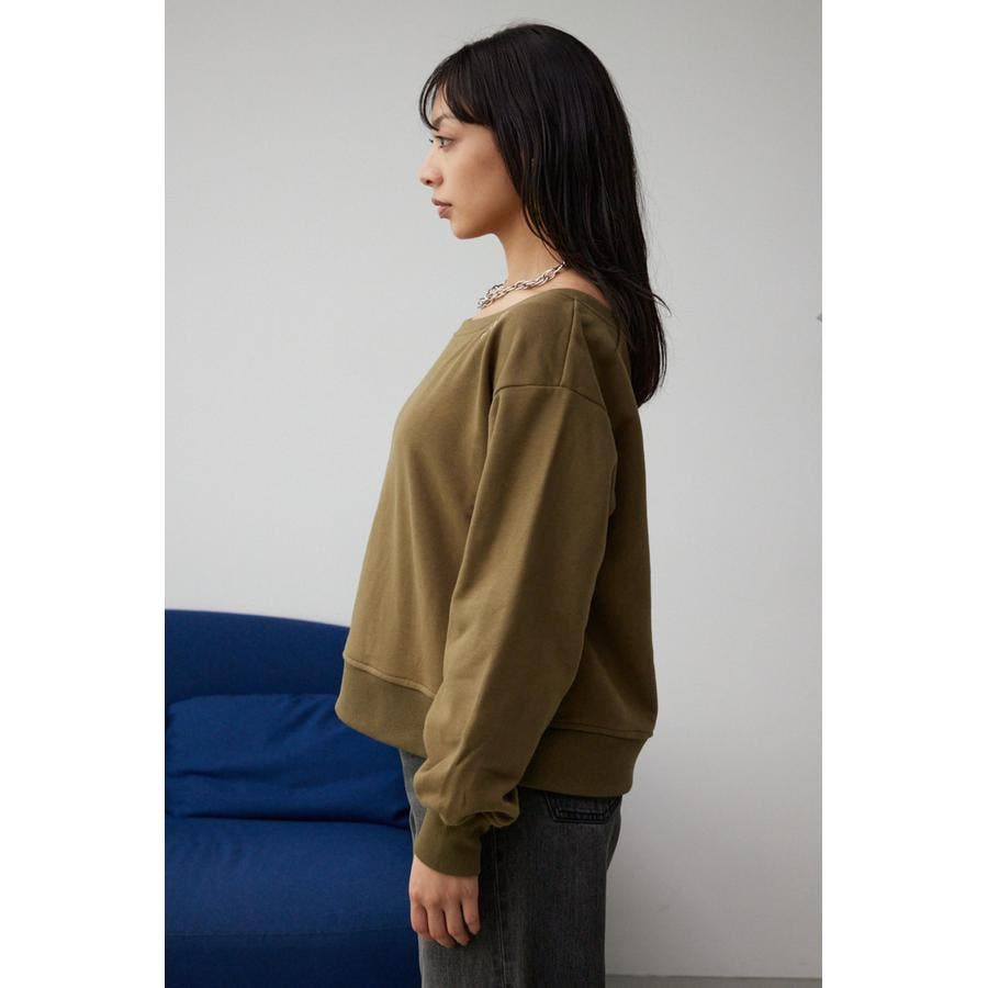 着丈はやや短めでネックデザインはオフショルダーで、肩を出して着ることもできる裏毛プルオーバーです。