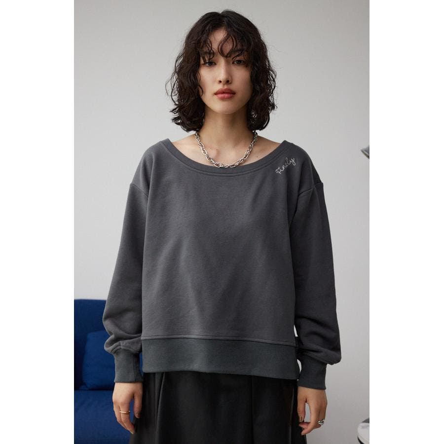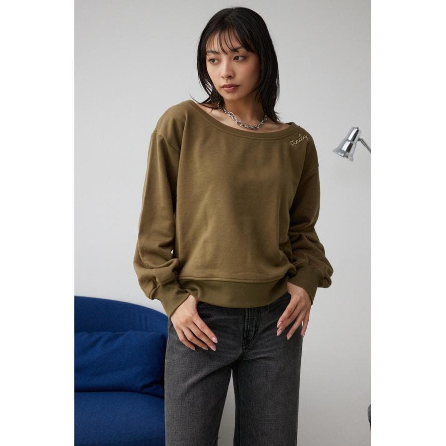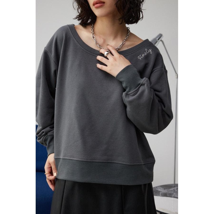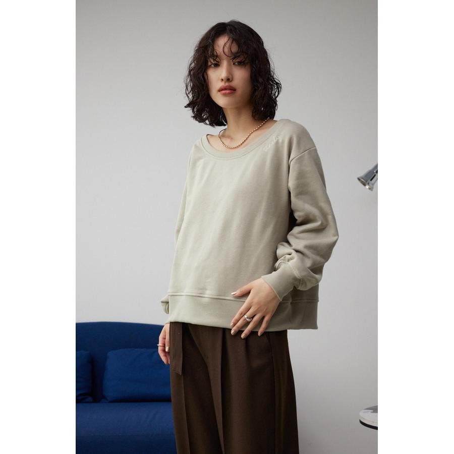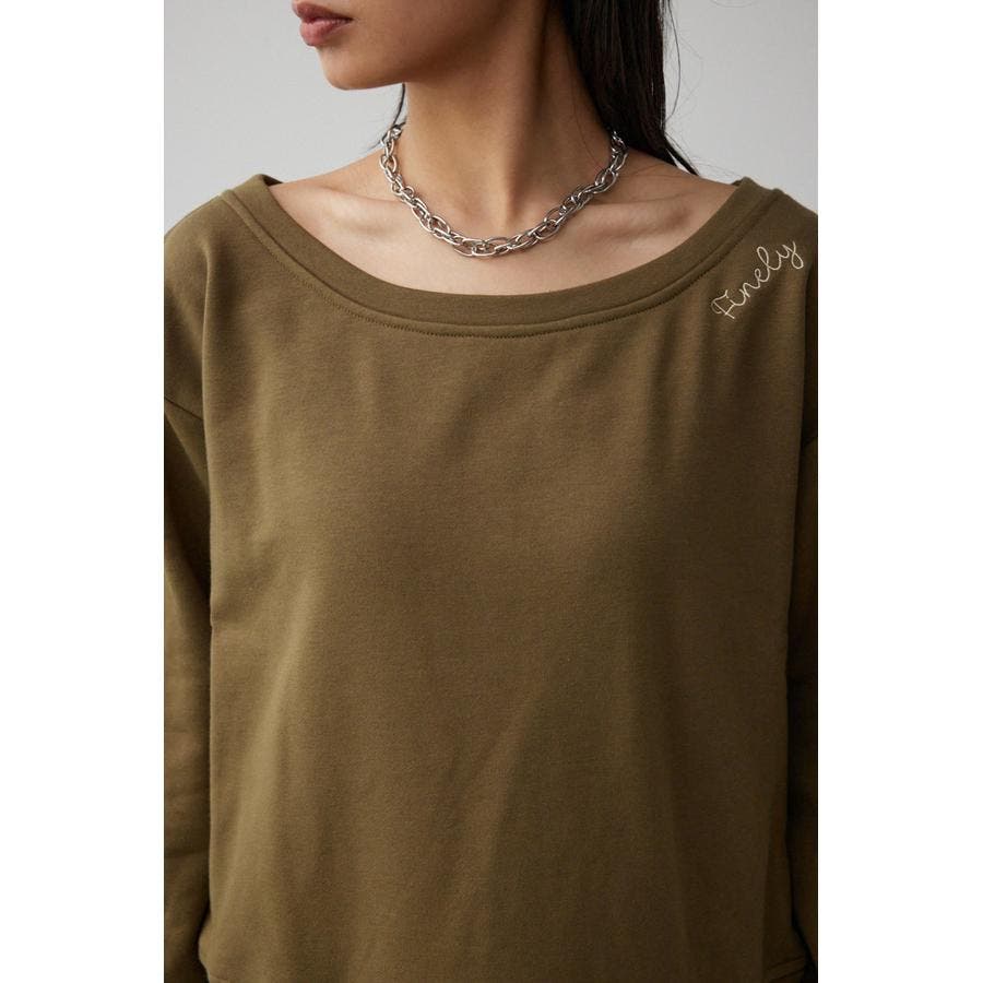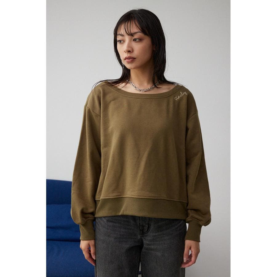 着丈はやや短めでネックデザインはオフショルダーで、肩を出して着ることもできる裏毛プルオーバーです。