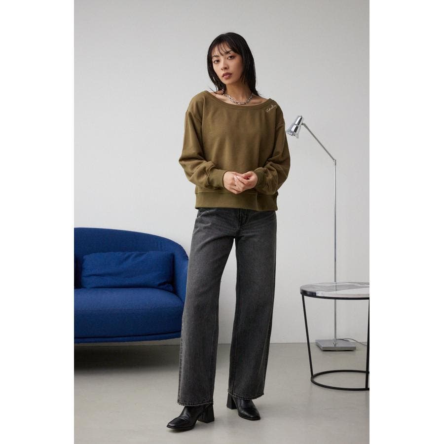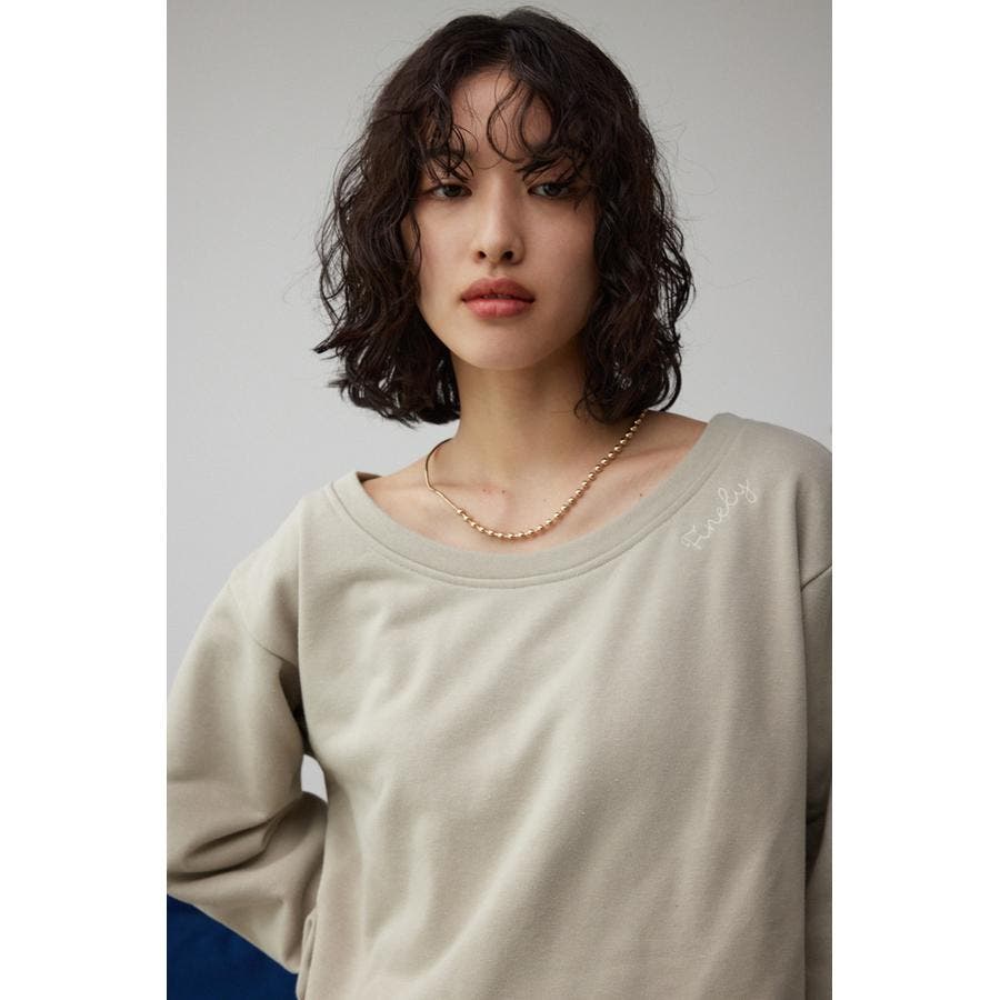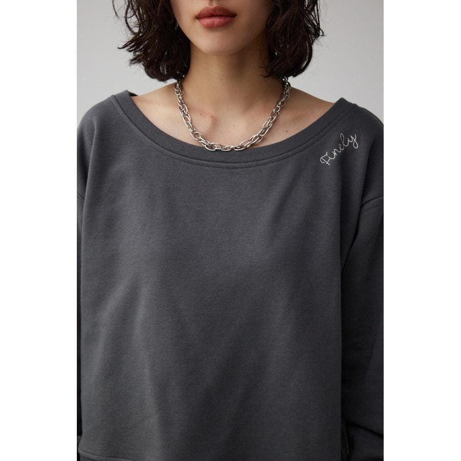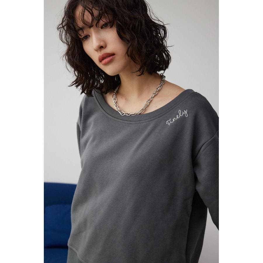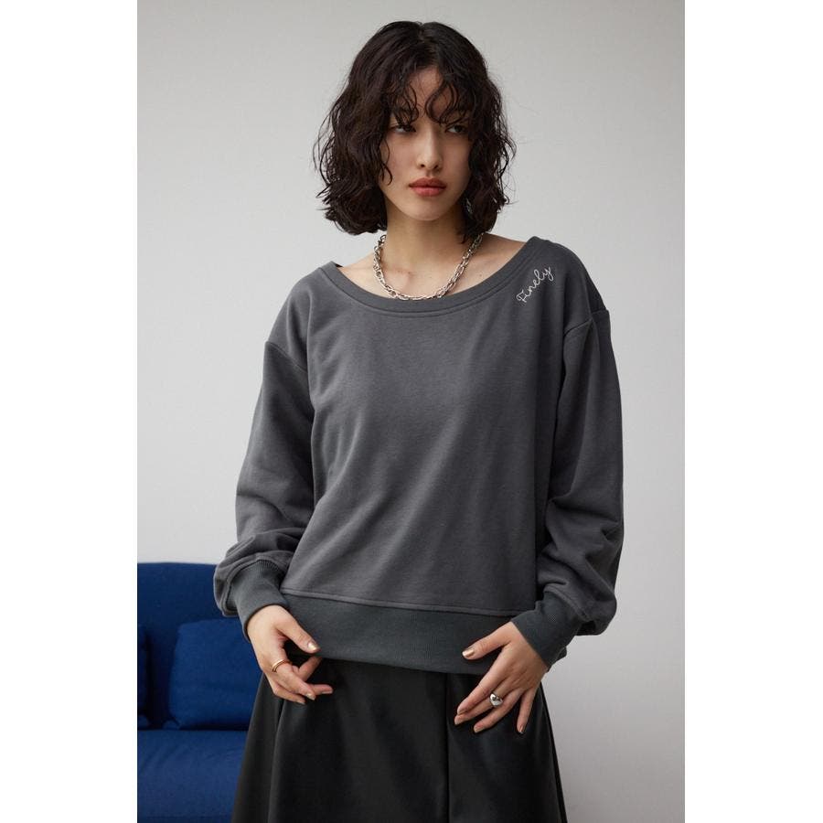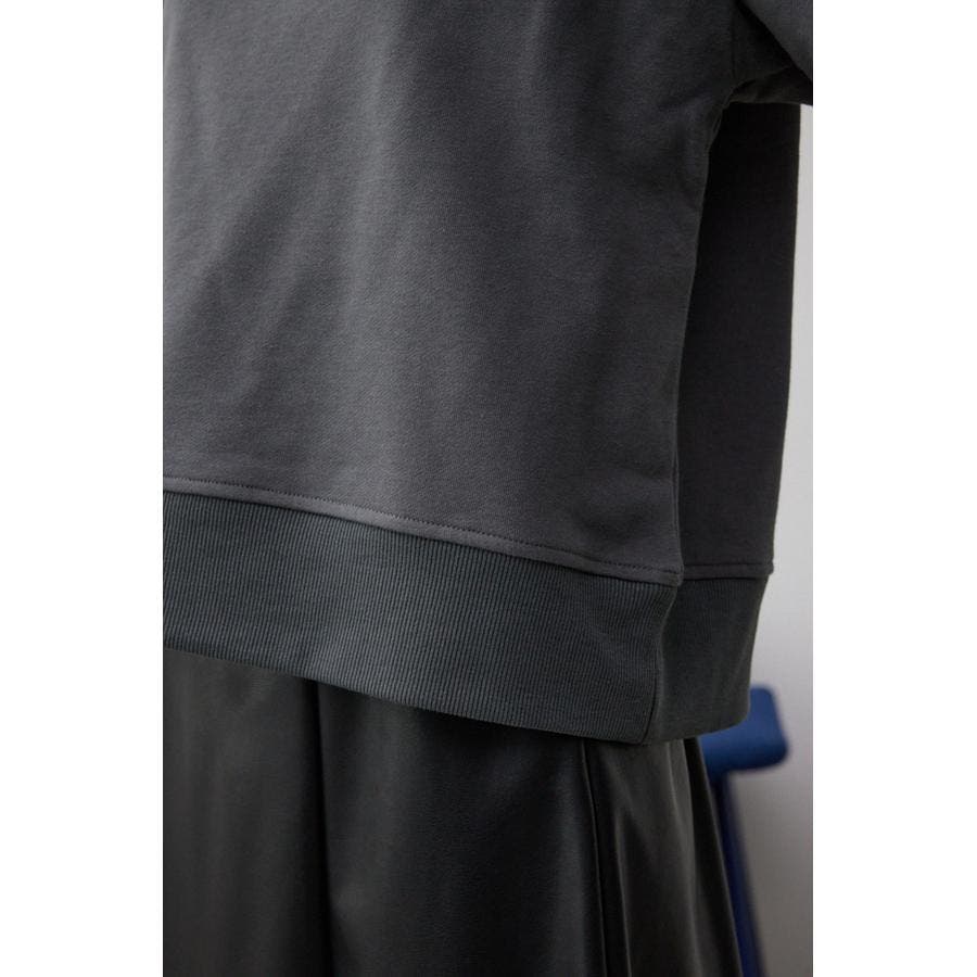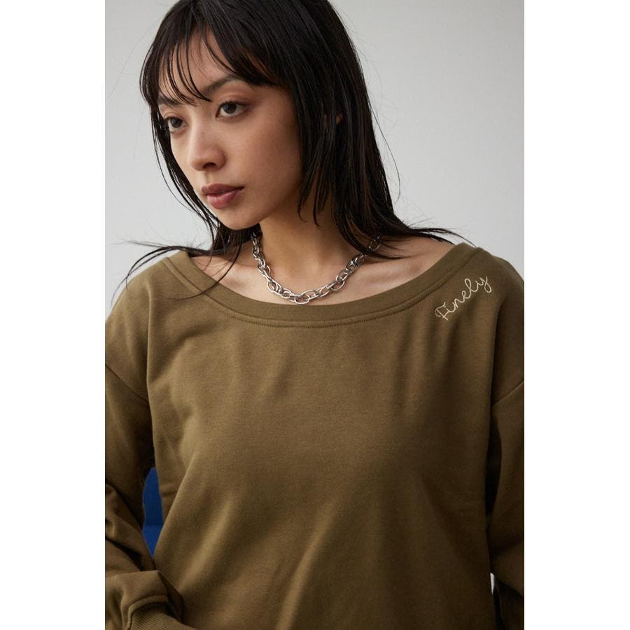 着丈はやや短めでネックデザインはオフショルダーで、肩を出して着ることもできる裏毛プルオーバーです。