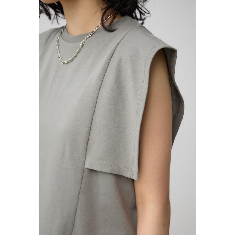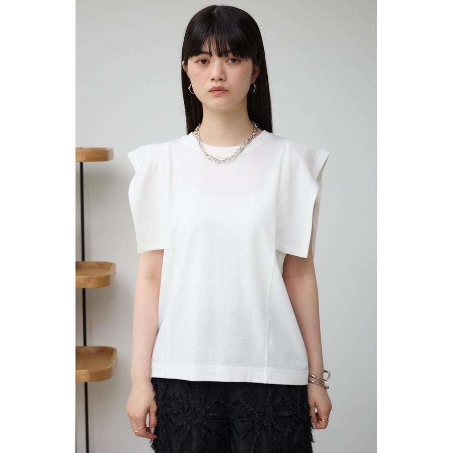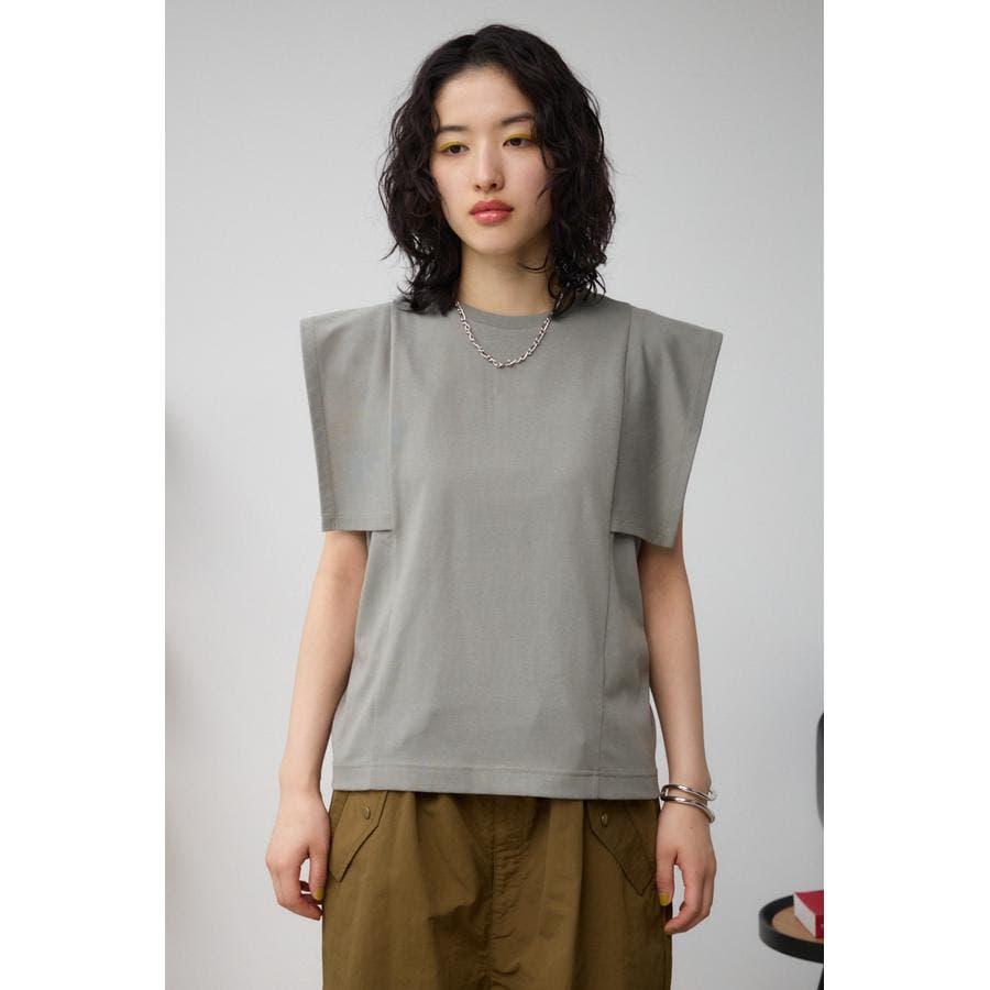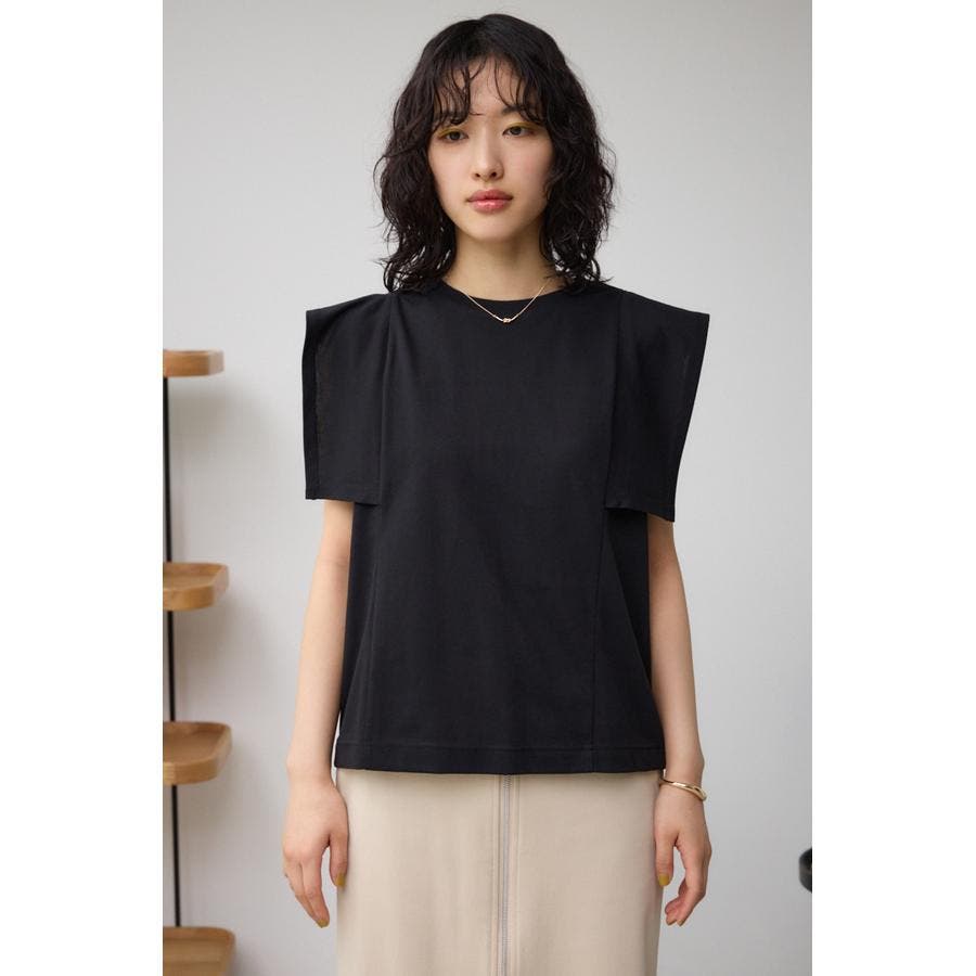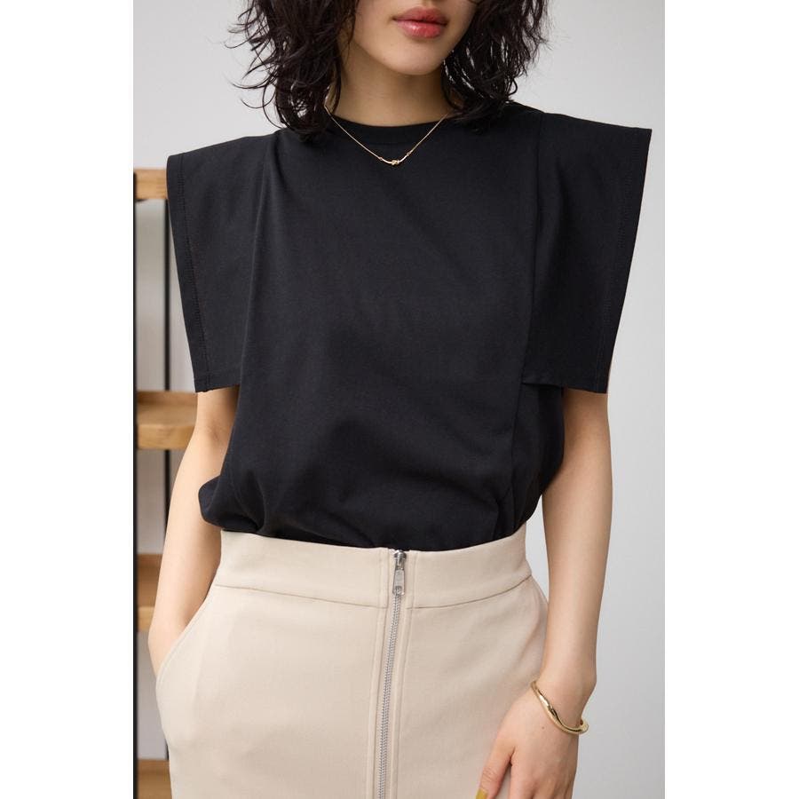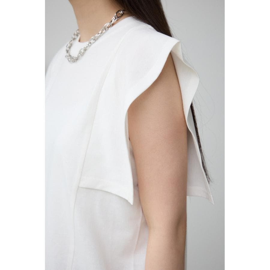 ■商品ディティール:袖部分に施したスクエアスリーブデザインが気になる肩回り、二の腕をすっきりと見せてくれるカットトップス。