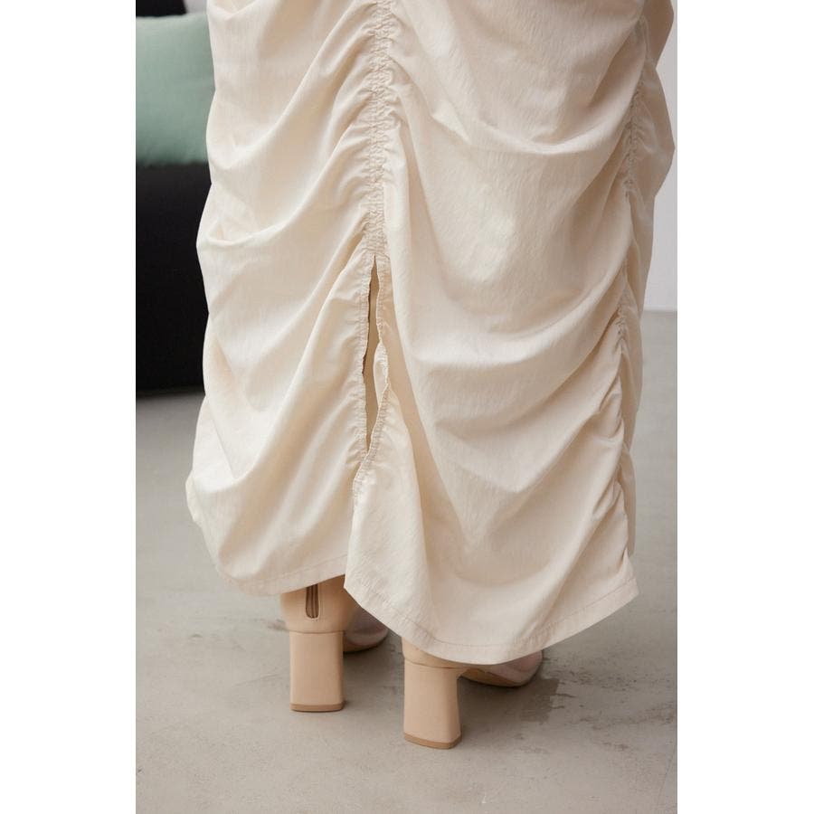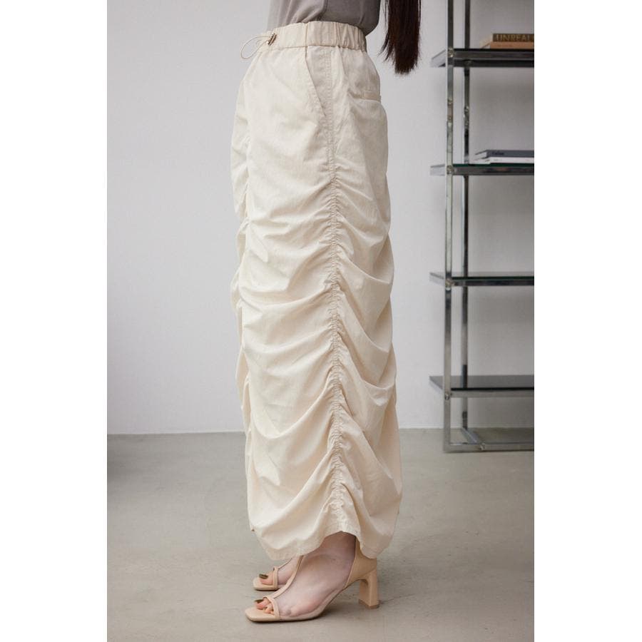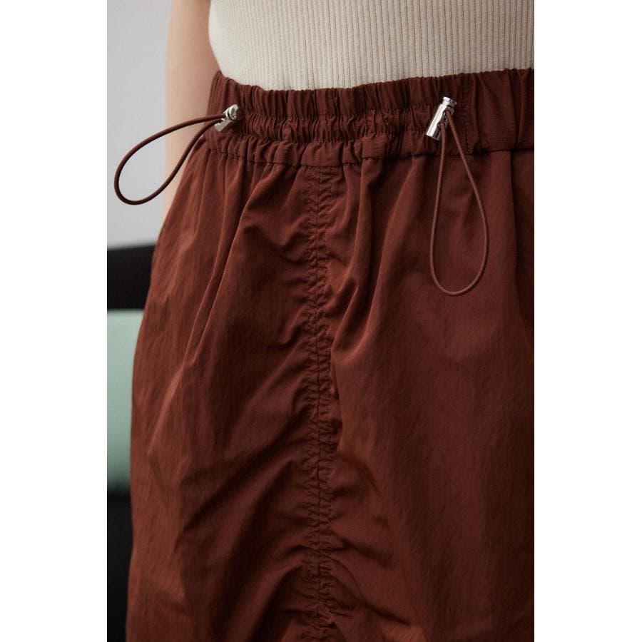 ■商品ディティール :サイドとフロント部分にたっぷりと入ったギャザーと、ウエスト部分のドローコードデザインがポイント。
