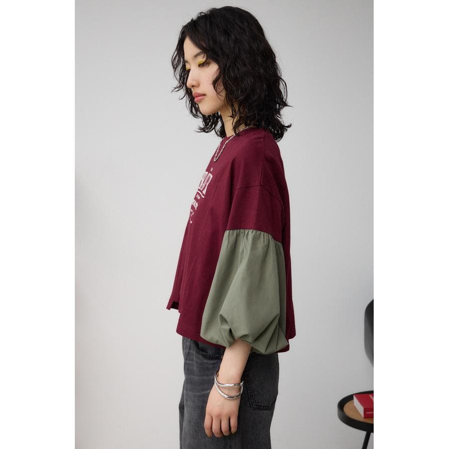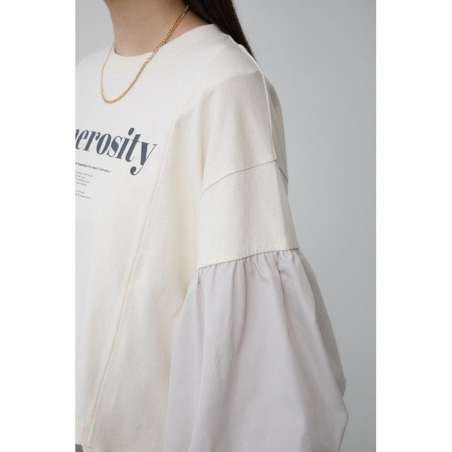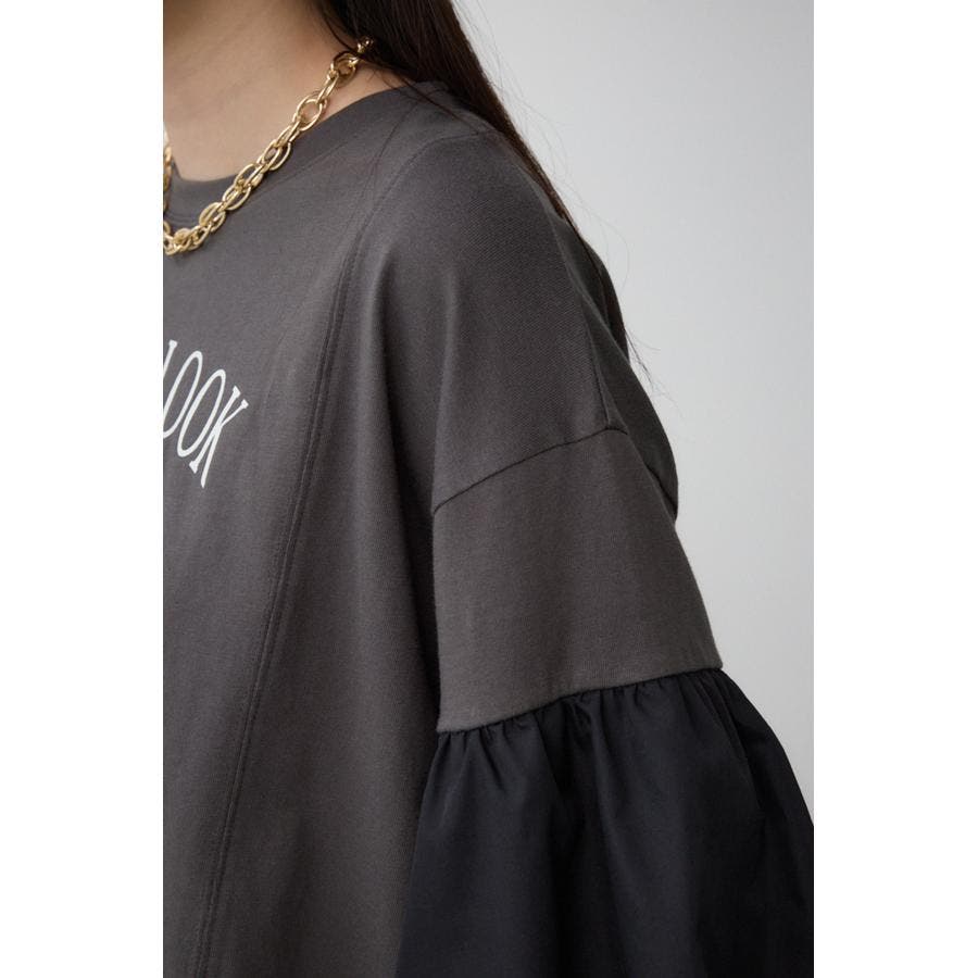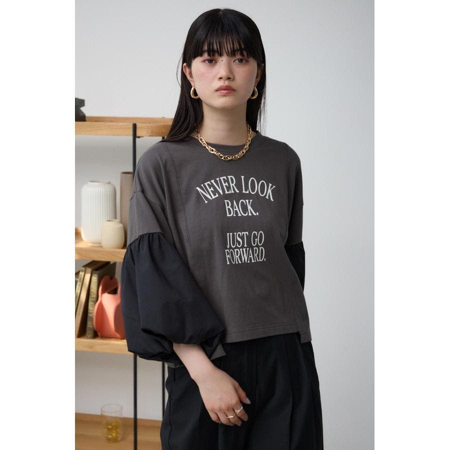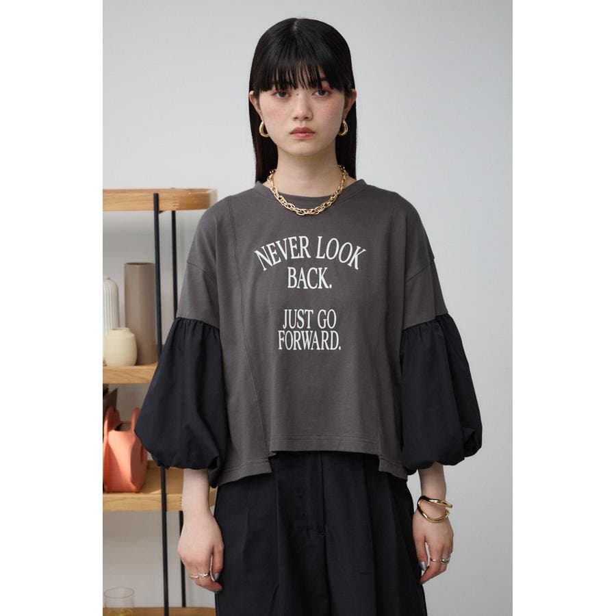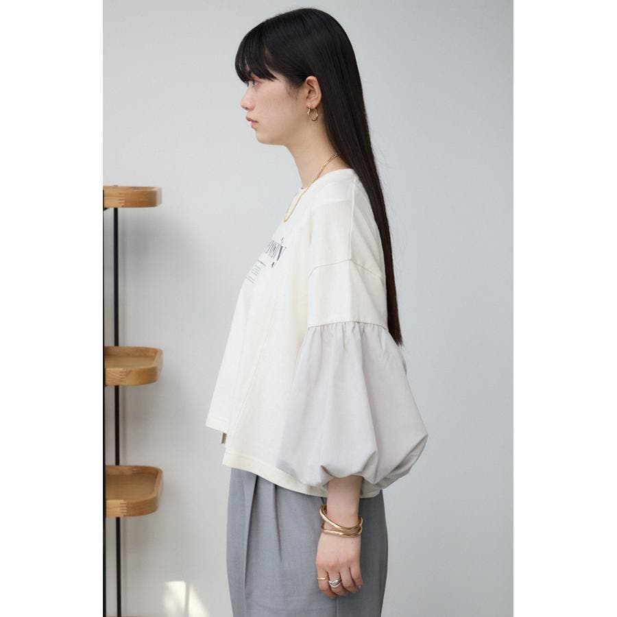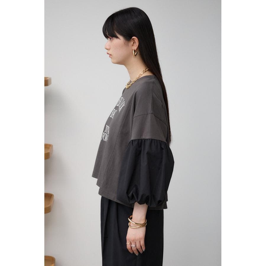 ■商品ディティール:リメイク風の切り替えと前身のロゴプリントに、異素材使いのふんわりとしたバルーンスリーブがポイントのデザインカットトップス。