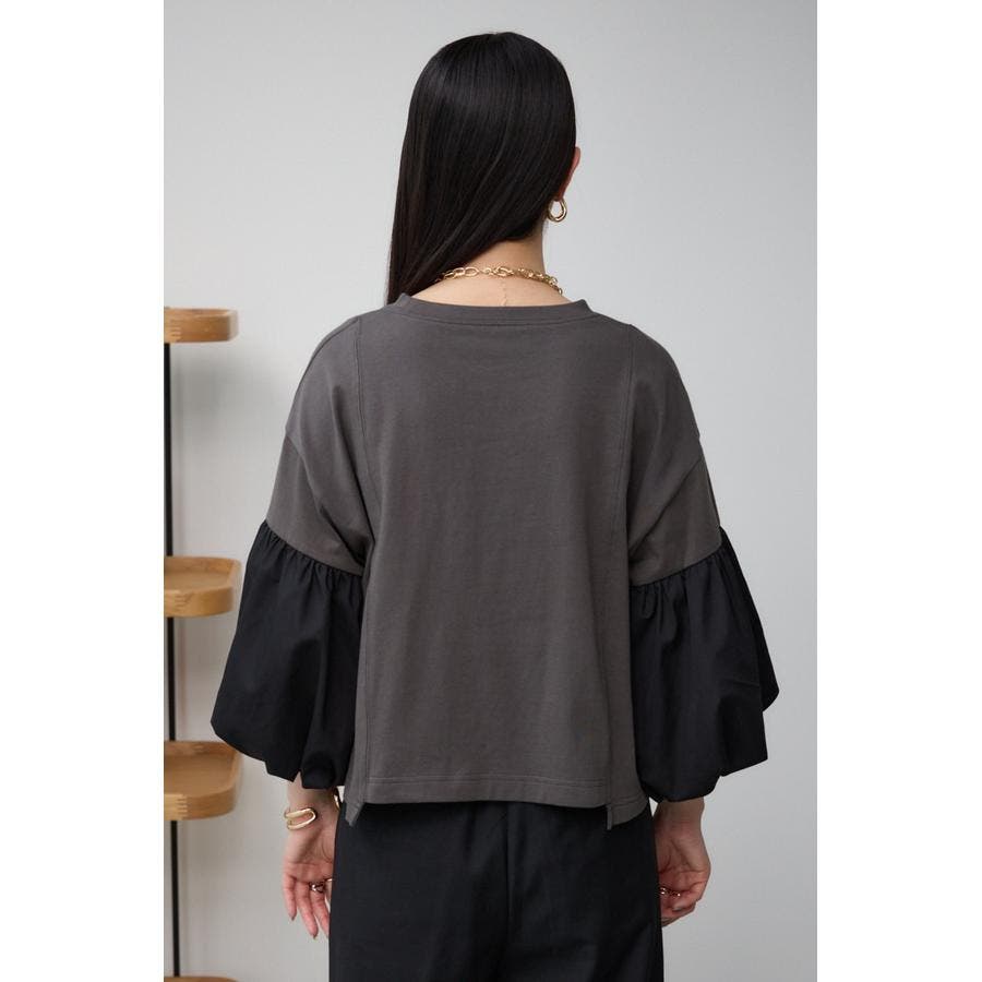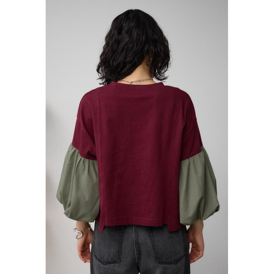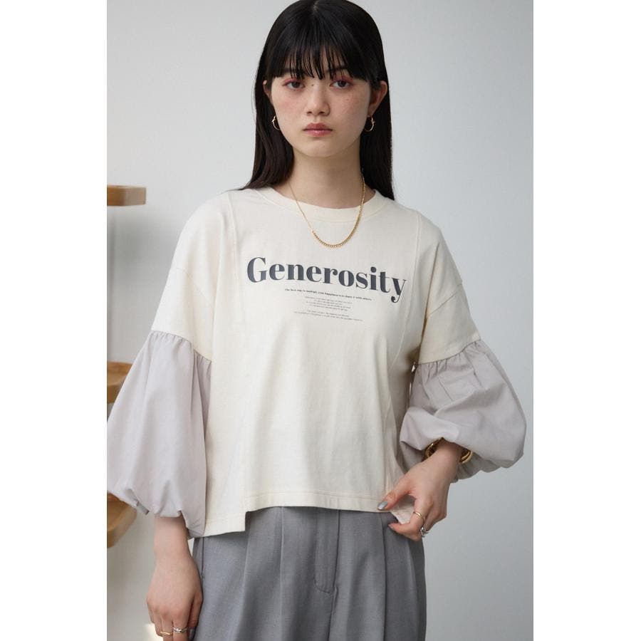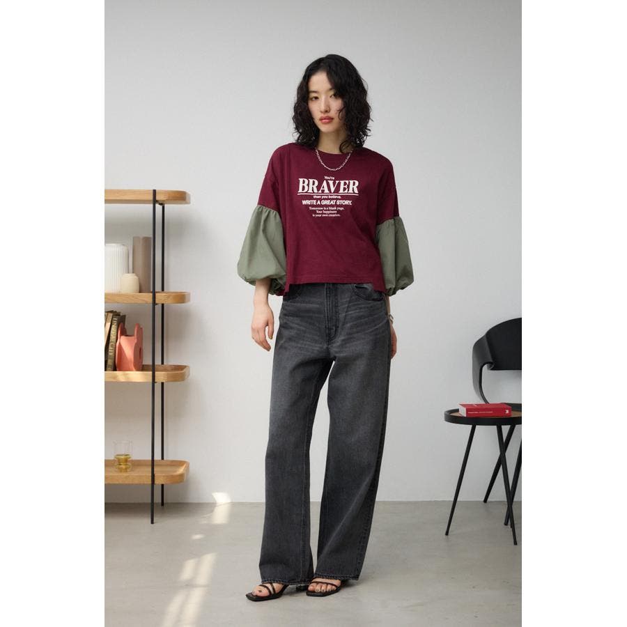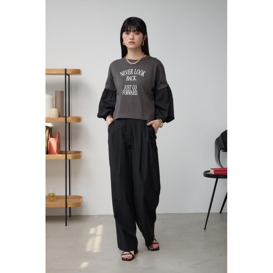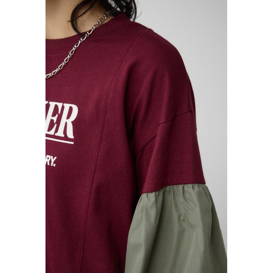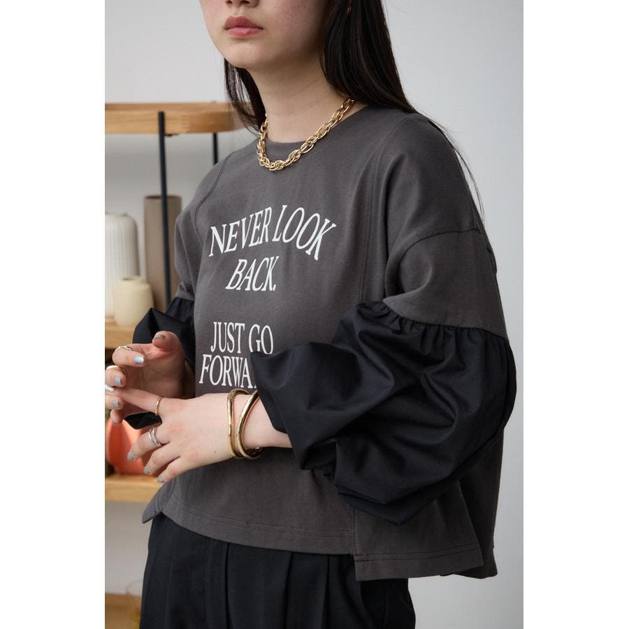 ■商品ディティール:リメイク風の切り替えと前身のロゴプリントに、異素材使いのふんわりとしたバルーンスリーブがポイントのデザインカットトップス。