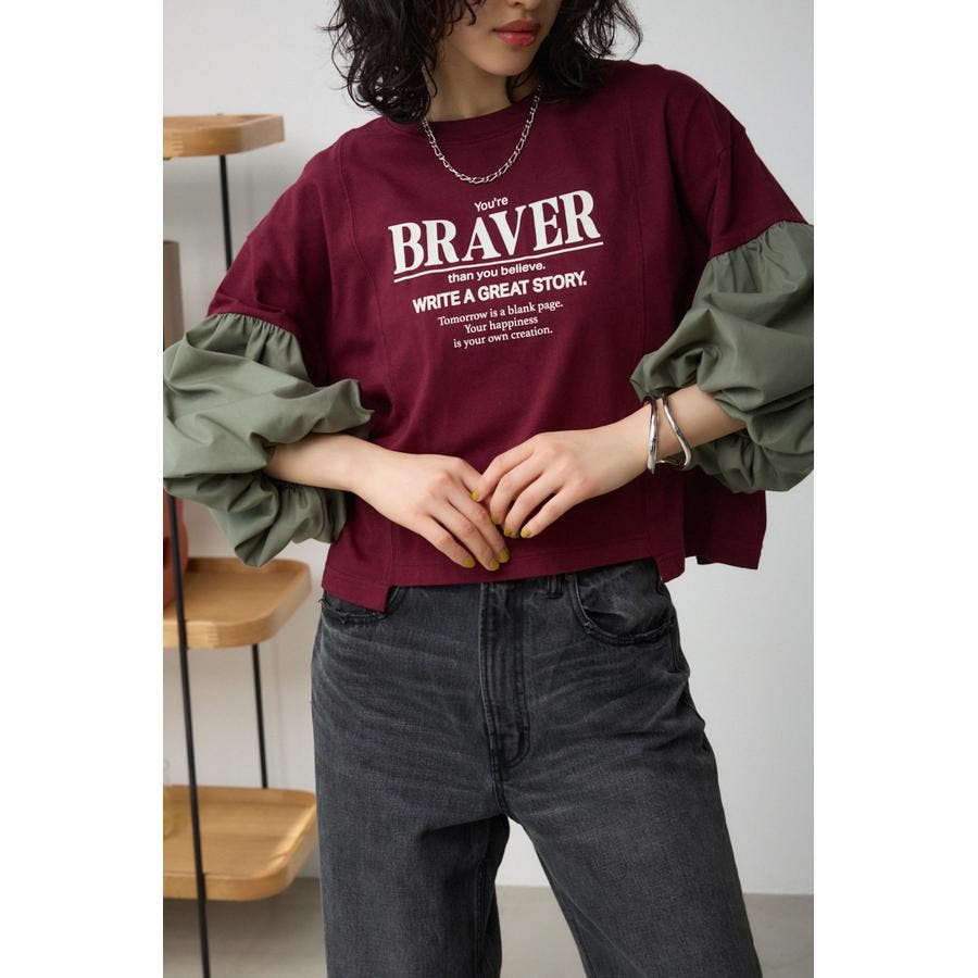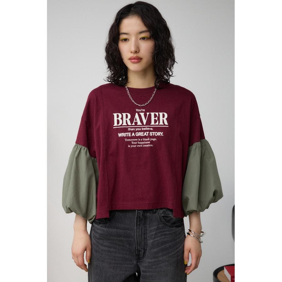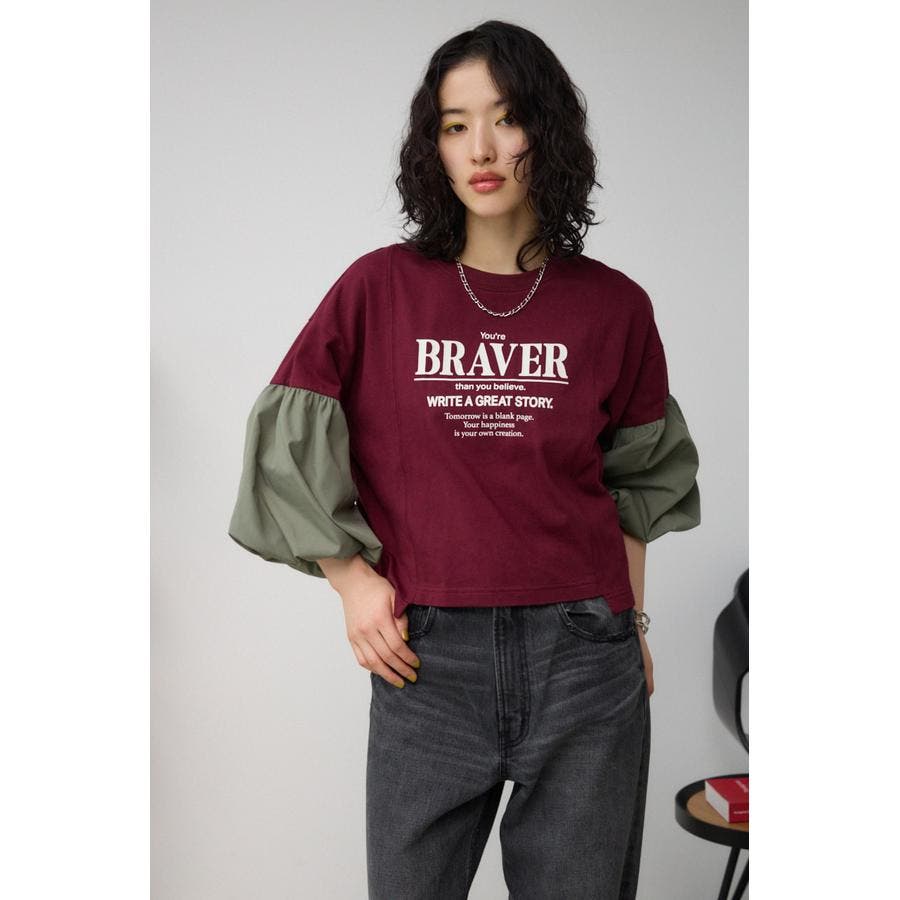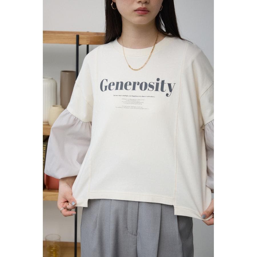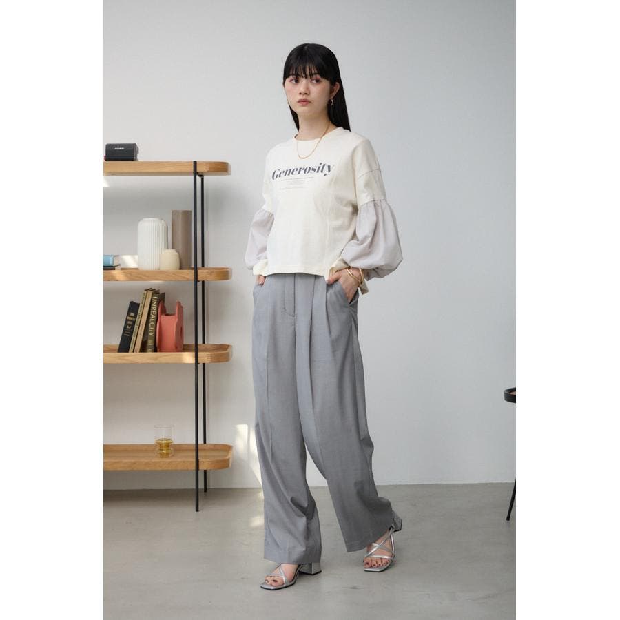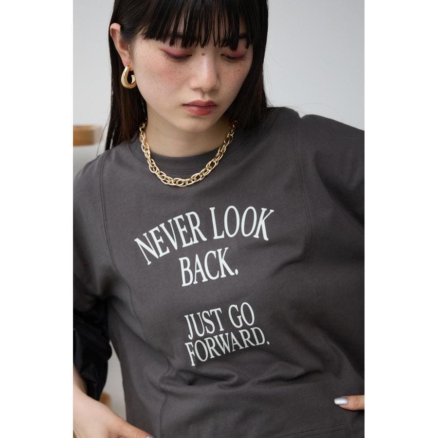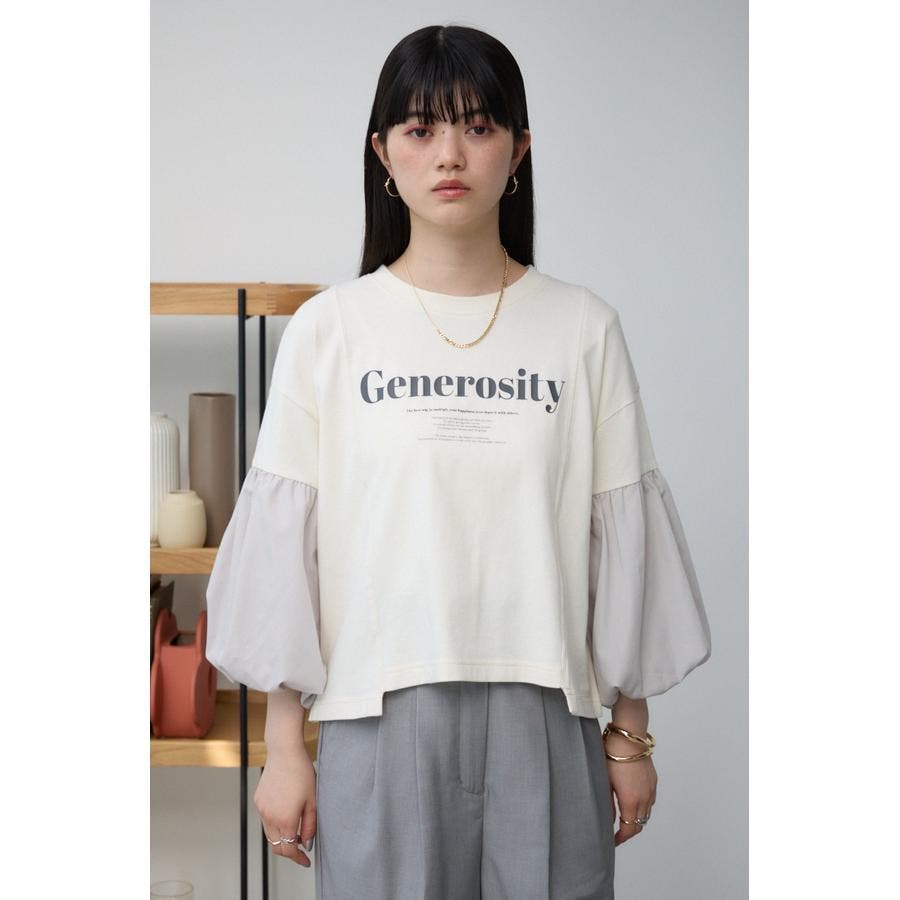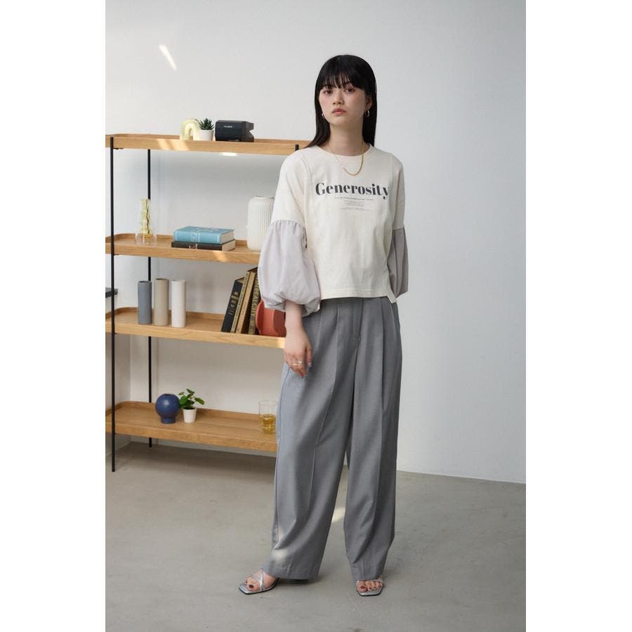 ■商品ディティール:リメイク風の切り替えと前身のロゴプリントに、異素材使いのふんわりとしたバルーンスリーブがポイントのデザインカットトップス。