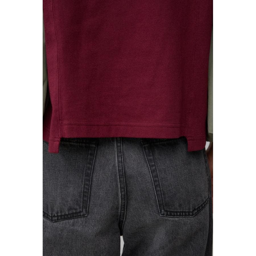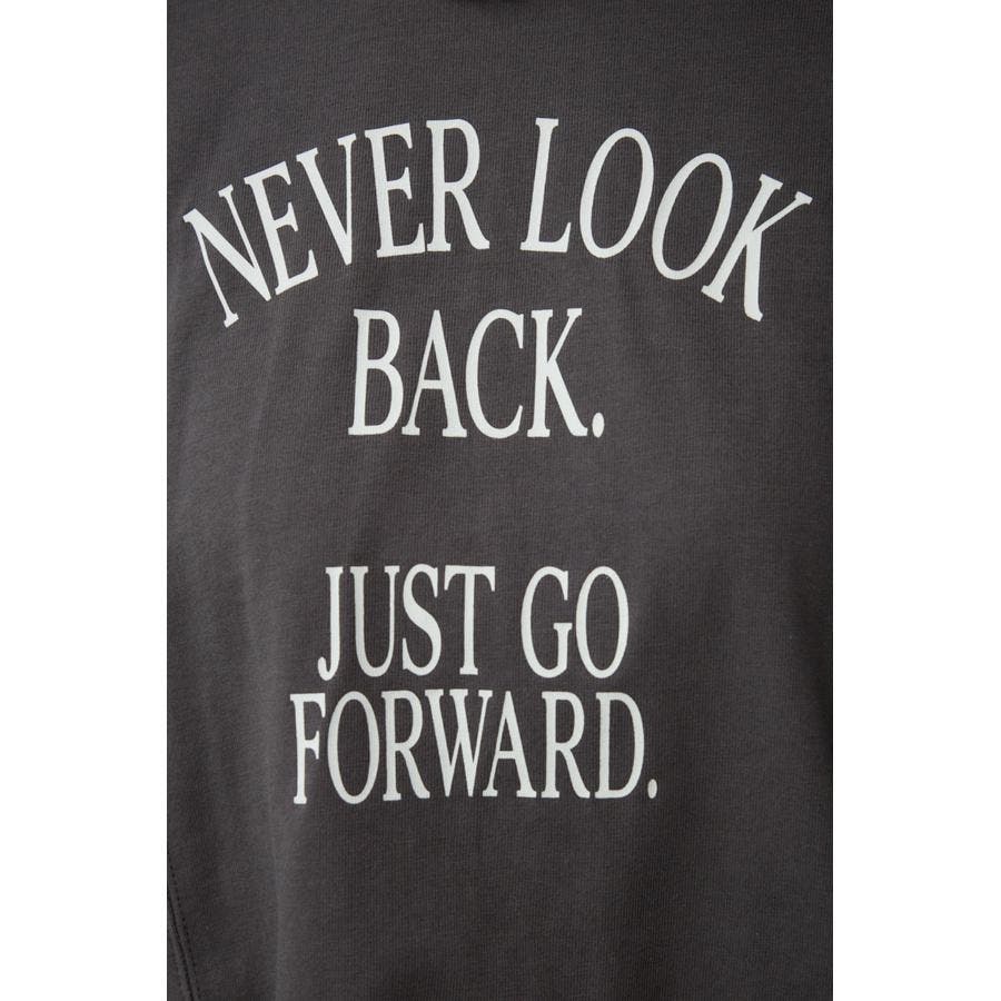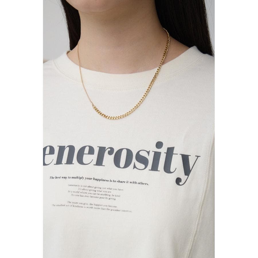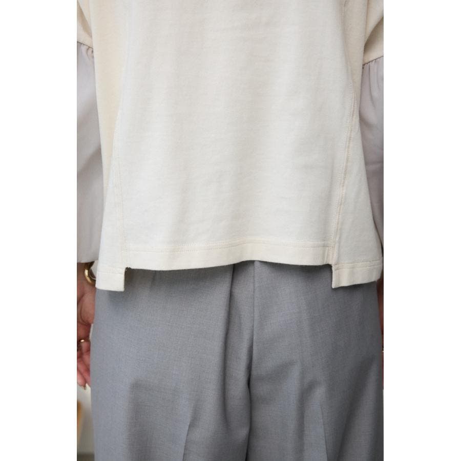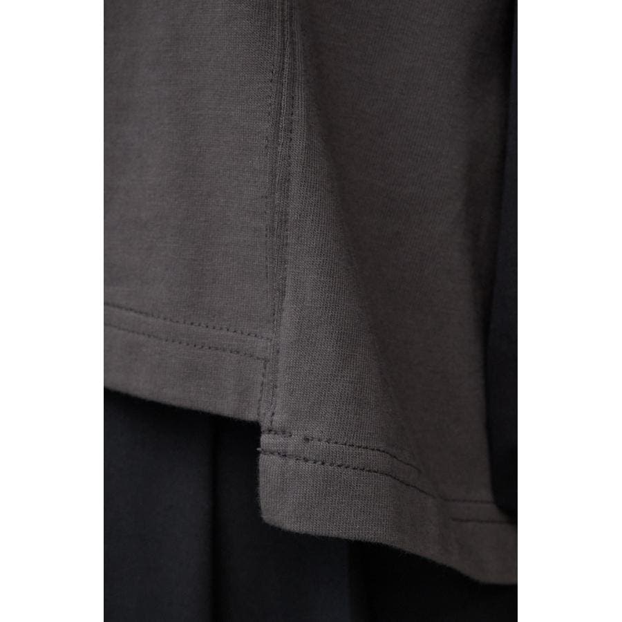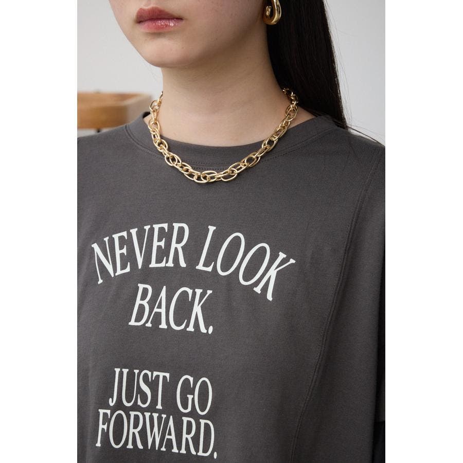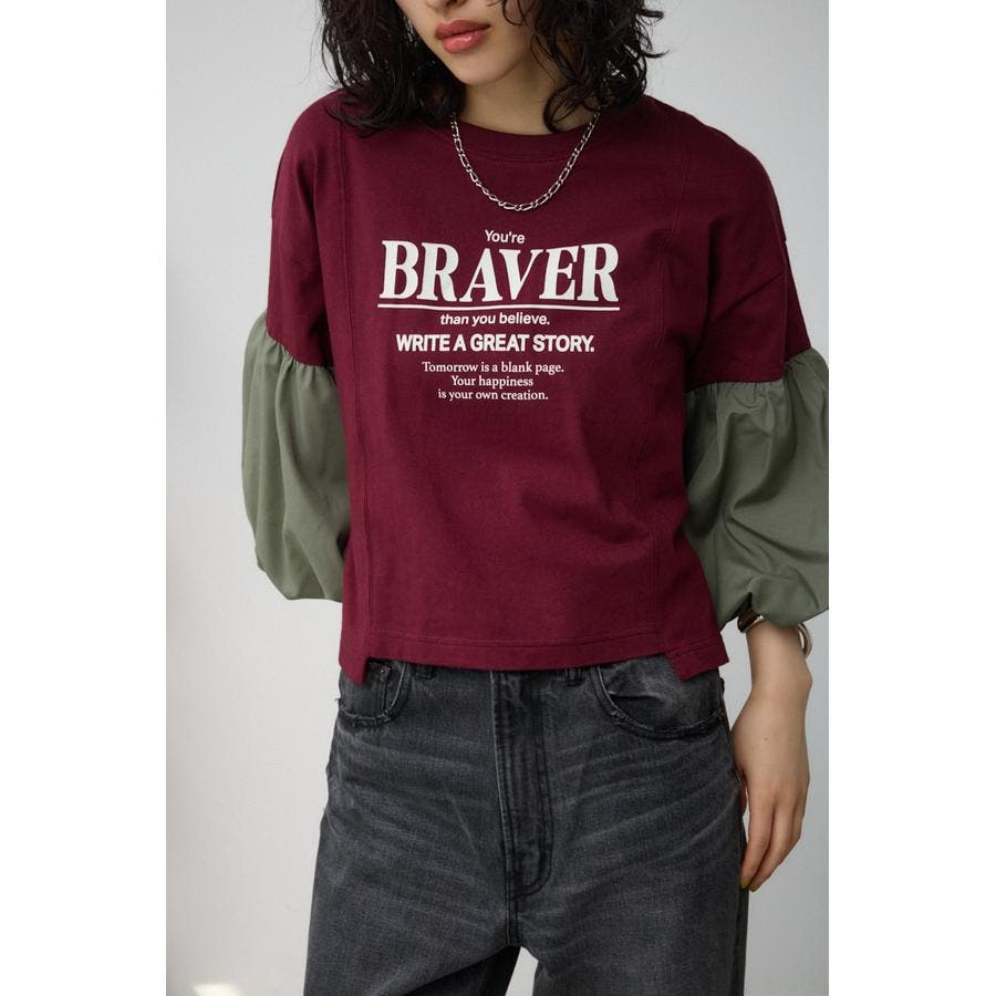 ■商品ディティール:リメイク風の切り替えと前身のロゴプリントに、異素材使いのふんわりとしたバルーンスリーブがポイントのデザインカットトップス。