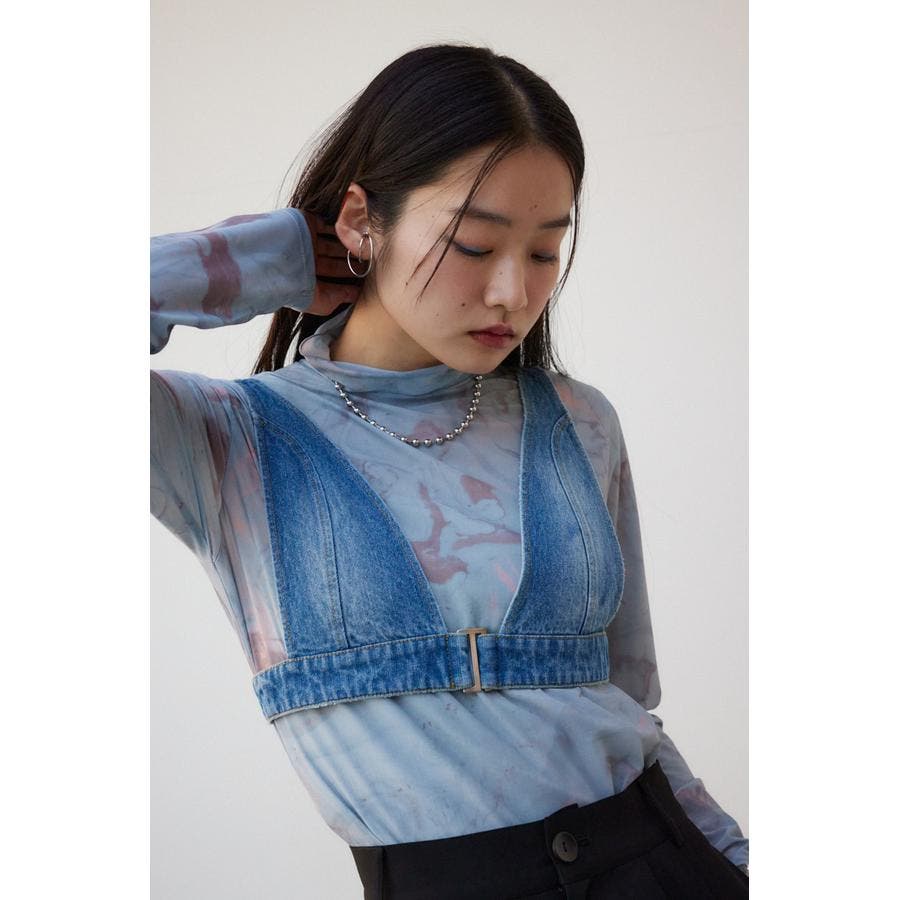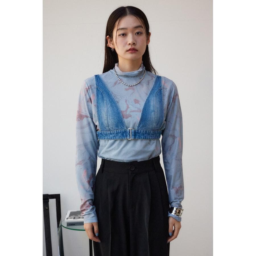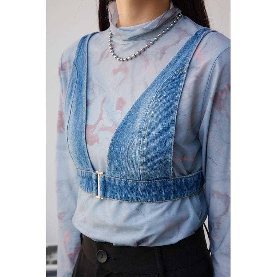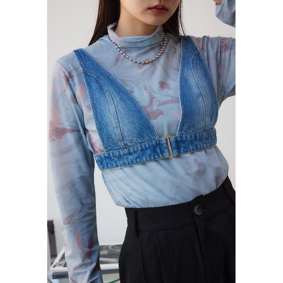 ・程よい生地に肉感があるデニムを使用し、加工を施すことでビンテージ感を演出したデニムビスチェです。