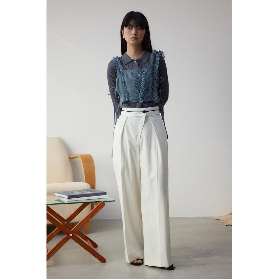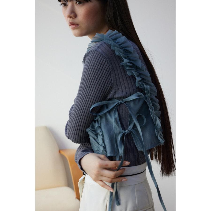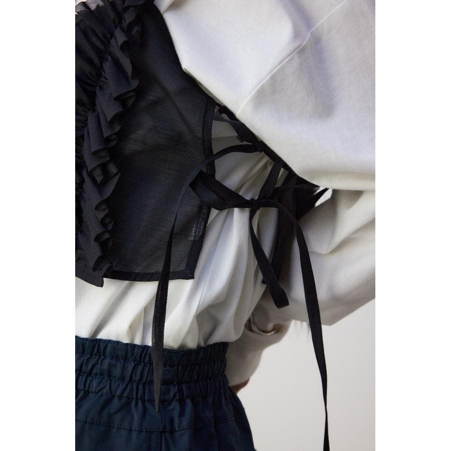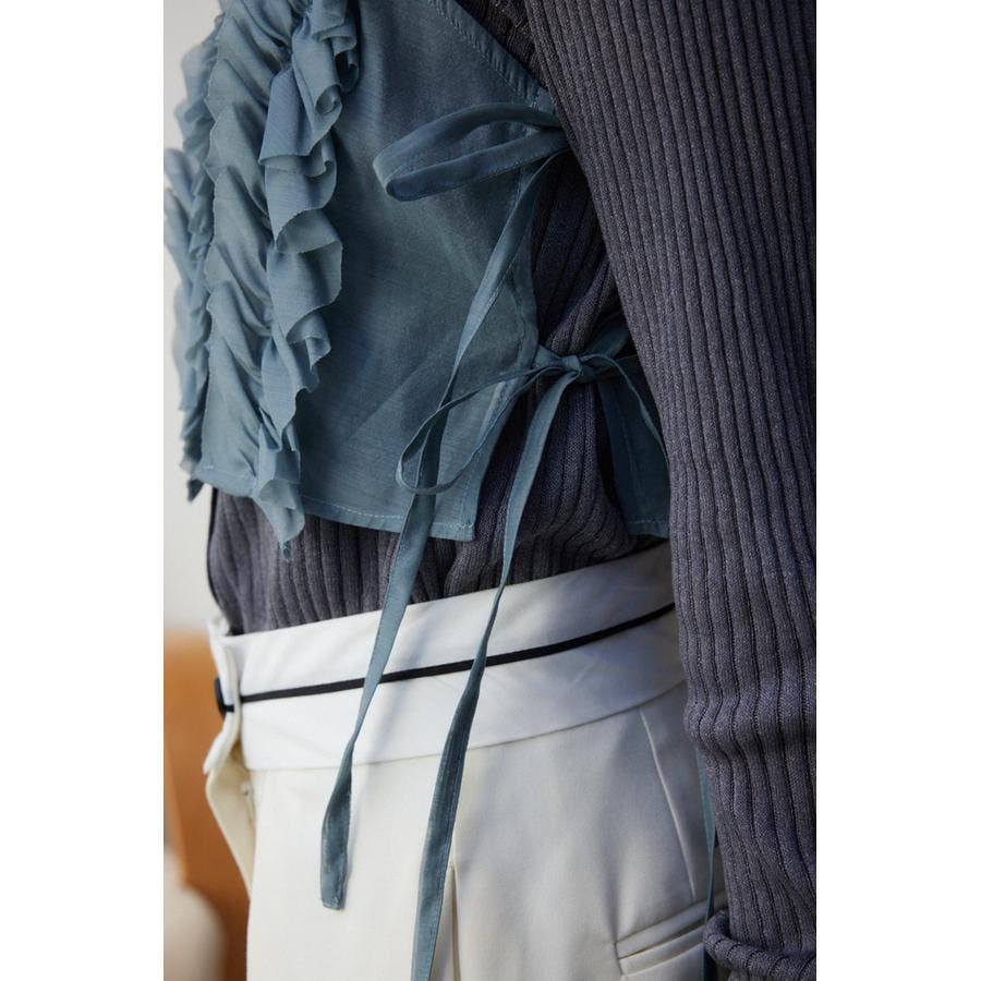 ・両脇を結びデザインにすることで、薄手のインナーからニット、スウェットまで幅広いアイテムとレイヤードして頂けます。