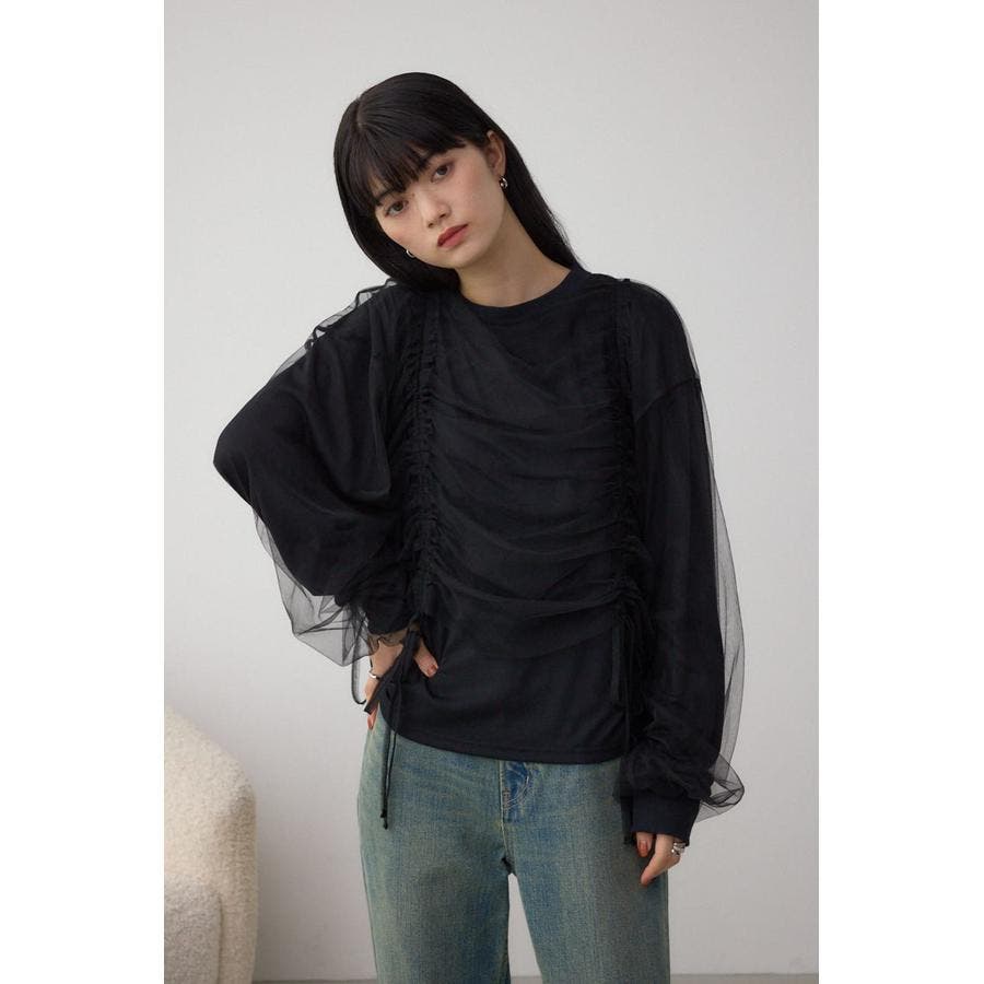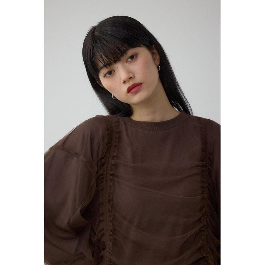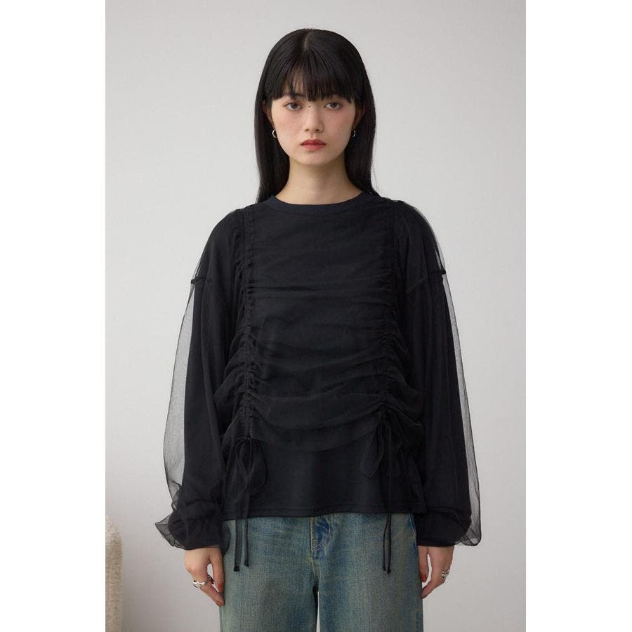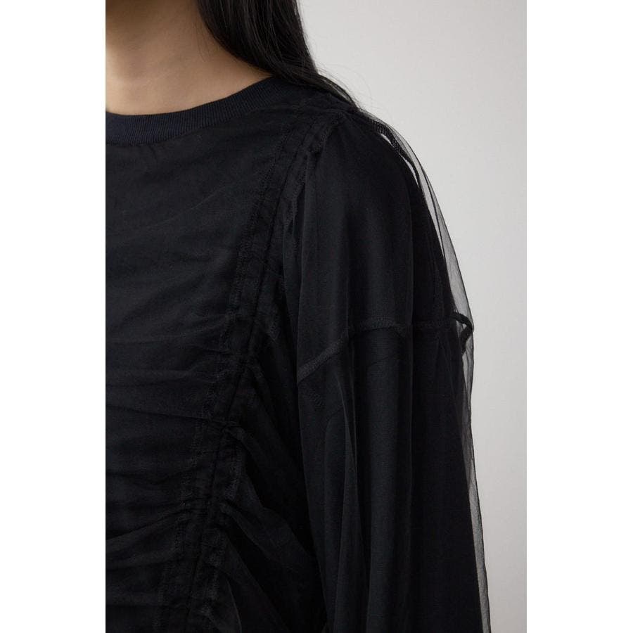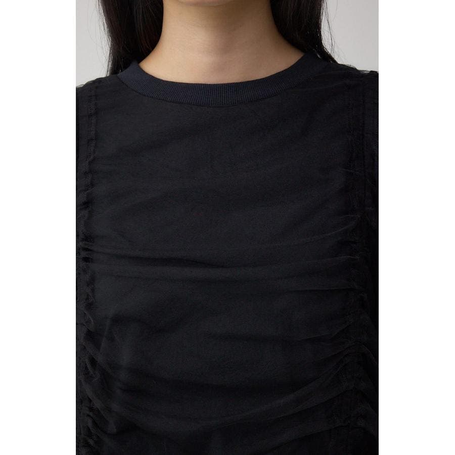 女性らしいギャザーを施したチュールドッキングした1枚で着映え抜群のトップスです。