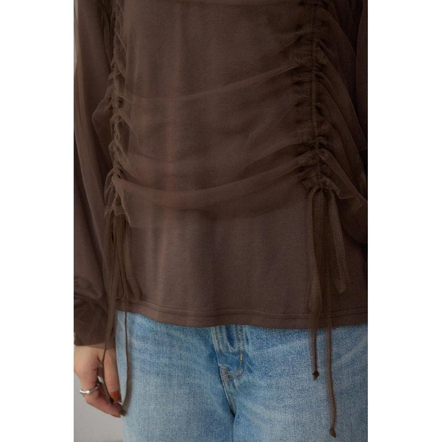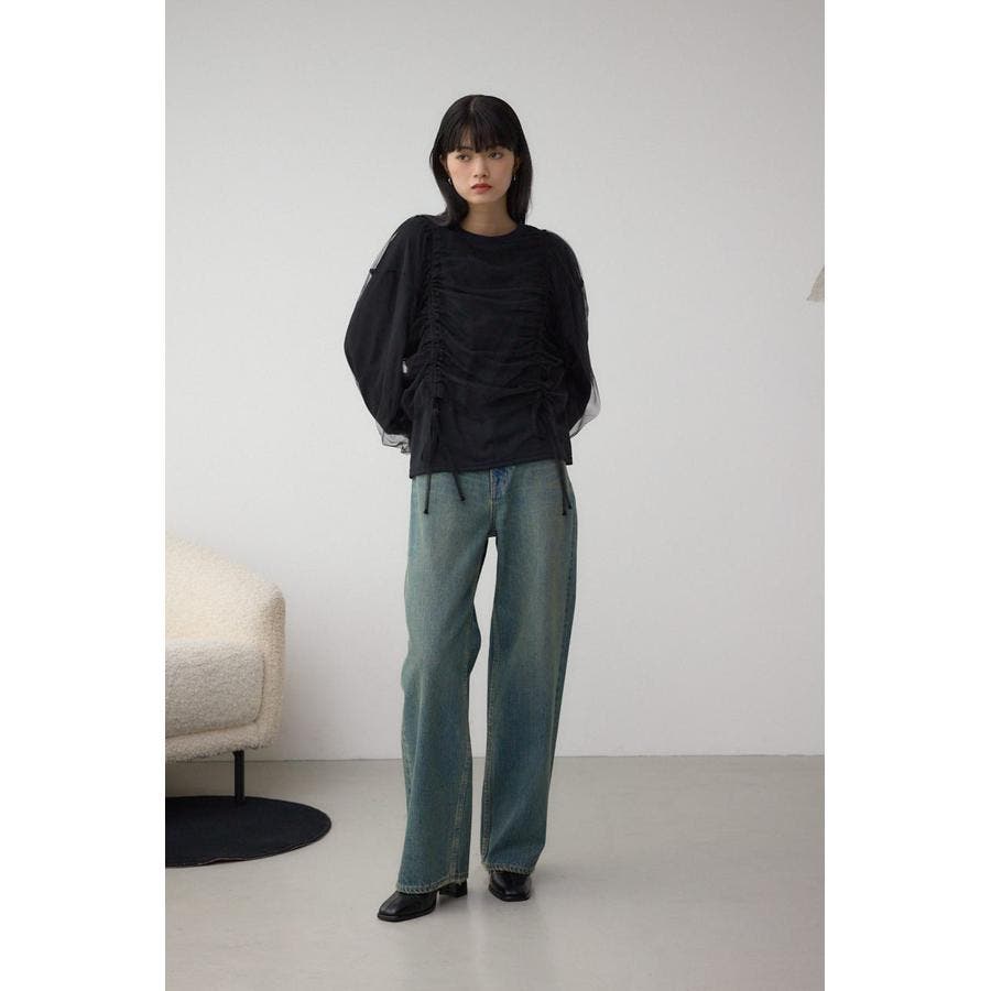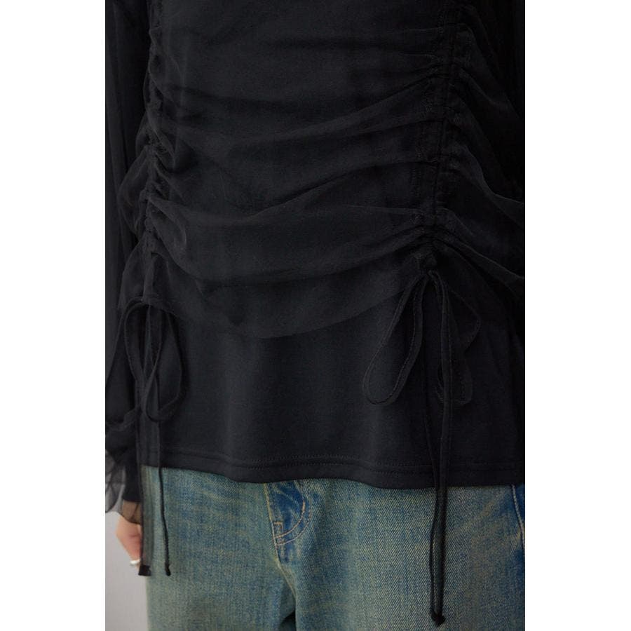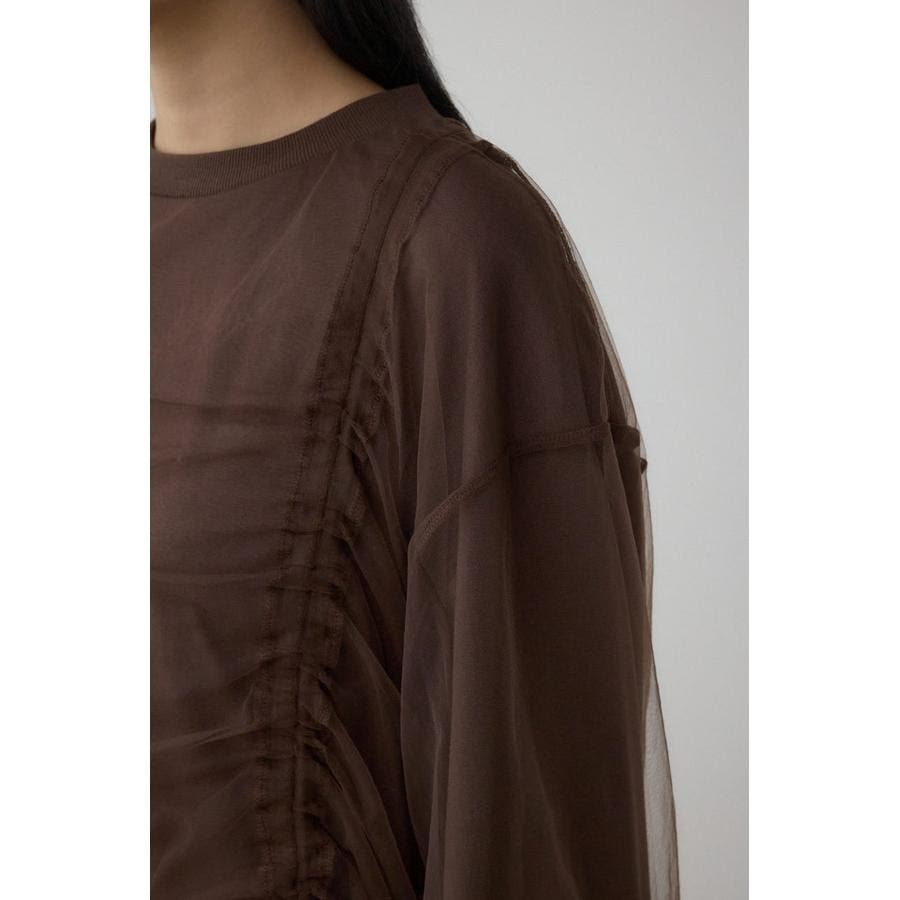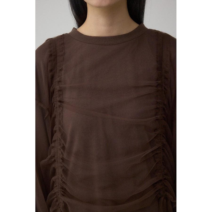 女性らしいギャザーを施したチュールドッキングした1枚で着映え抜群のトップスです。