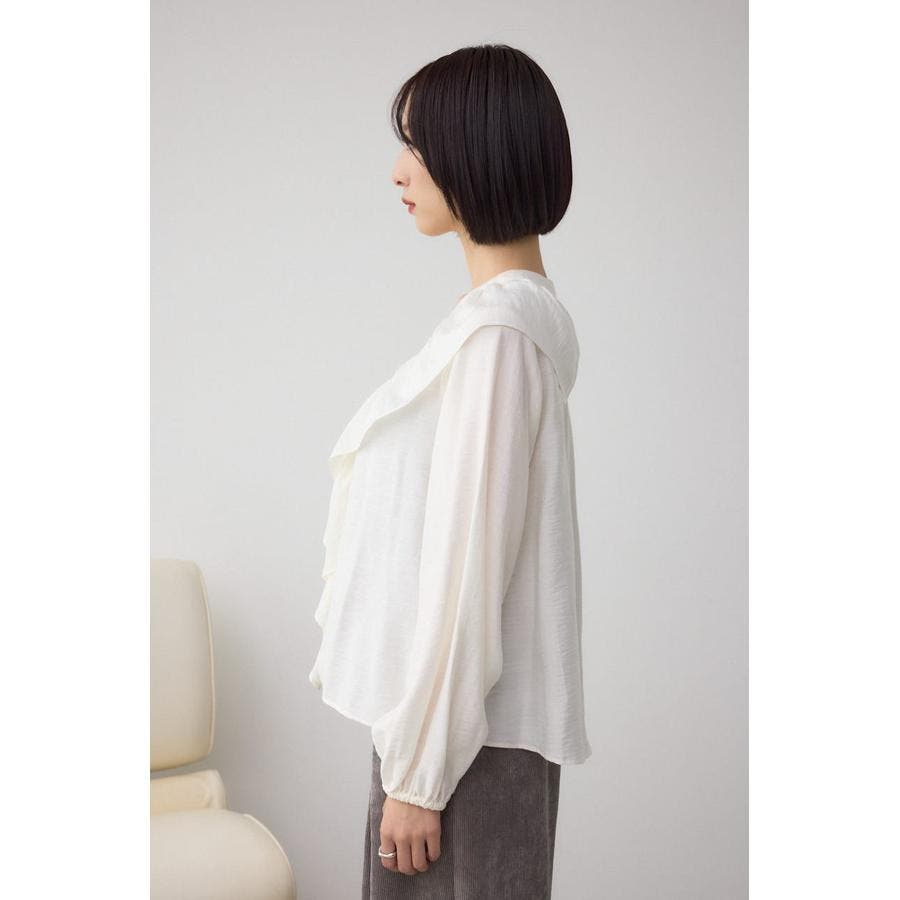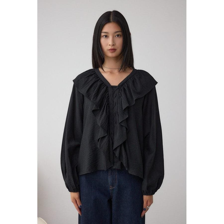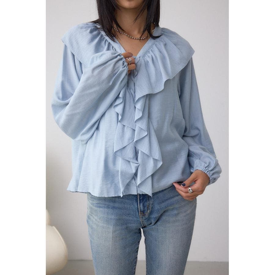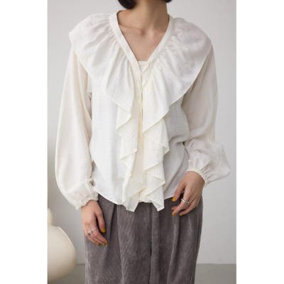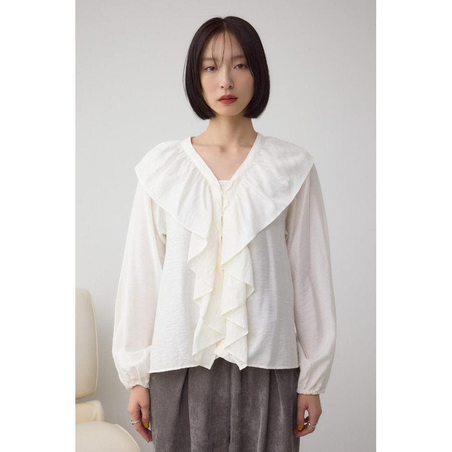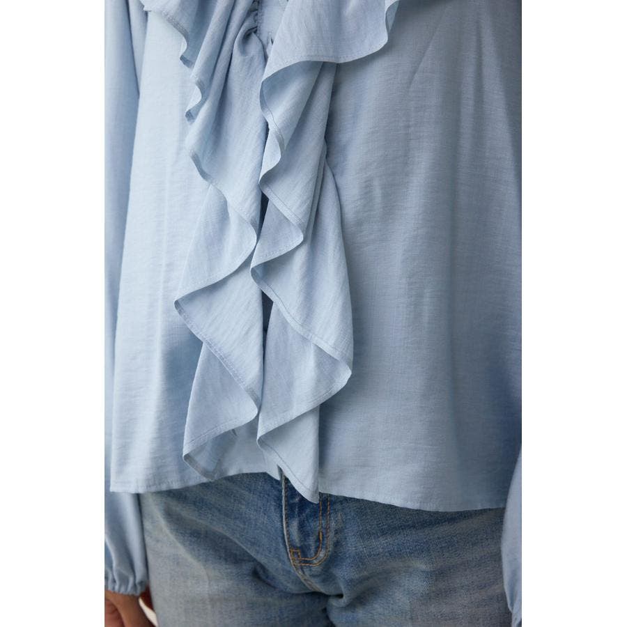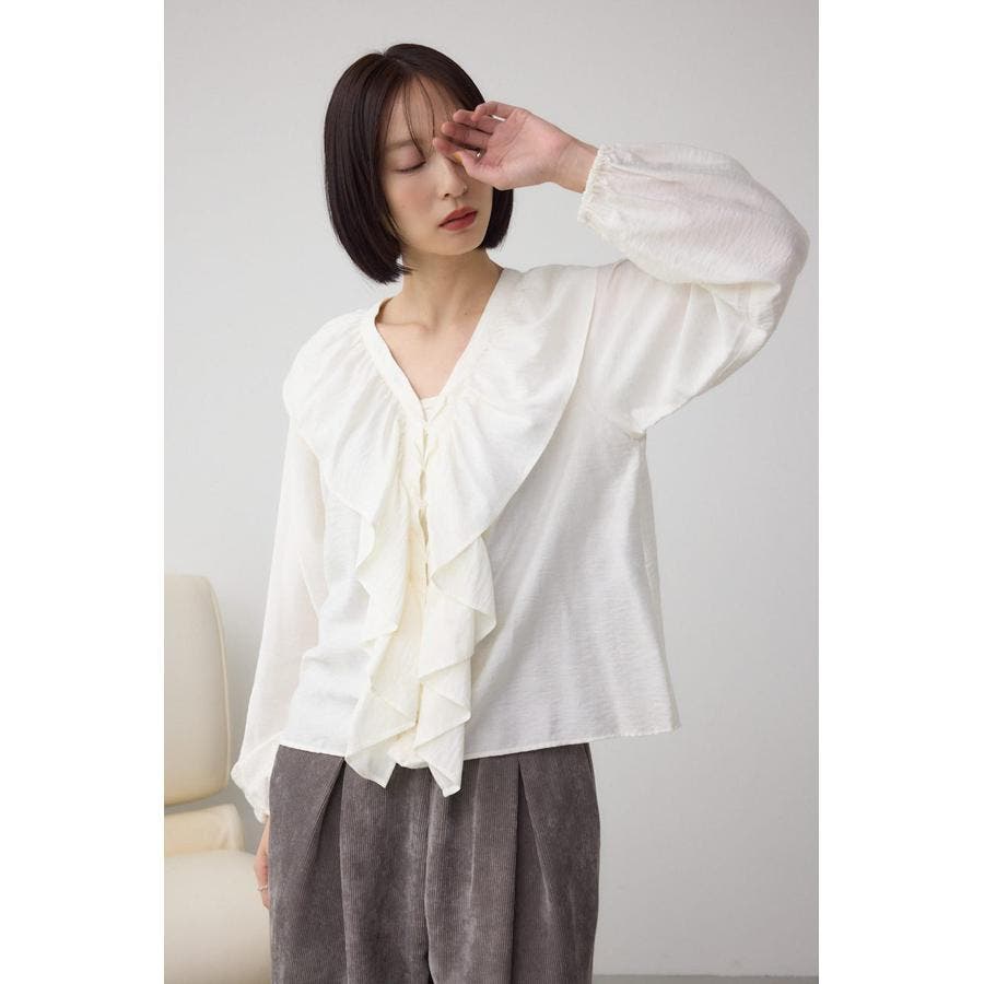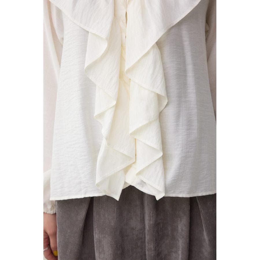 大き目のフリルディテールで、女性らしさを引き立てるラッフルブラウス。