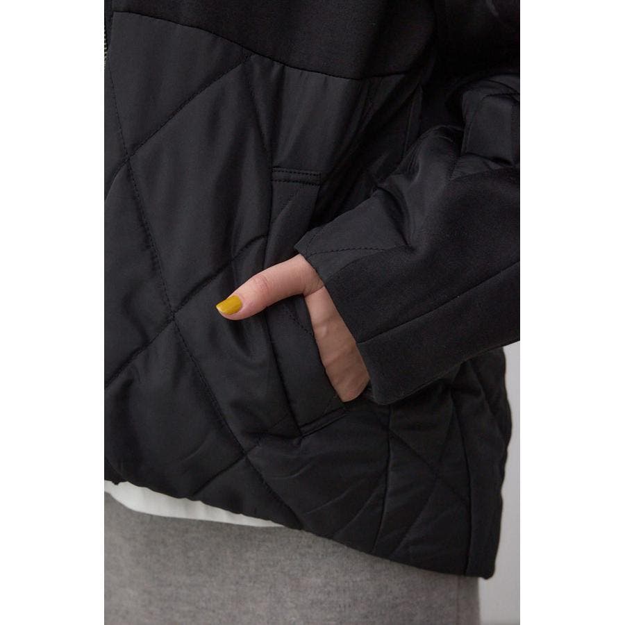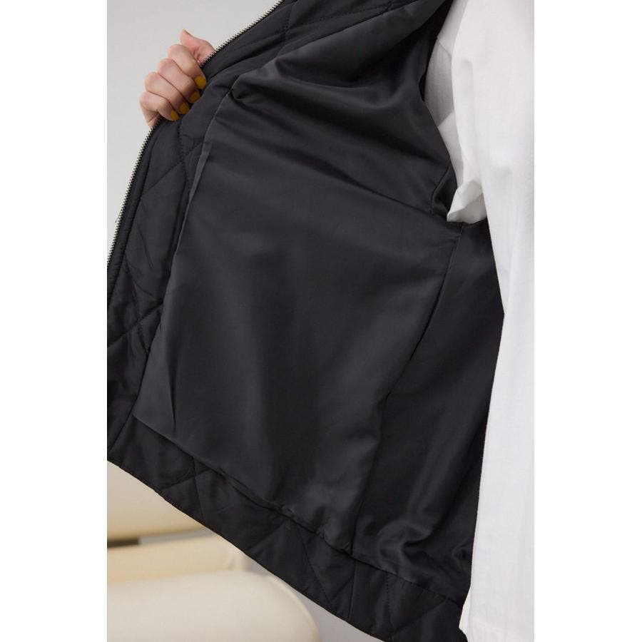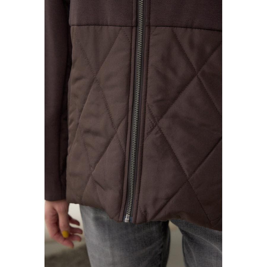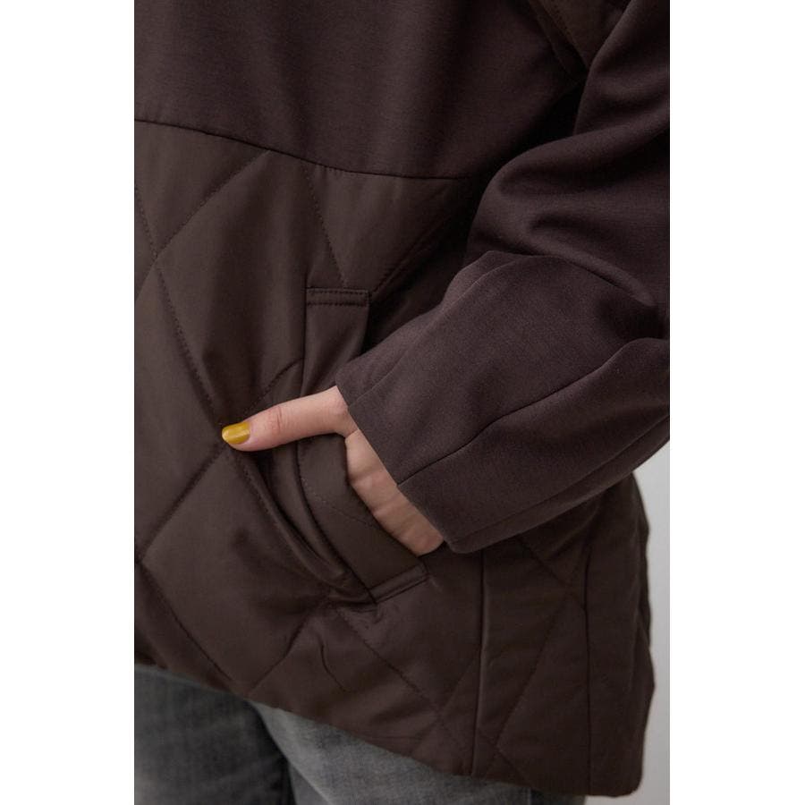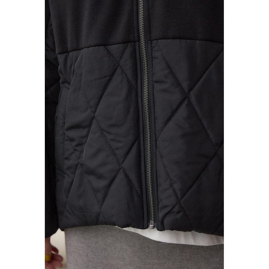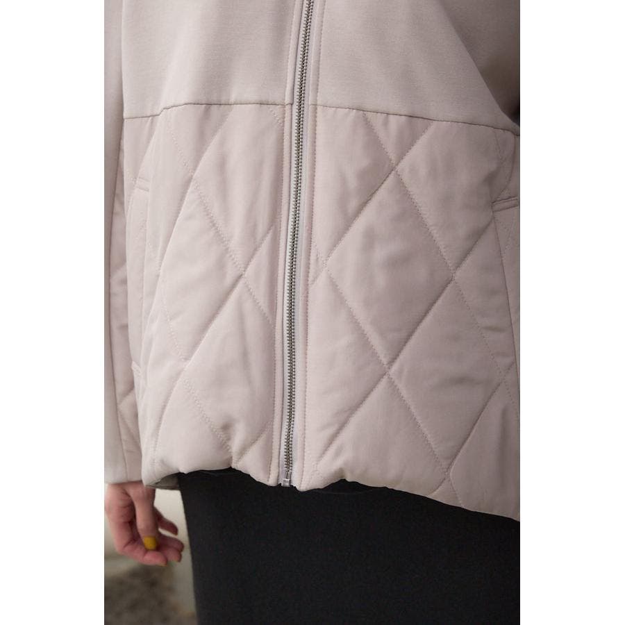 上身頃は滑らかなポンチ生地、下身頃はキルティング切替で立体感を演出。