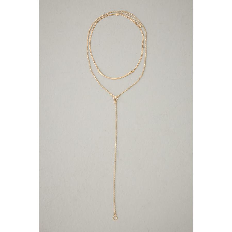 繊細なチェーンをレイヤード風に重ね、中央からまっすぐ落ちるY字シルエットで、縦のラインを強調しながらデコルテをきれいに見せてくれるデザイン。