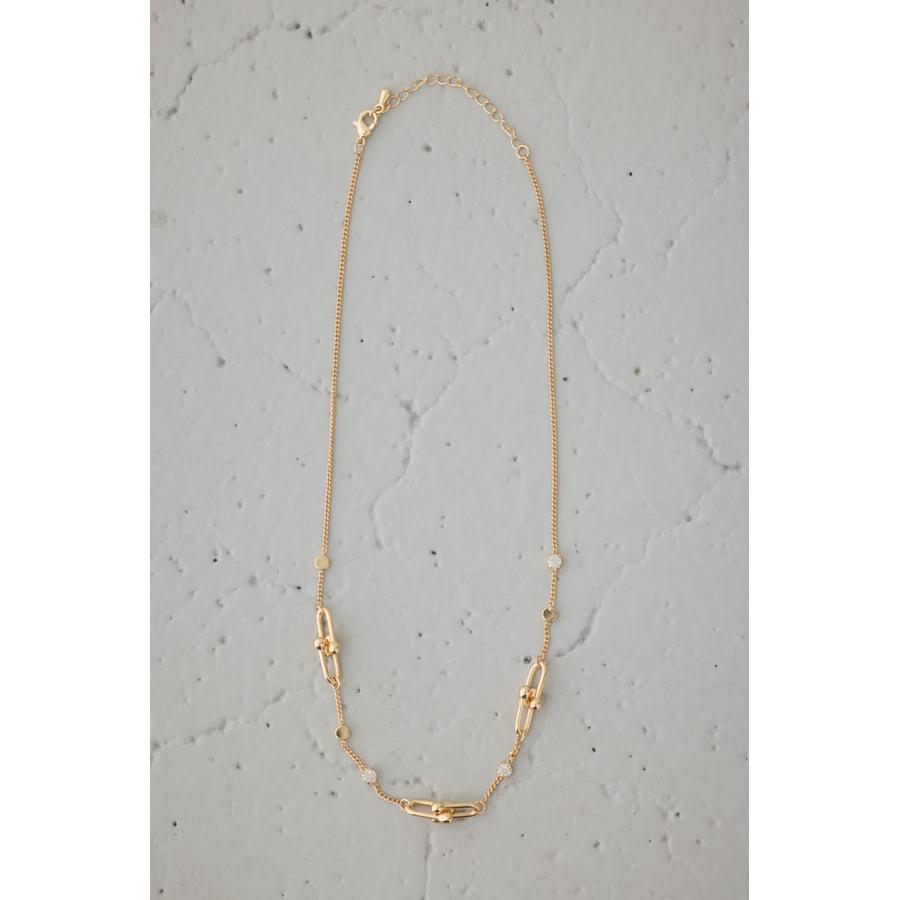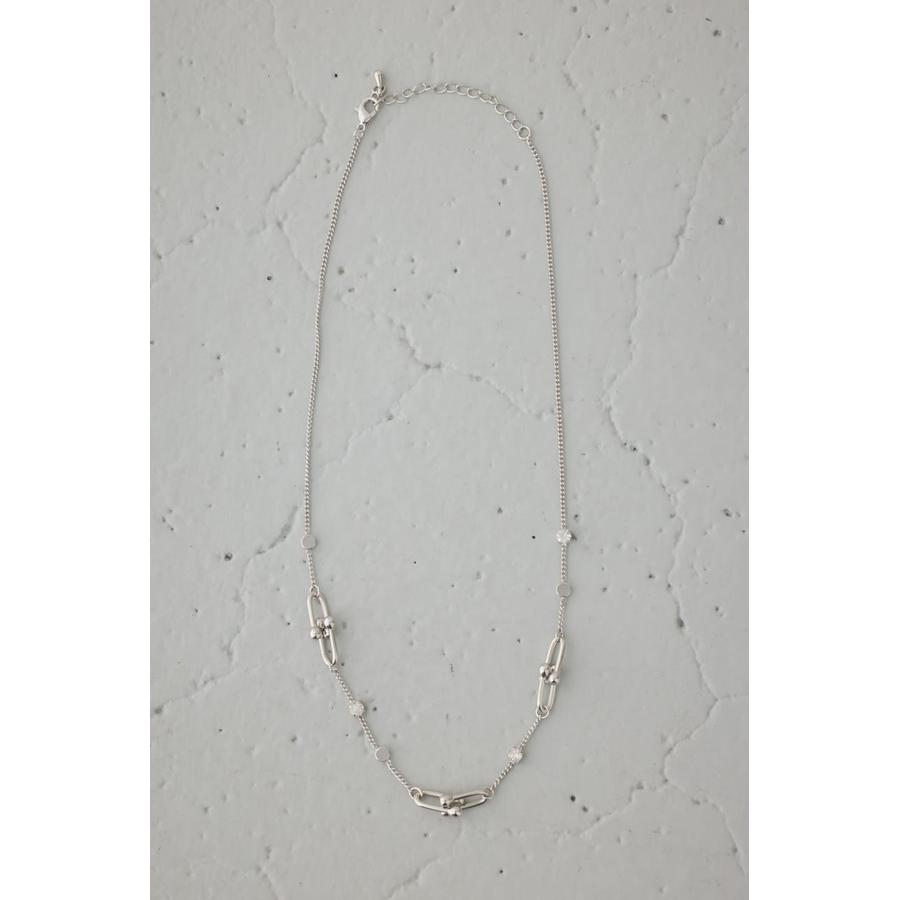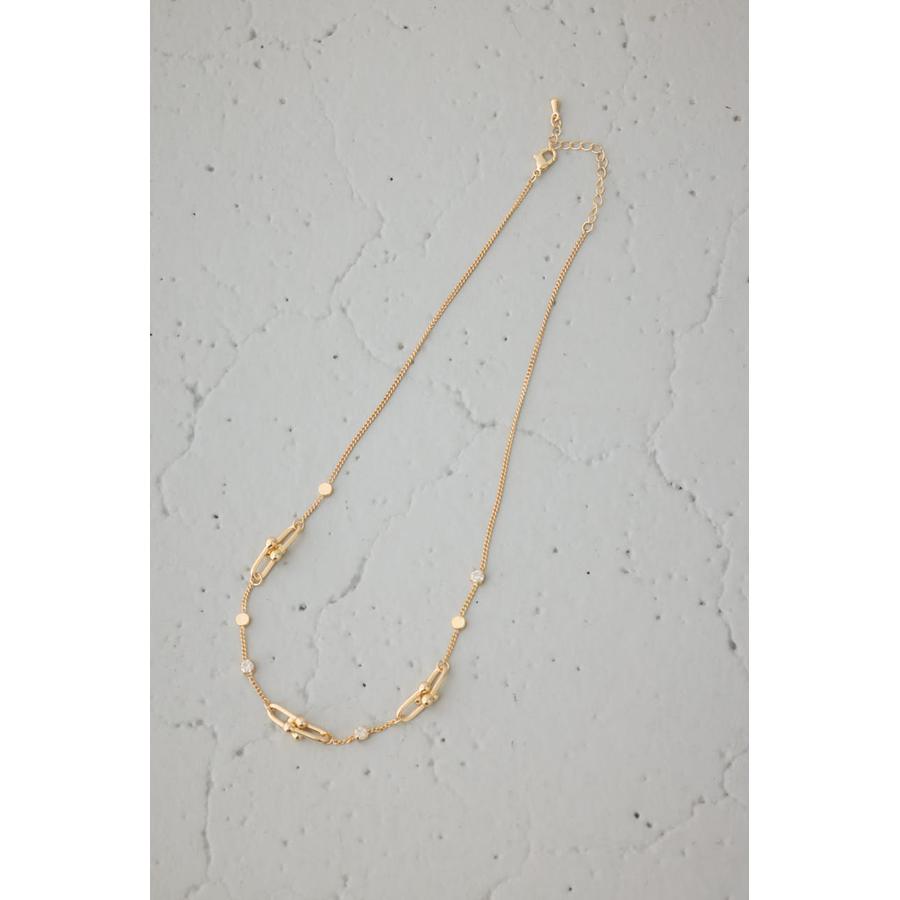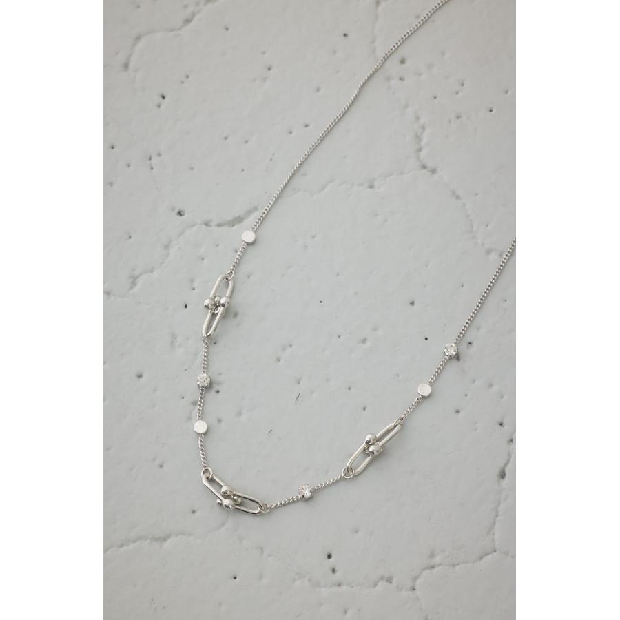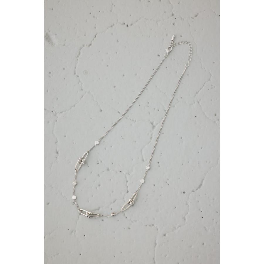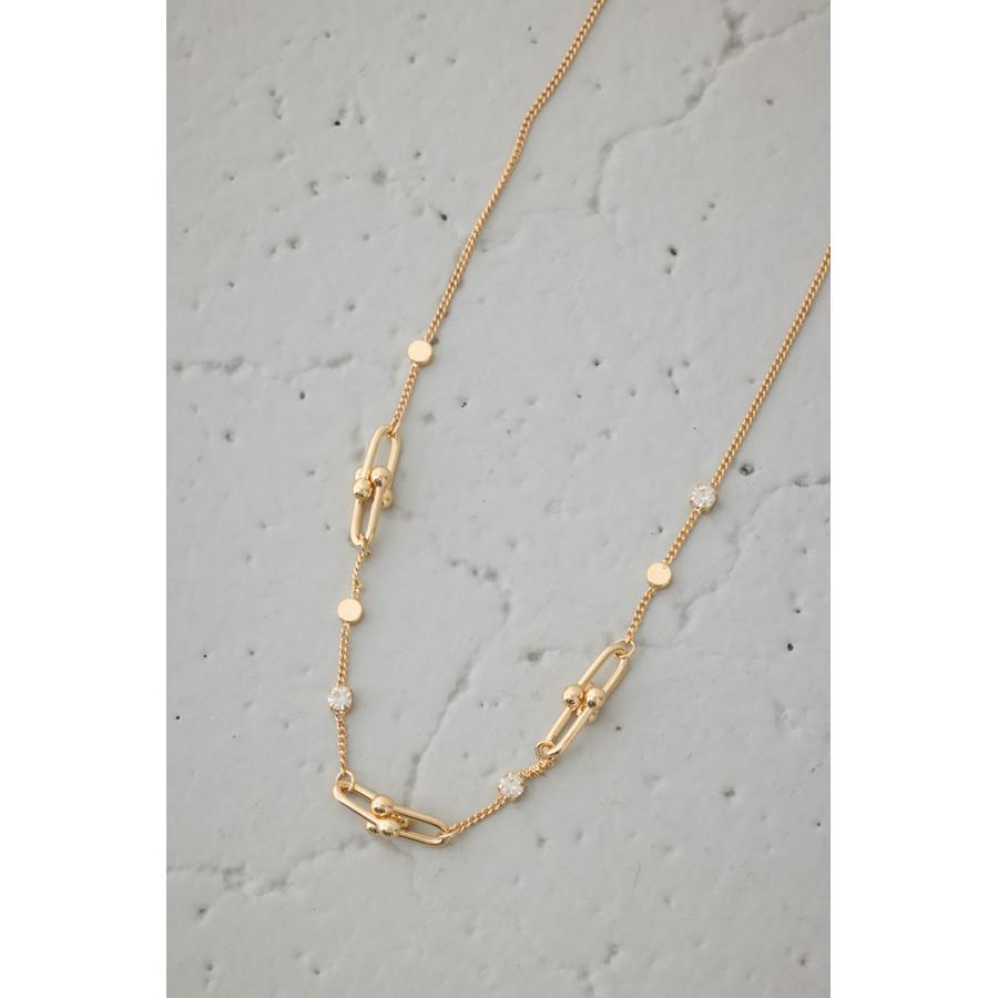 洗練されたメタルパーツがさりげなく輝く、モダンで上品なチェーンネックレスです。