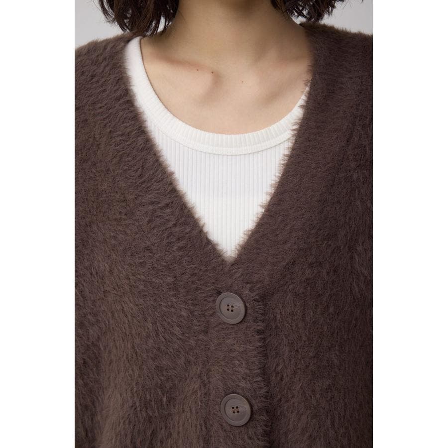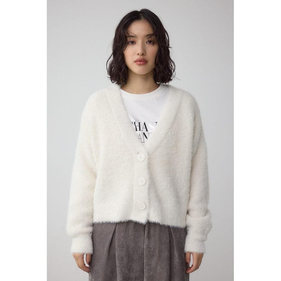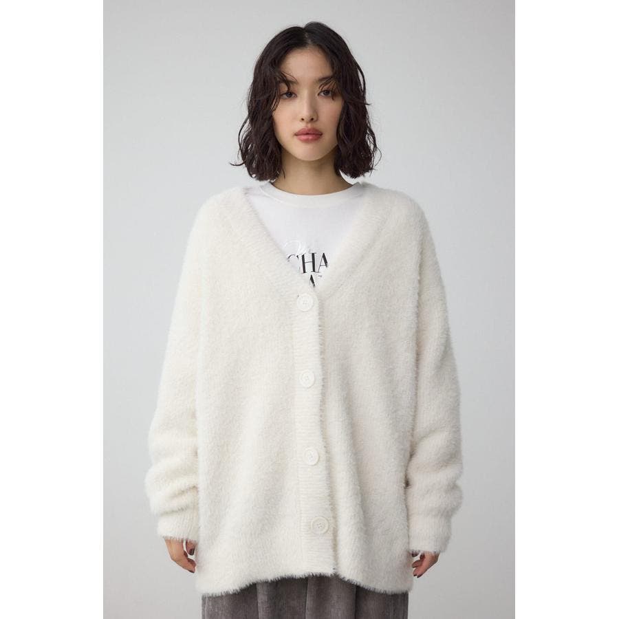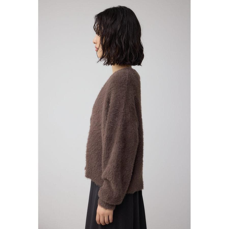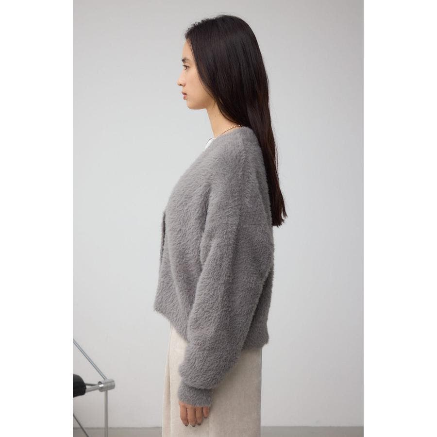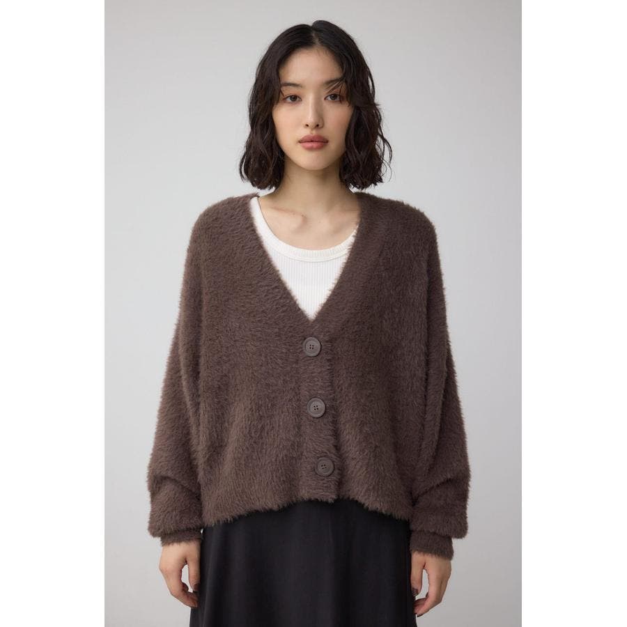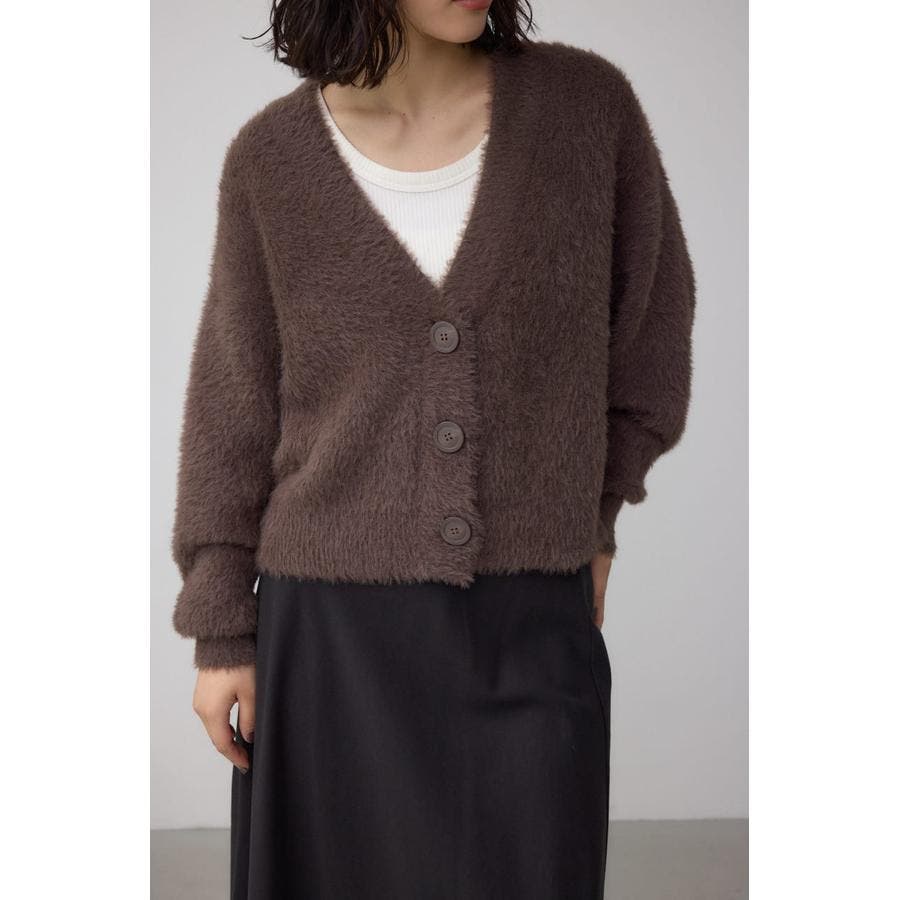伸縮性のある柔らかなモヘアライクなシャギーニットが女性らしさを演出してくれるニットカーディガンです。