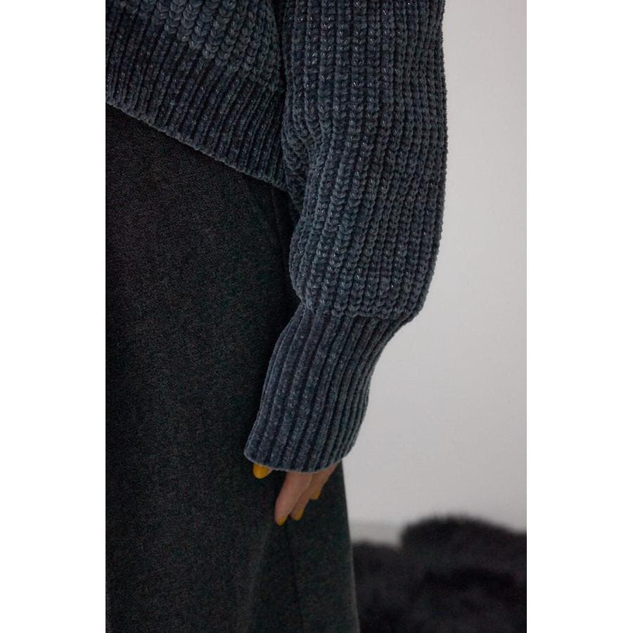 ベロアのような光沢感が特徴のモール糸に、ラメ糸を引き揃えて度詰めに編んでいます。