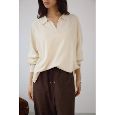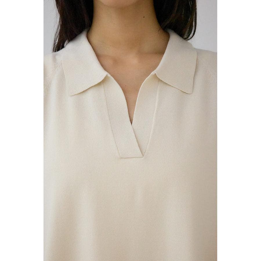 デコルテまわりをすっきり見せるスキッパーデザインで、トレンドのポロカラーニットトップスです。