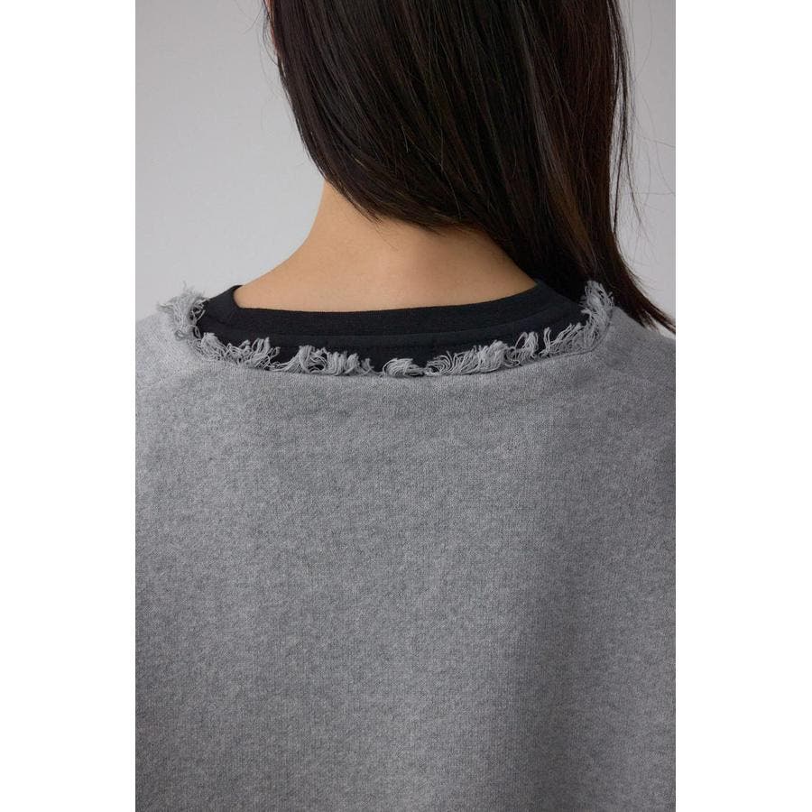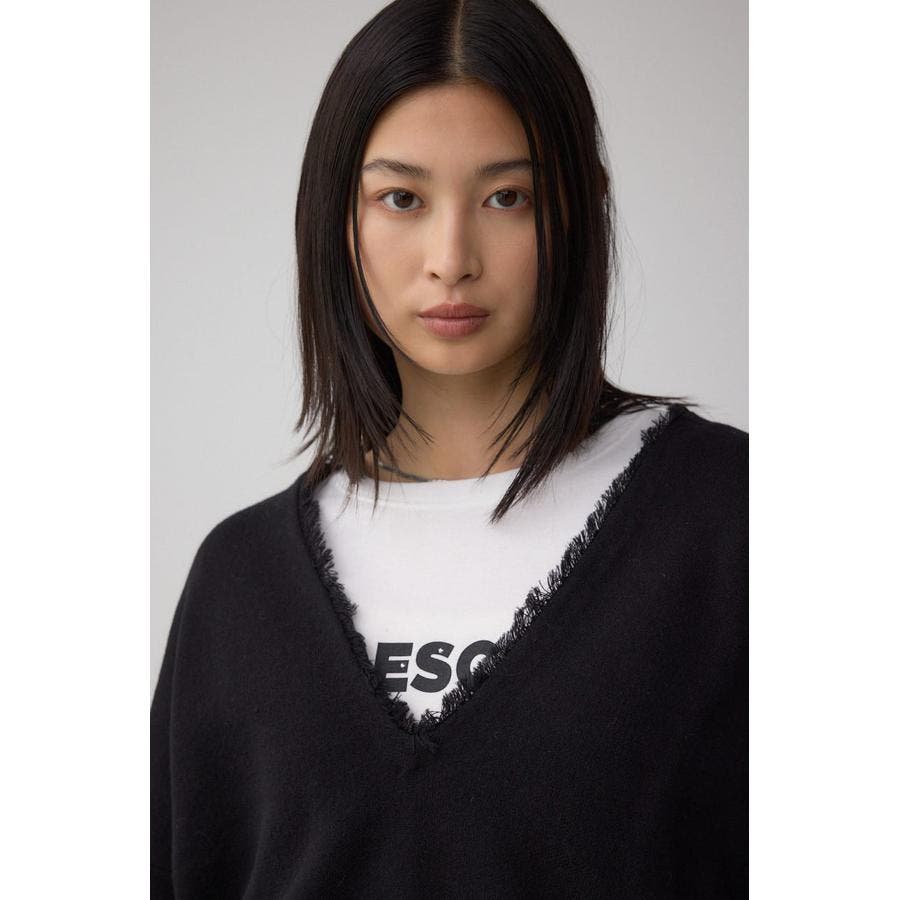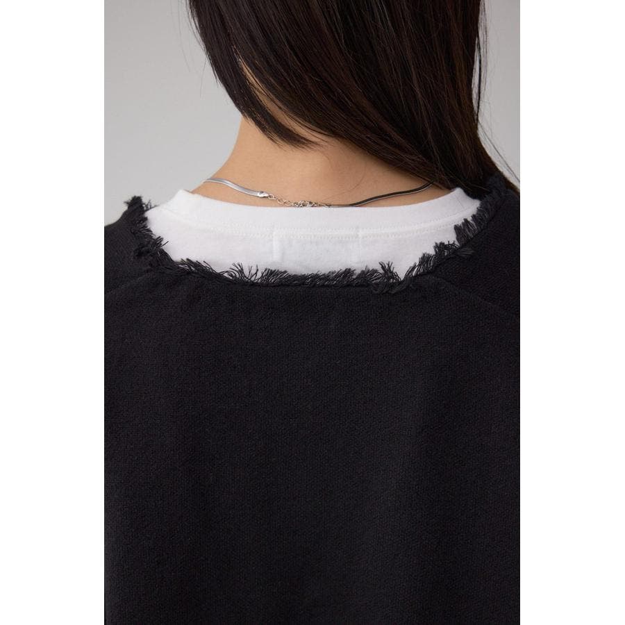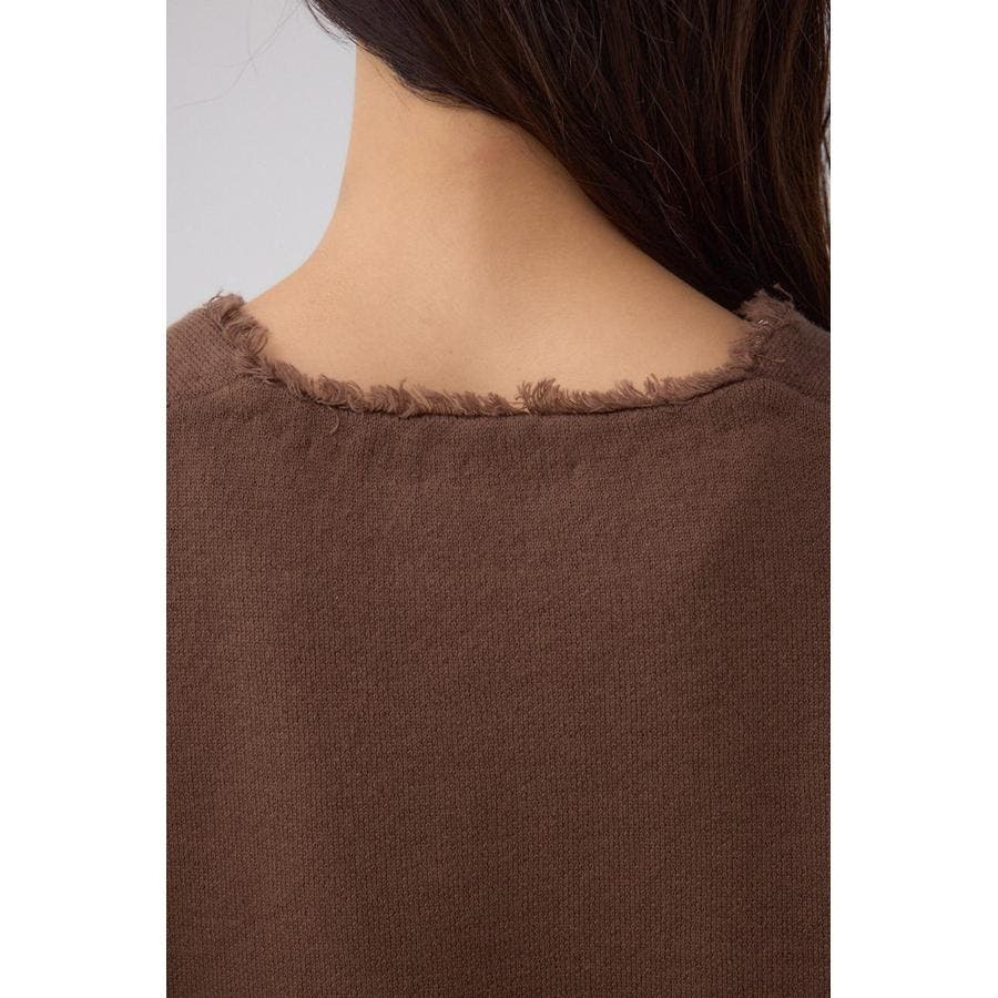 ネックラインにフリンジを施し、シンプルながらもさりげないアクセントをプラス。