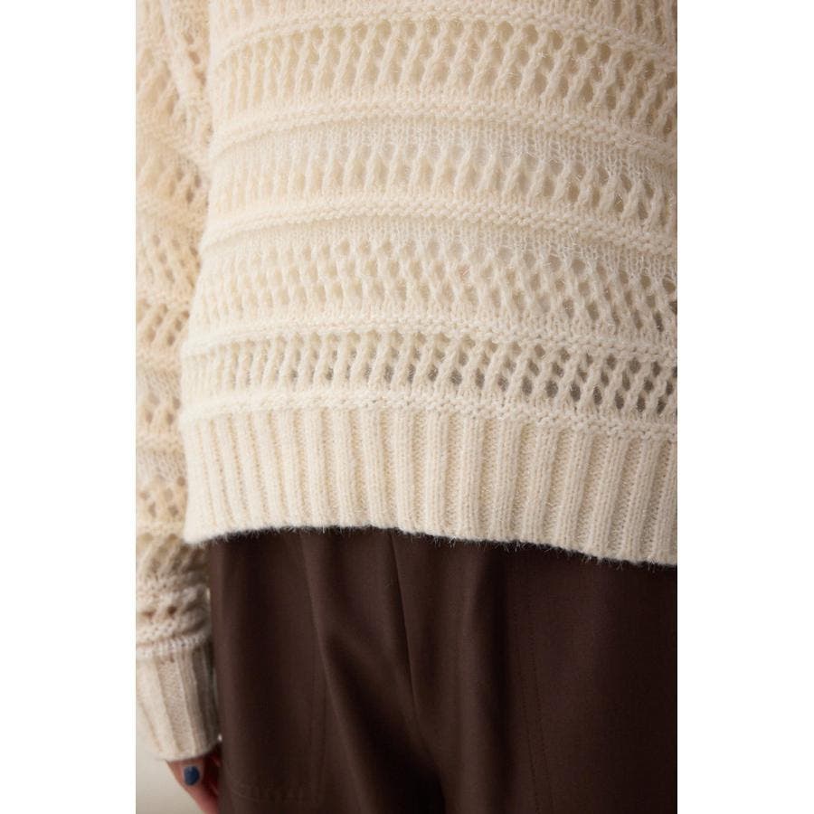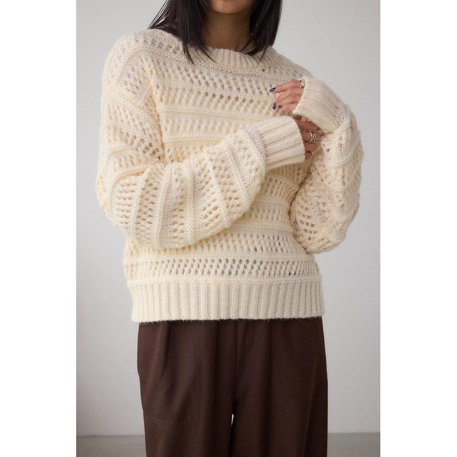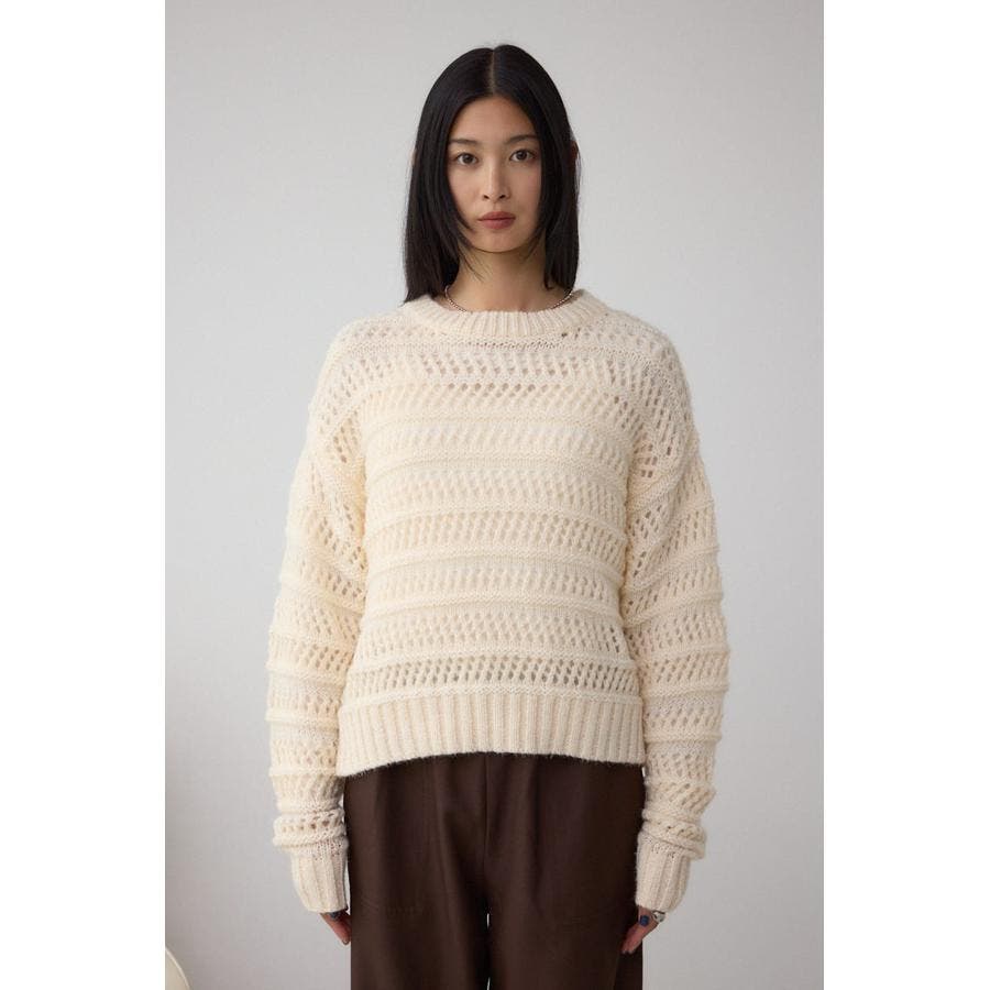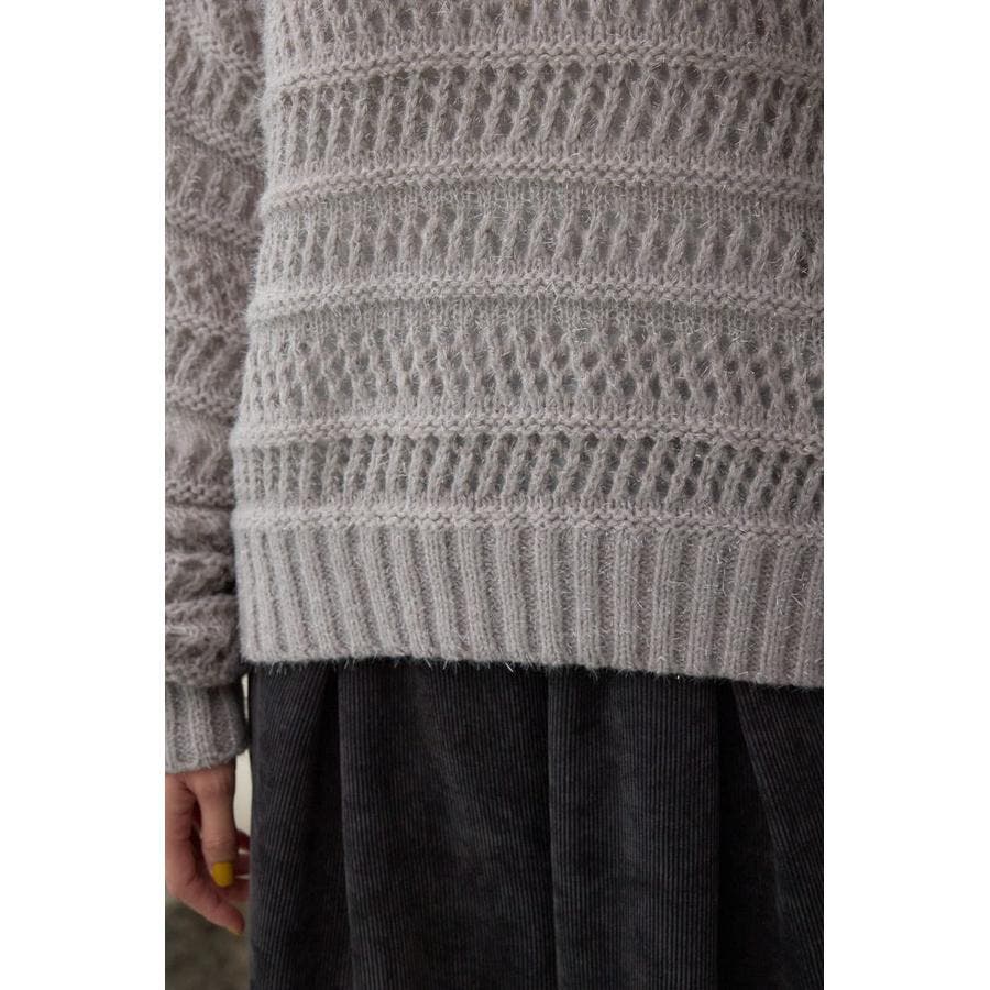 メッシュ柄のボーダー切り替えが印象的なニットトップスです。