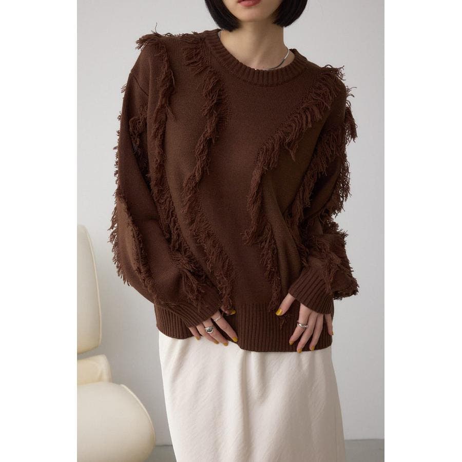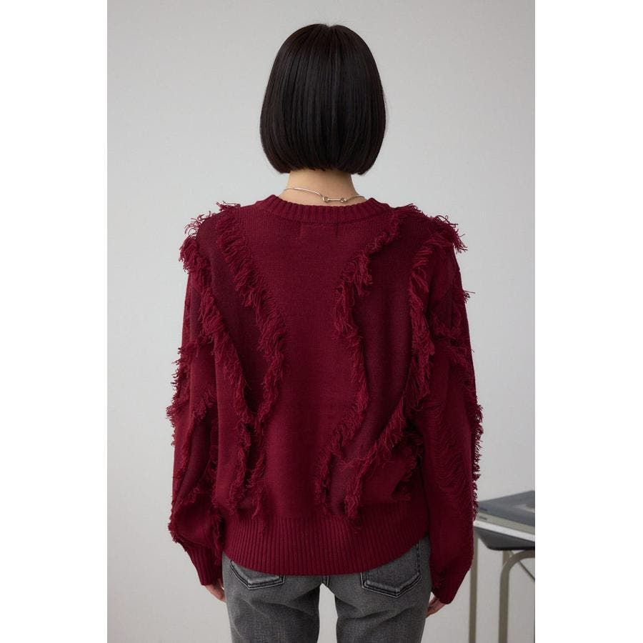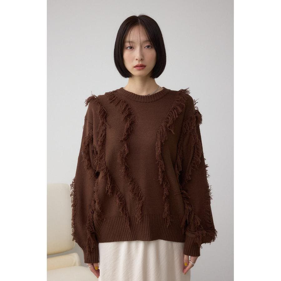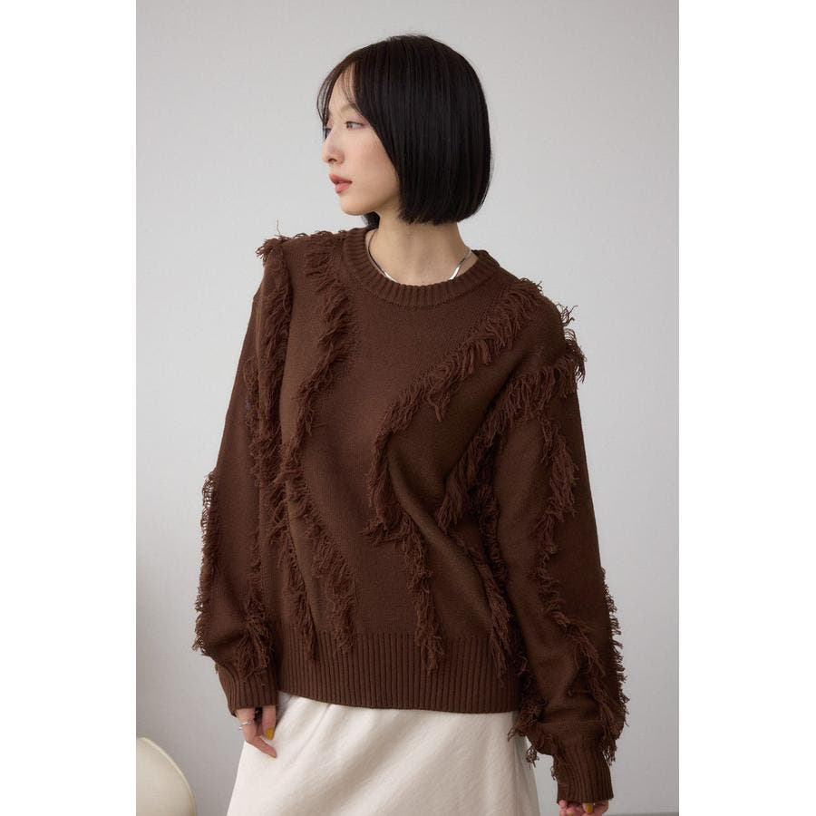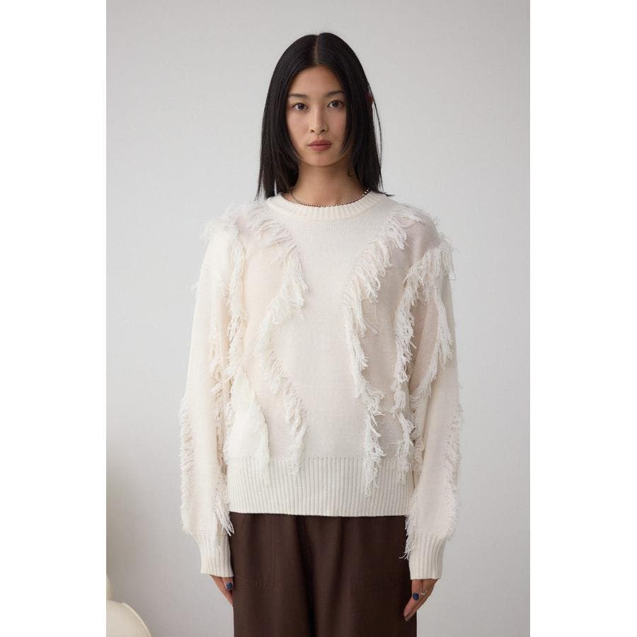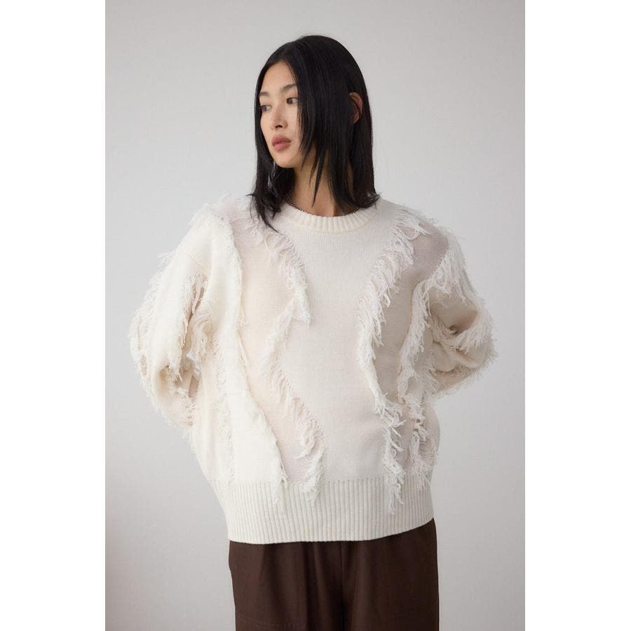流線状に入ったフリンジで動きのあるデザインニットです。