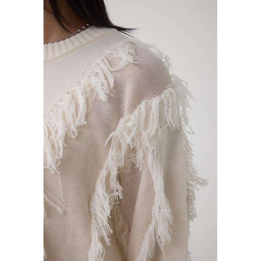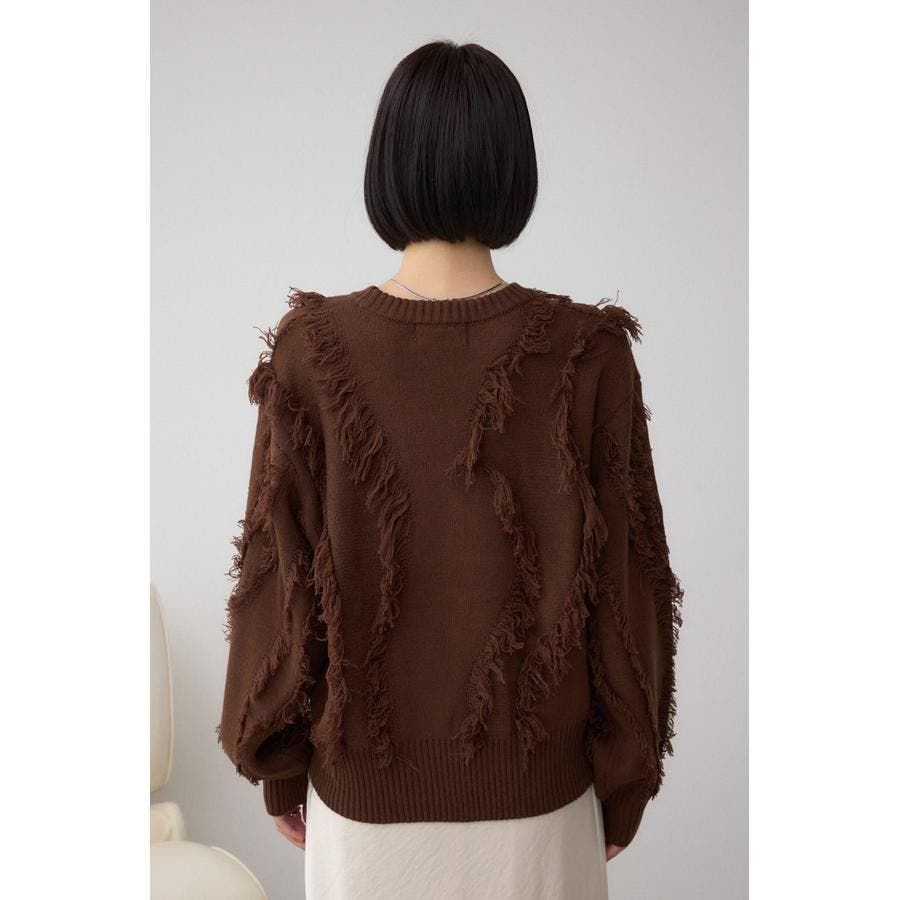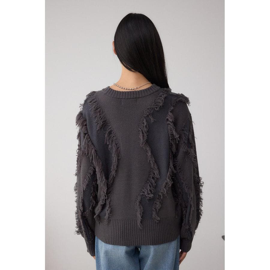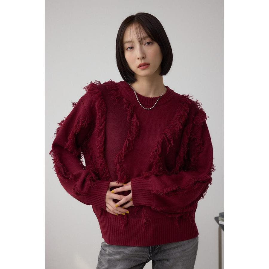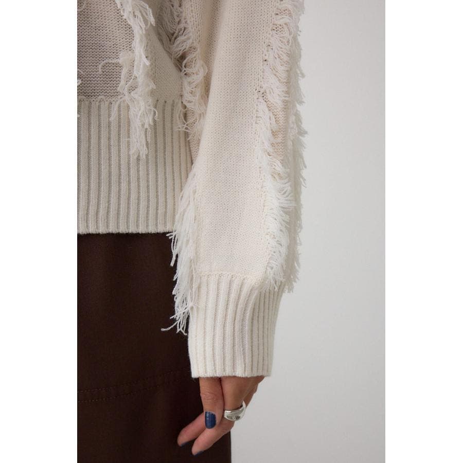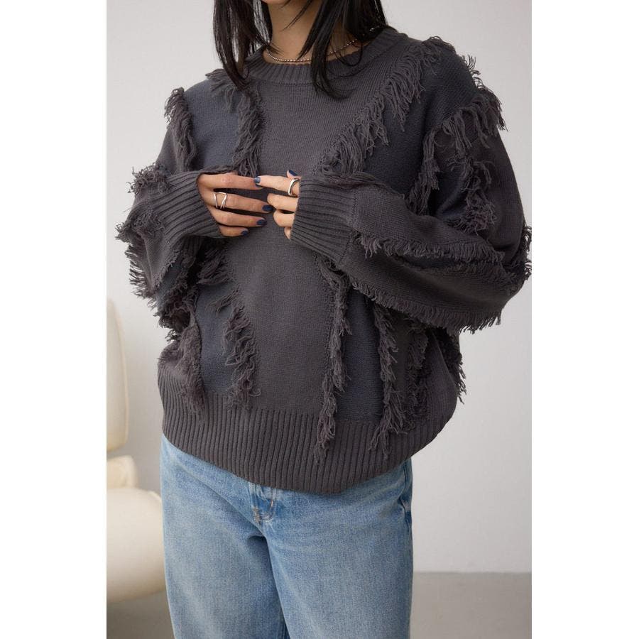 流線状に入ったフリンジで動きのあるデザインニットです。