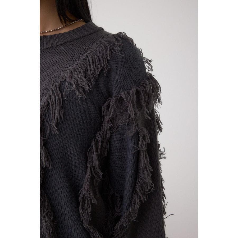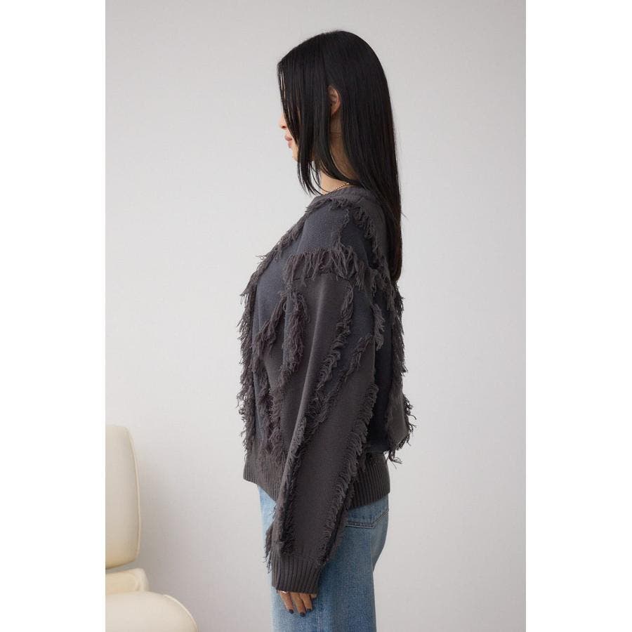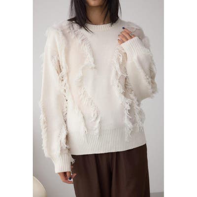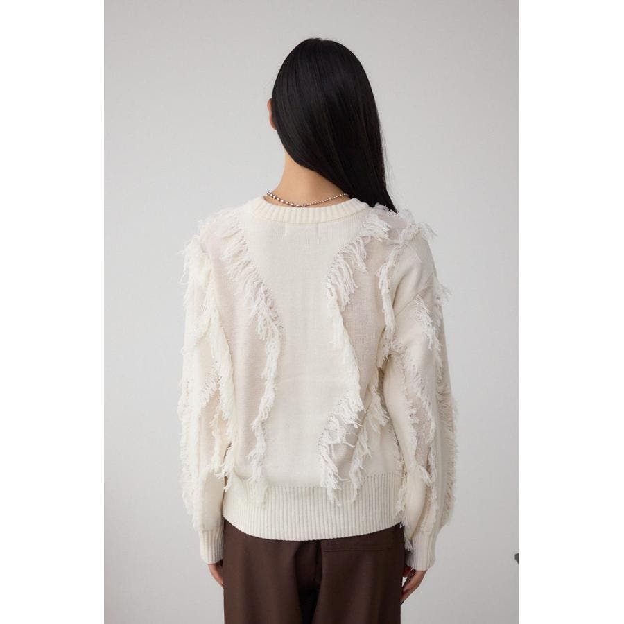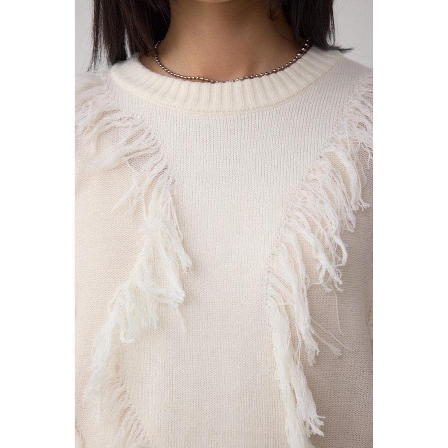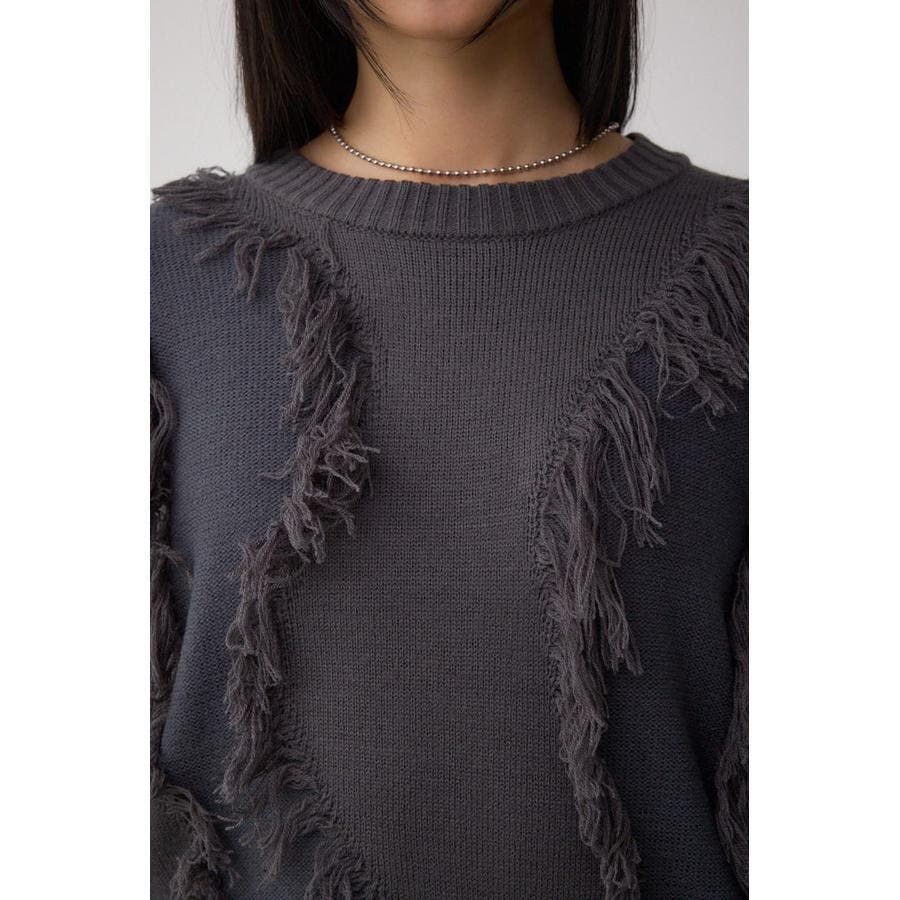 流線状に入ったフリンジで動きのあるデザインニットです。