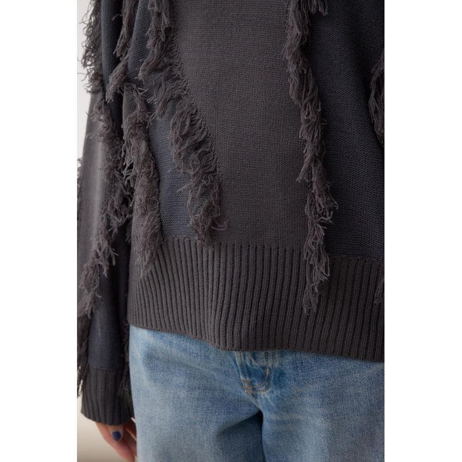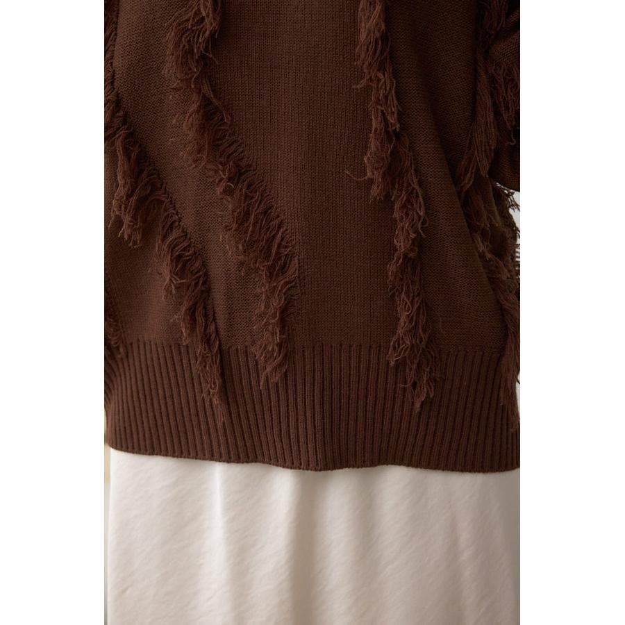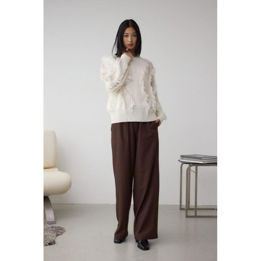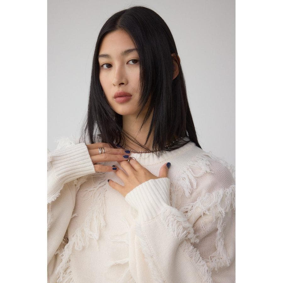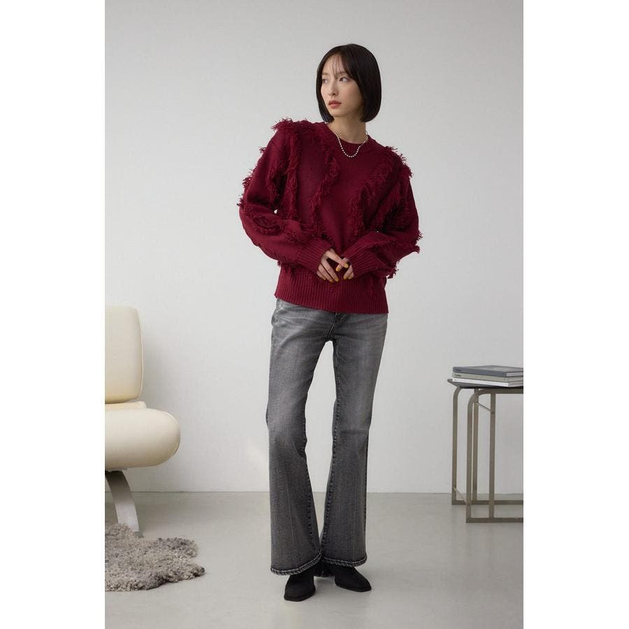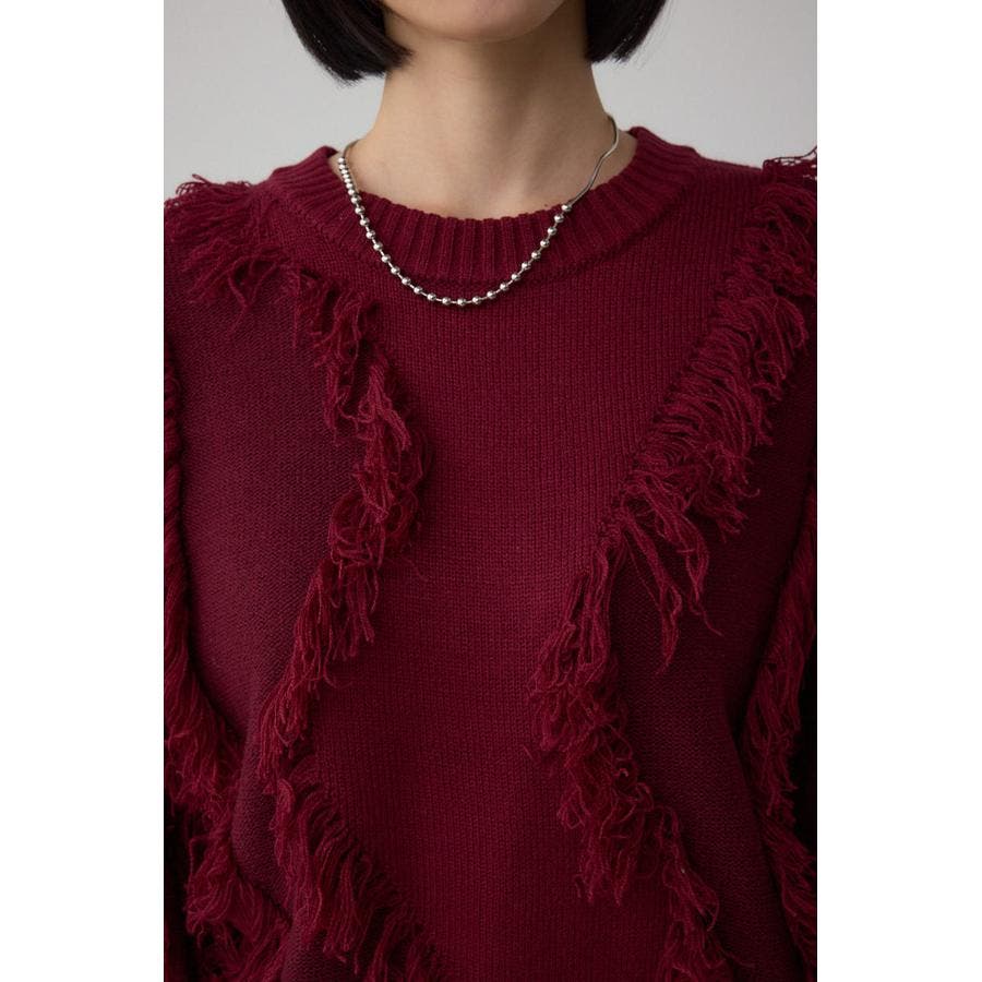 流線状に入ったフリンジで動きのあるデザインニットです。