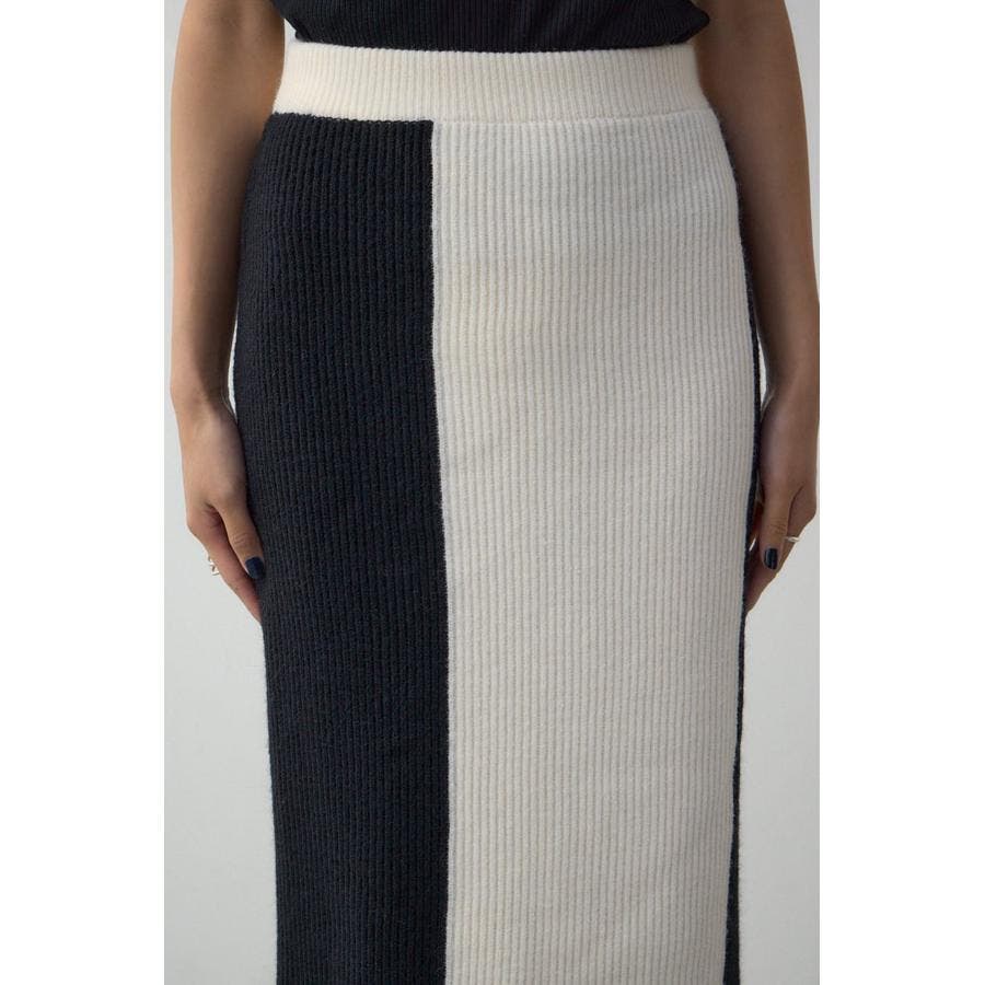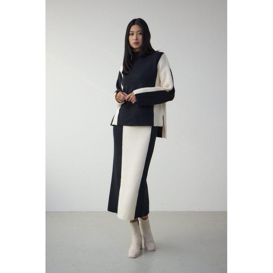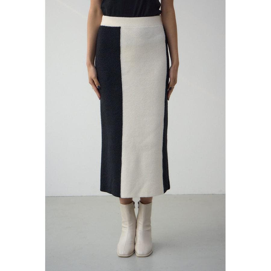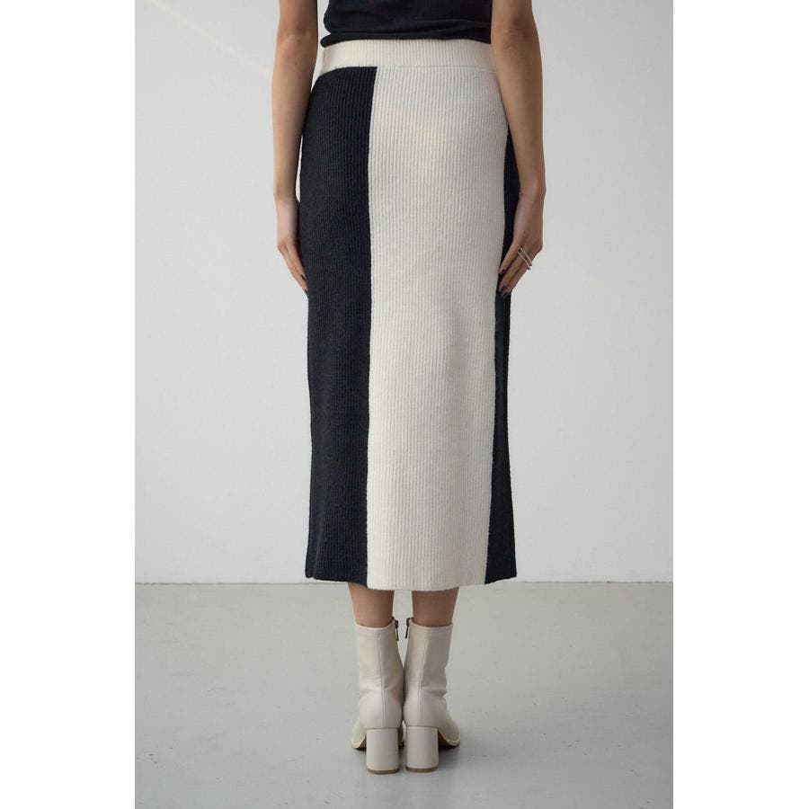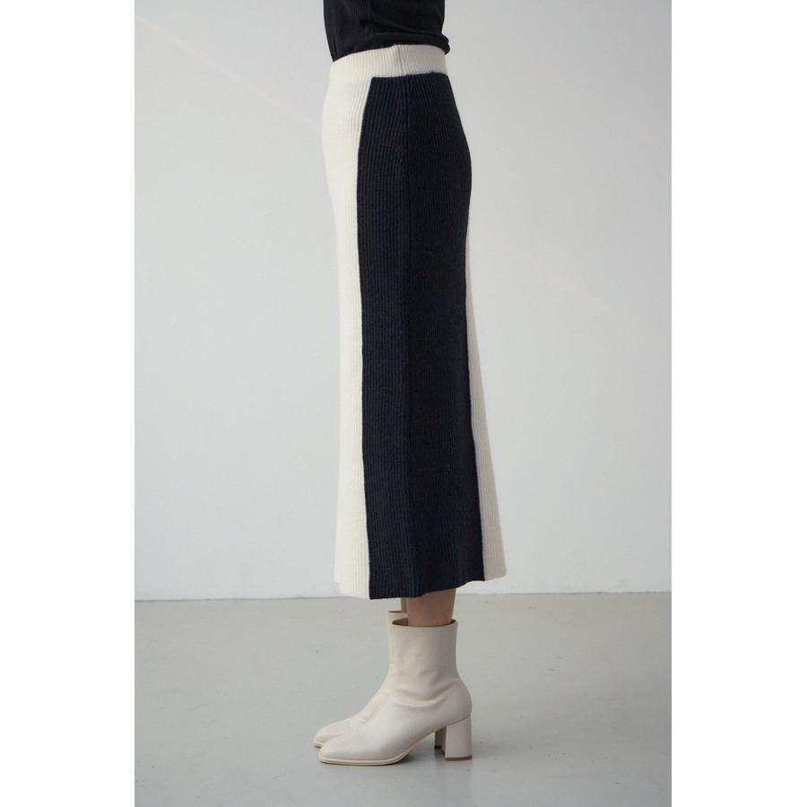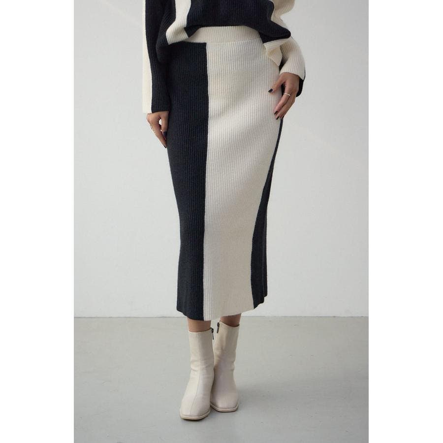 縦ラインを強調する配色デザインがスタイルアップを叶える、モードな印象のニットタイトスカート。