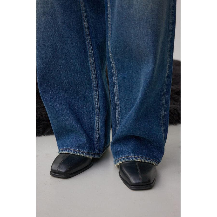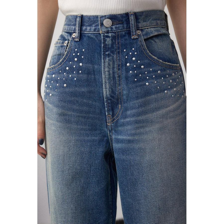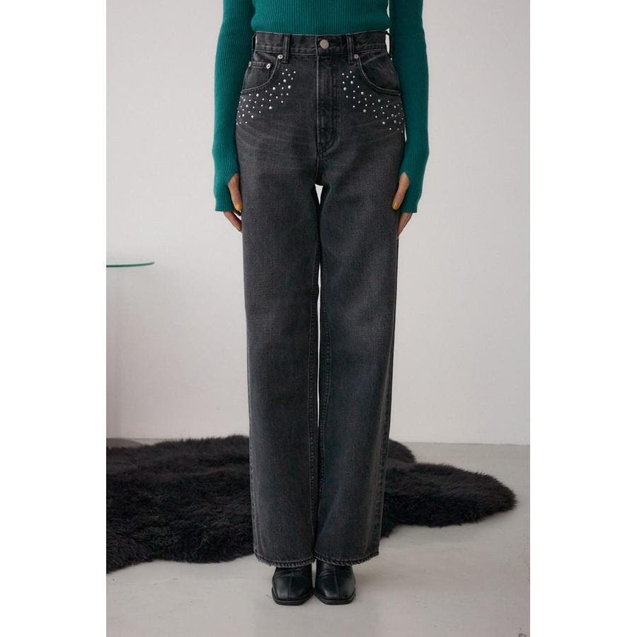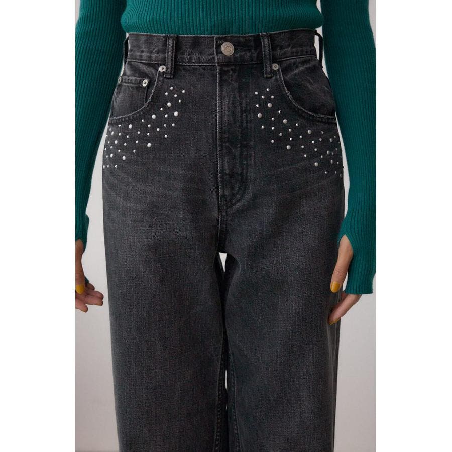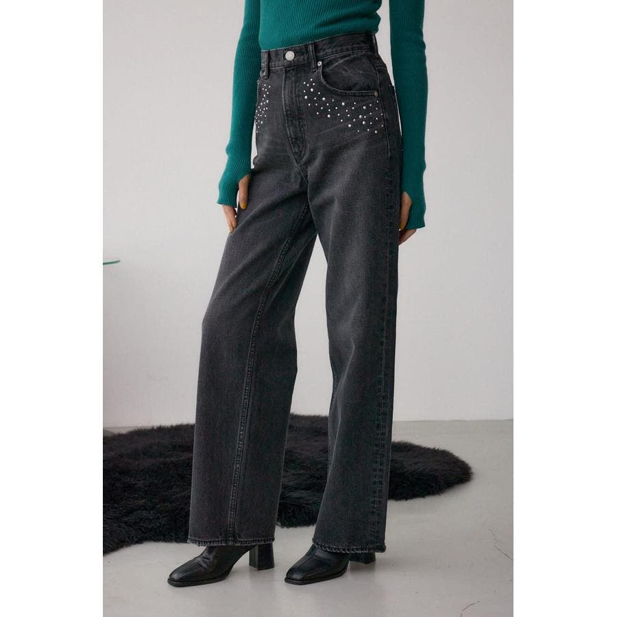 ポケット口に散りばめたスタッズとラインストーンがポイントのワイドデニム。