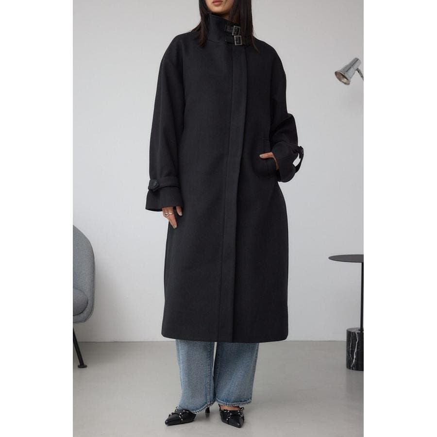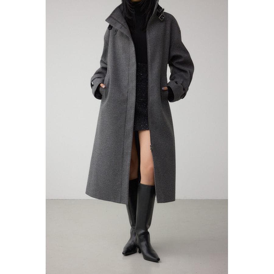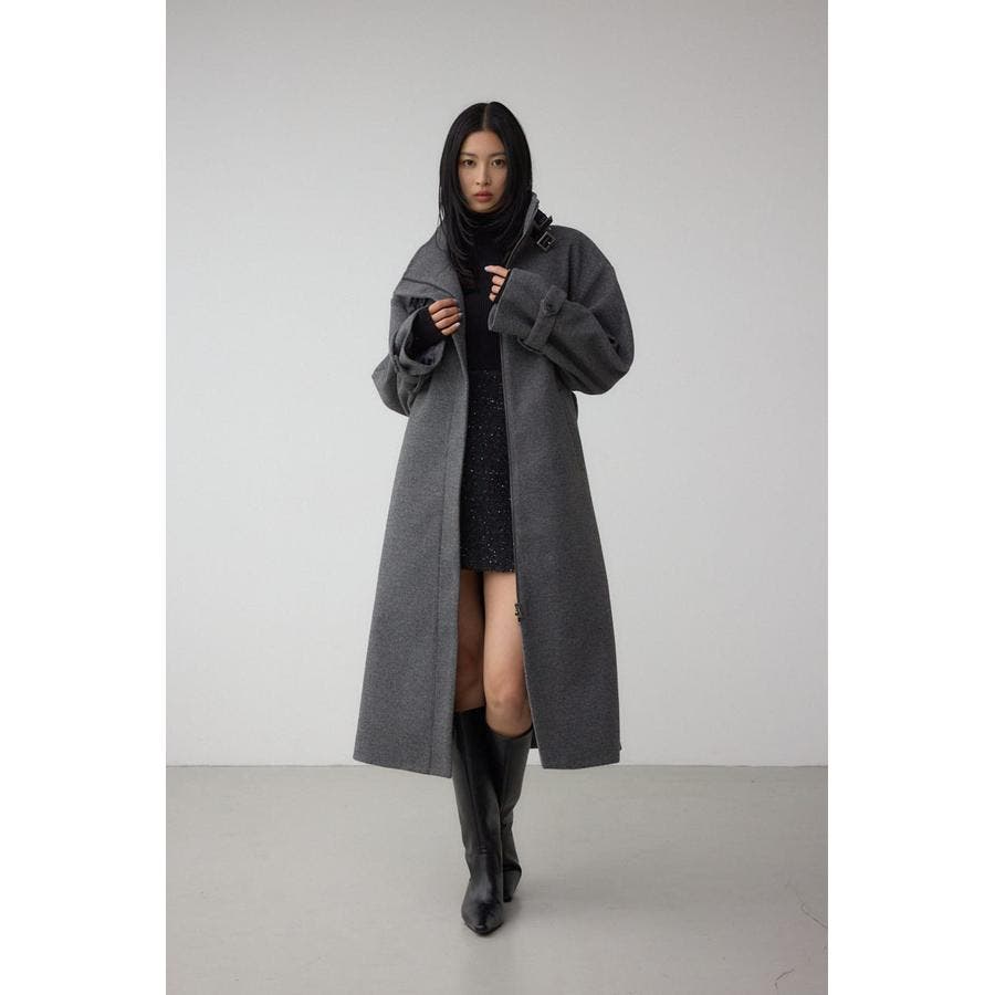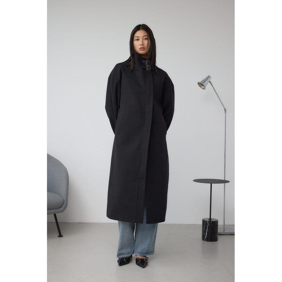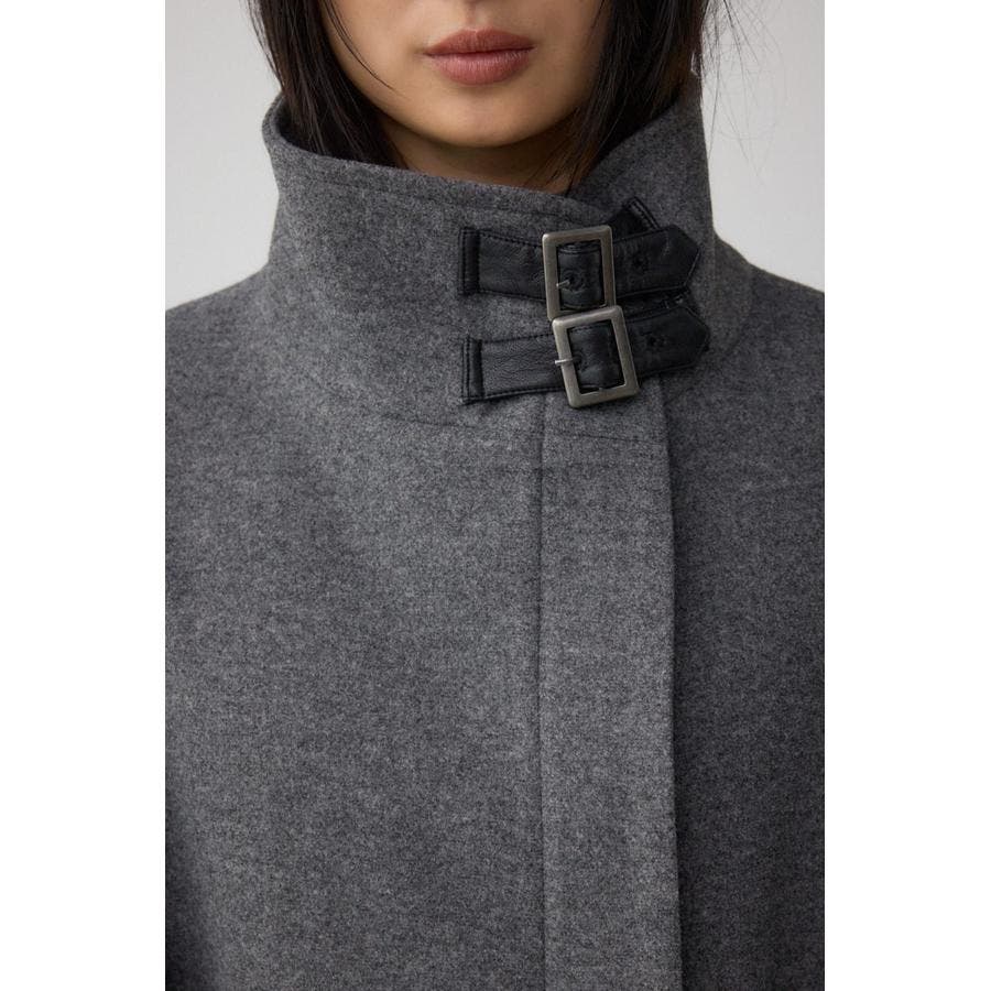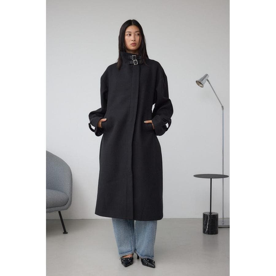 襟のレザーベルトがポイントのモード感をプラスしたスタンドコート。