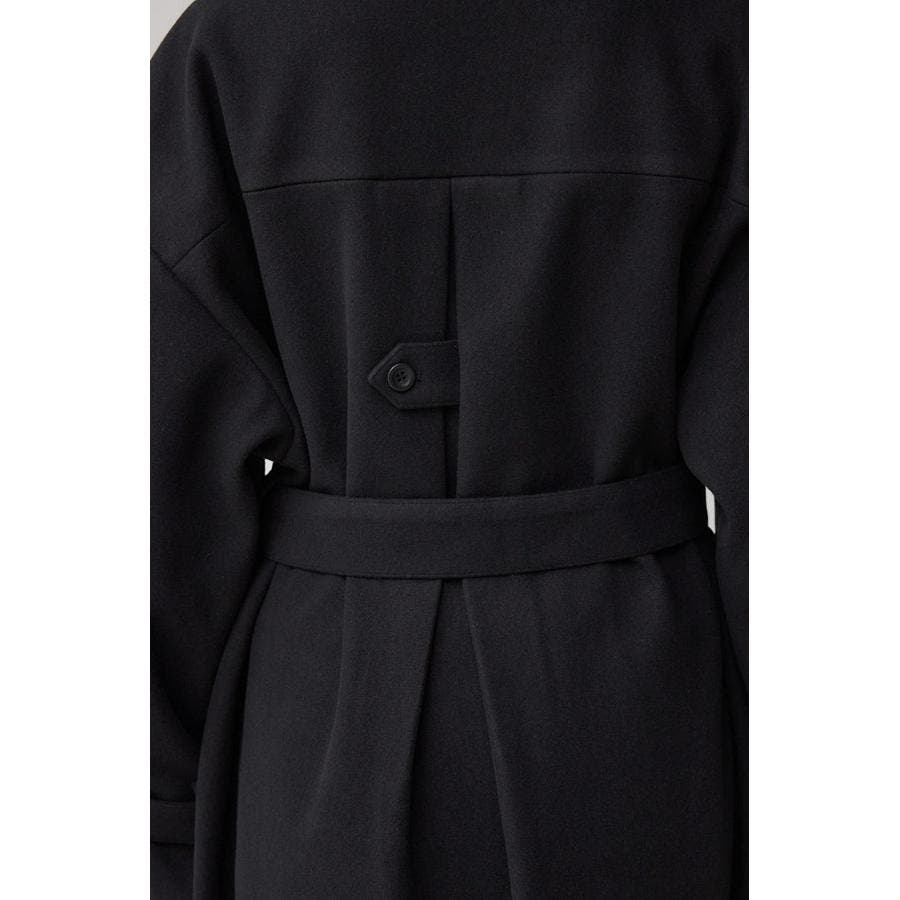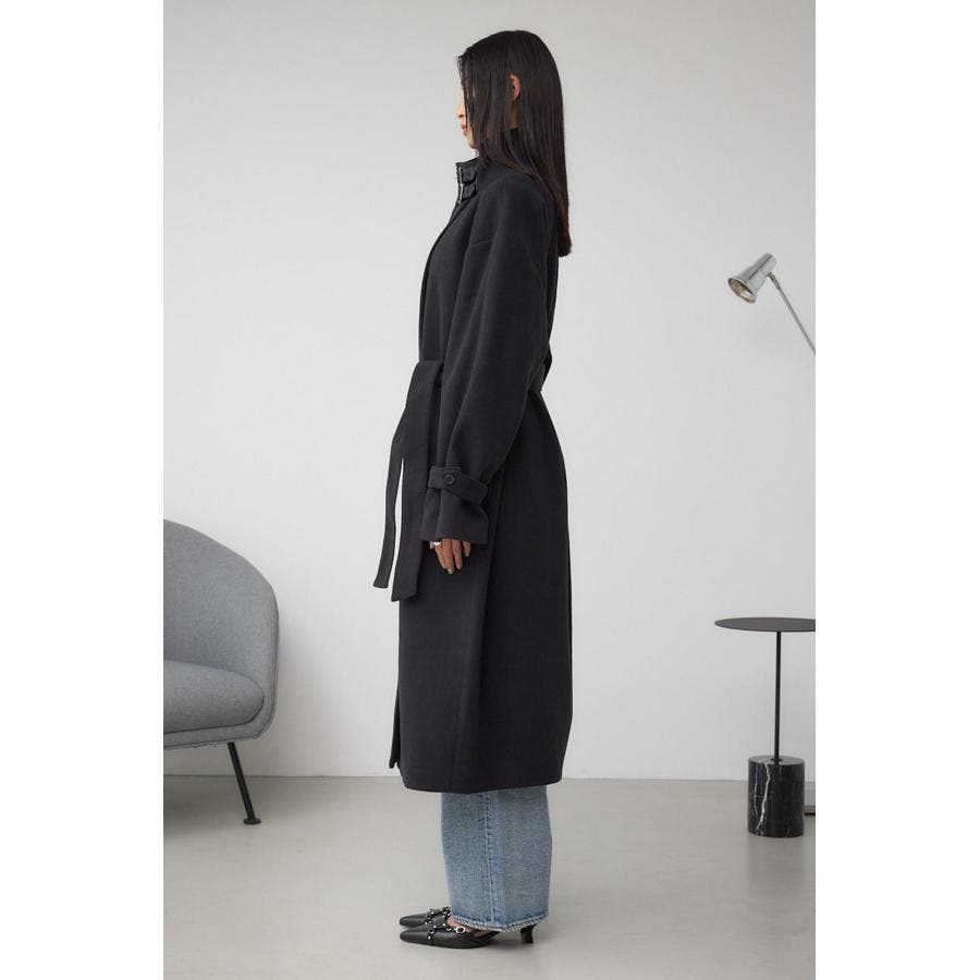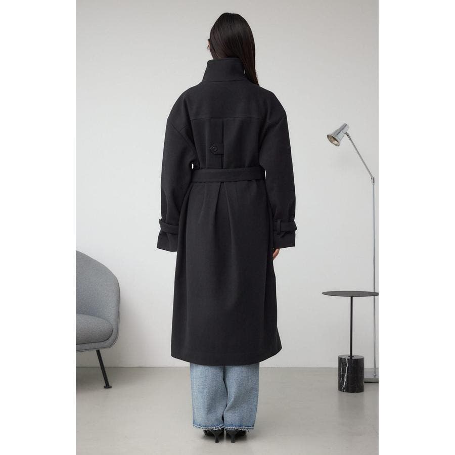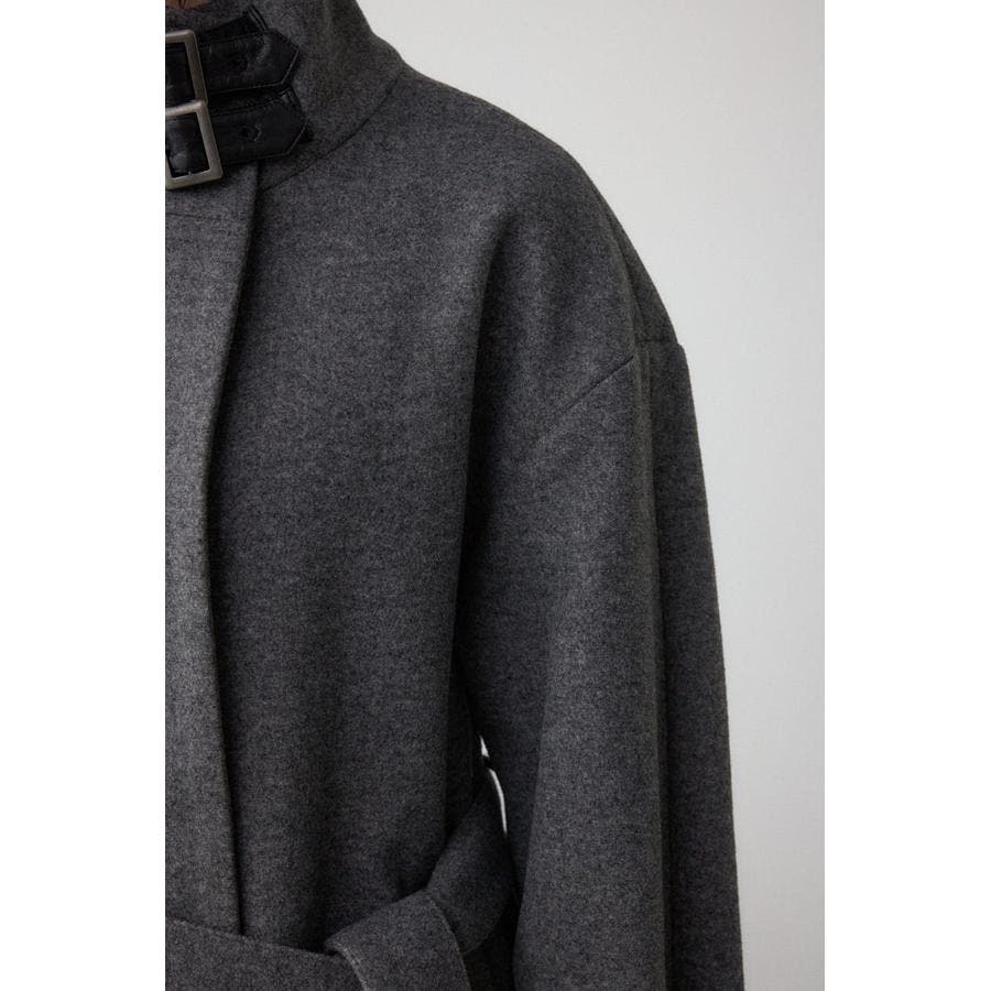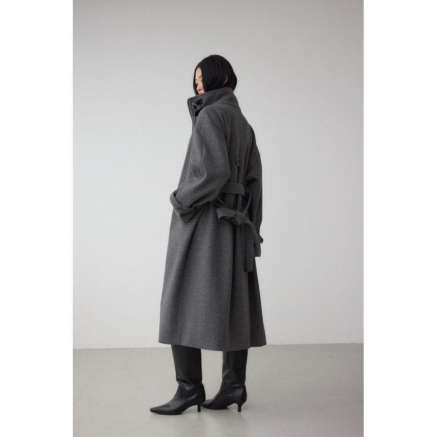 襟のレザーベルトがポイントのモード感をプラスしたスタンドコート。