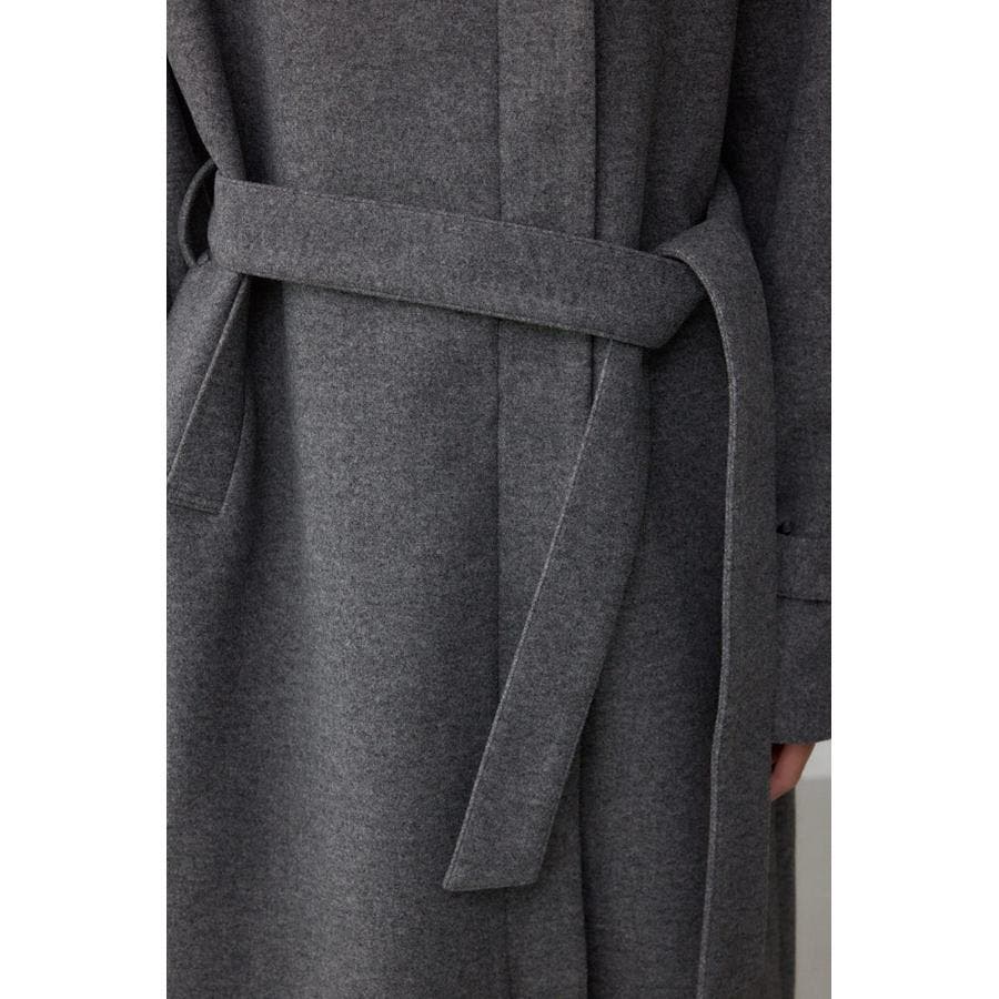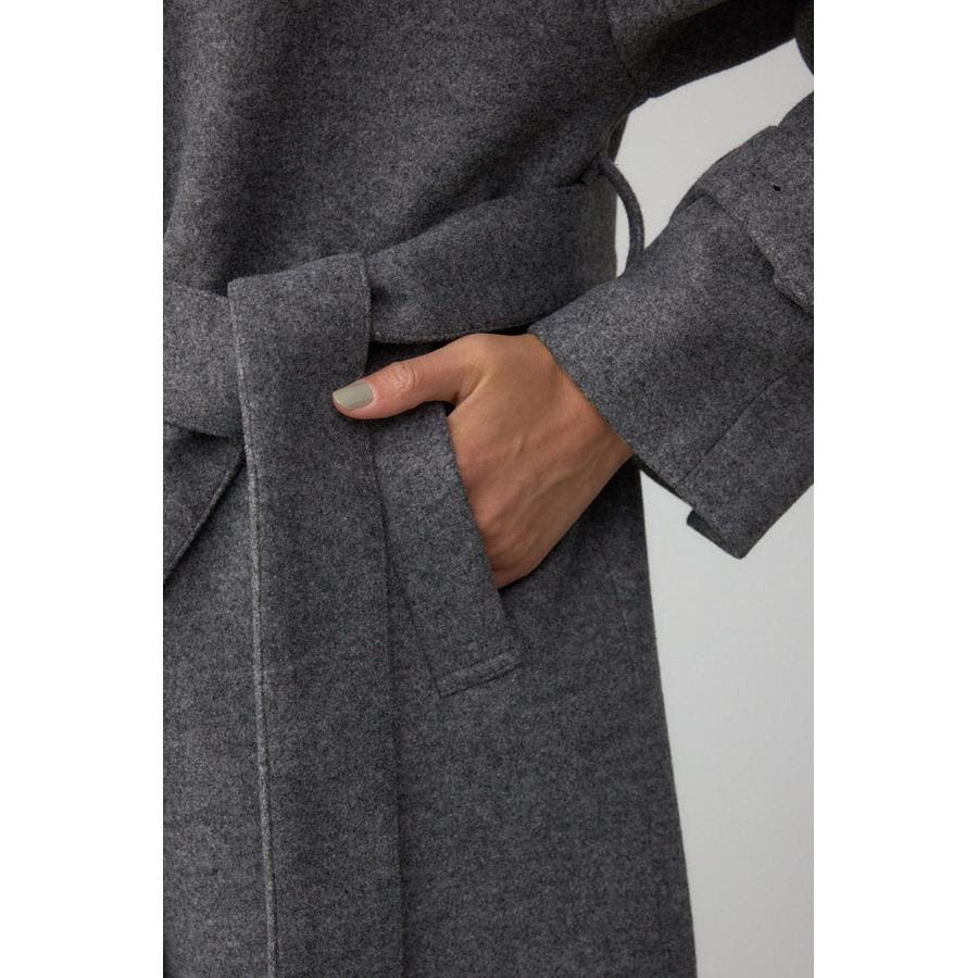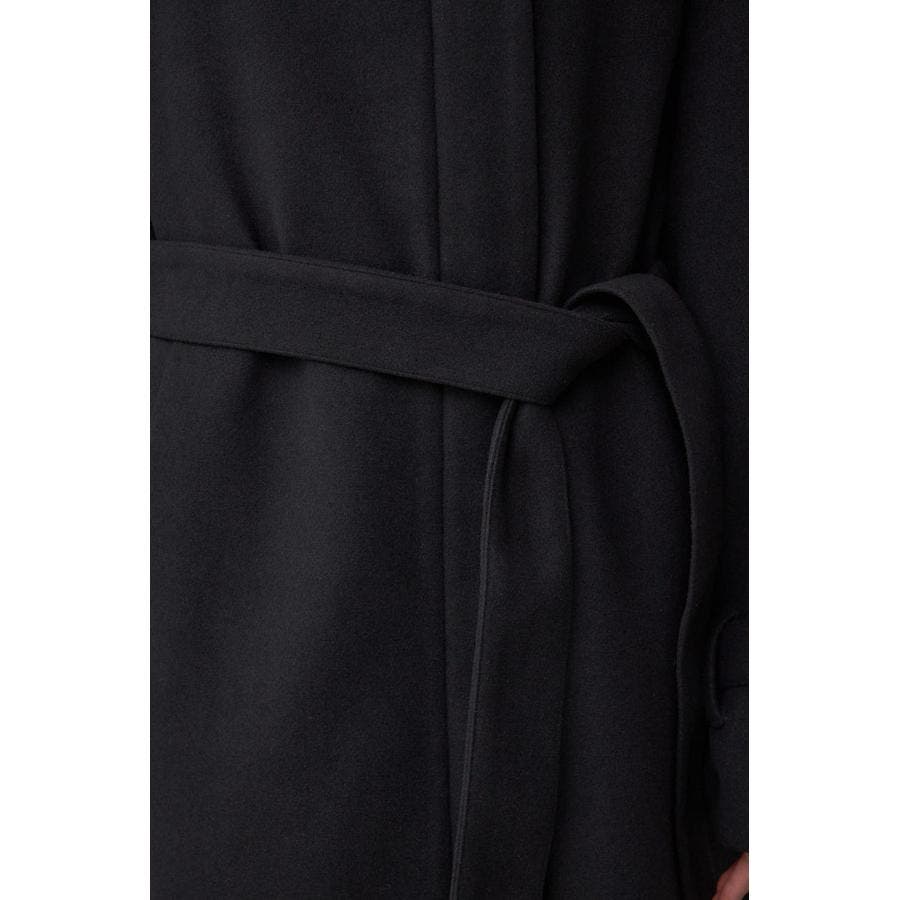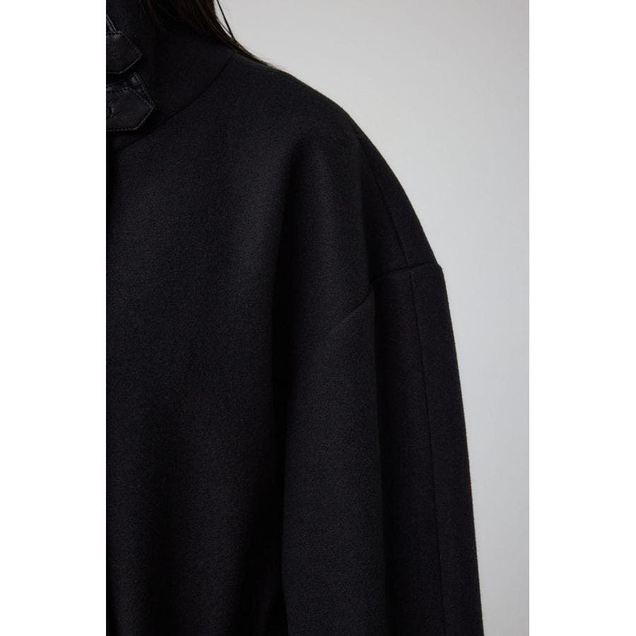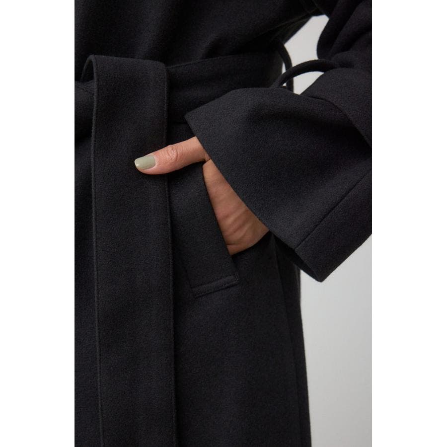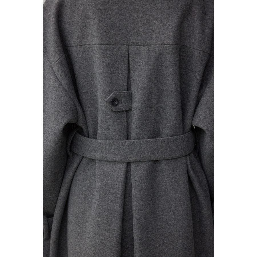 襟のレザーベルトがポイントのモード感をプラスしたスタンドコート。