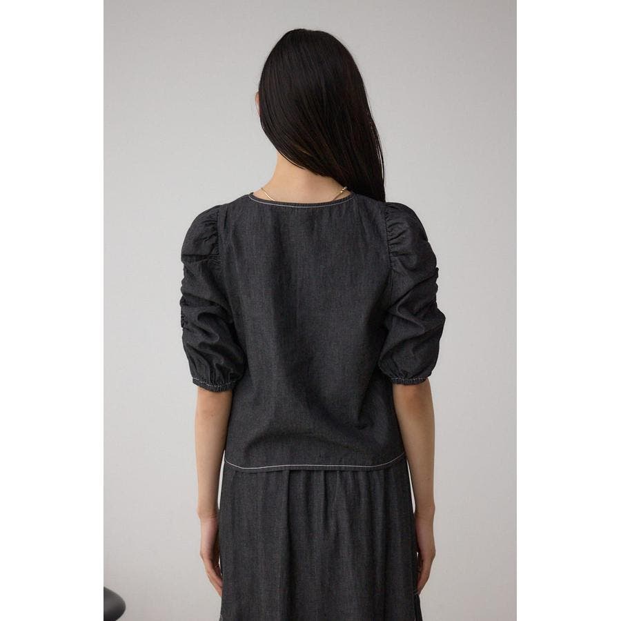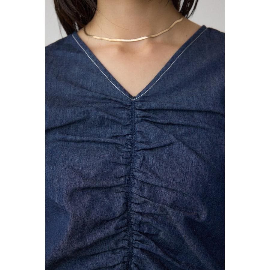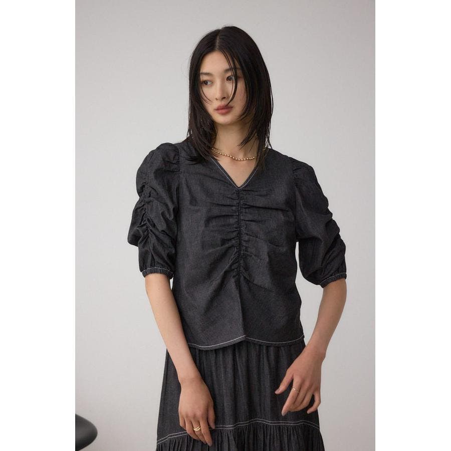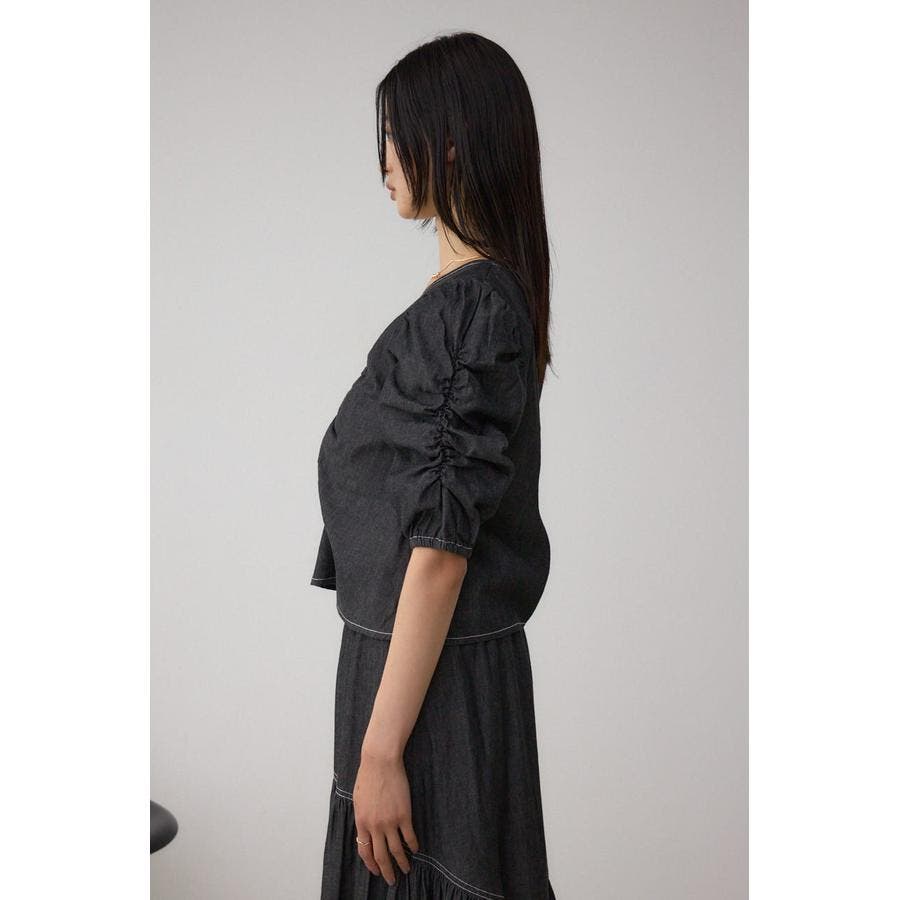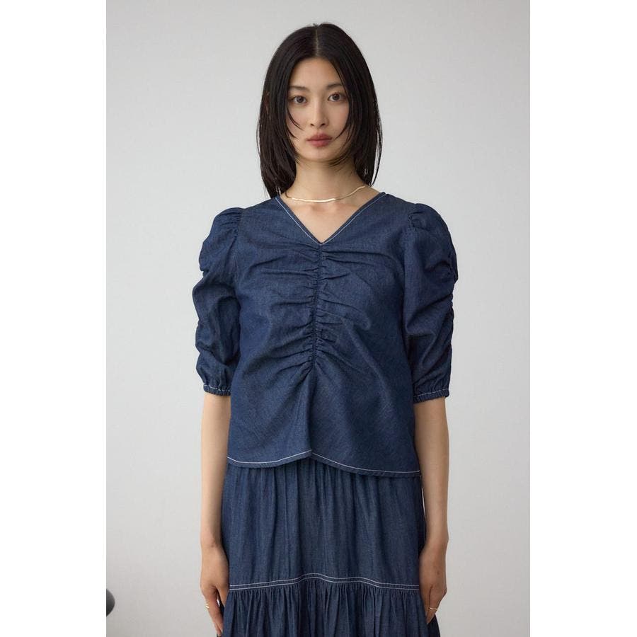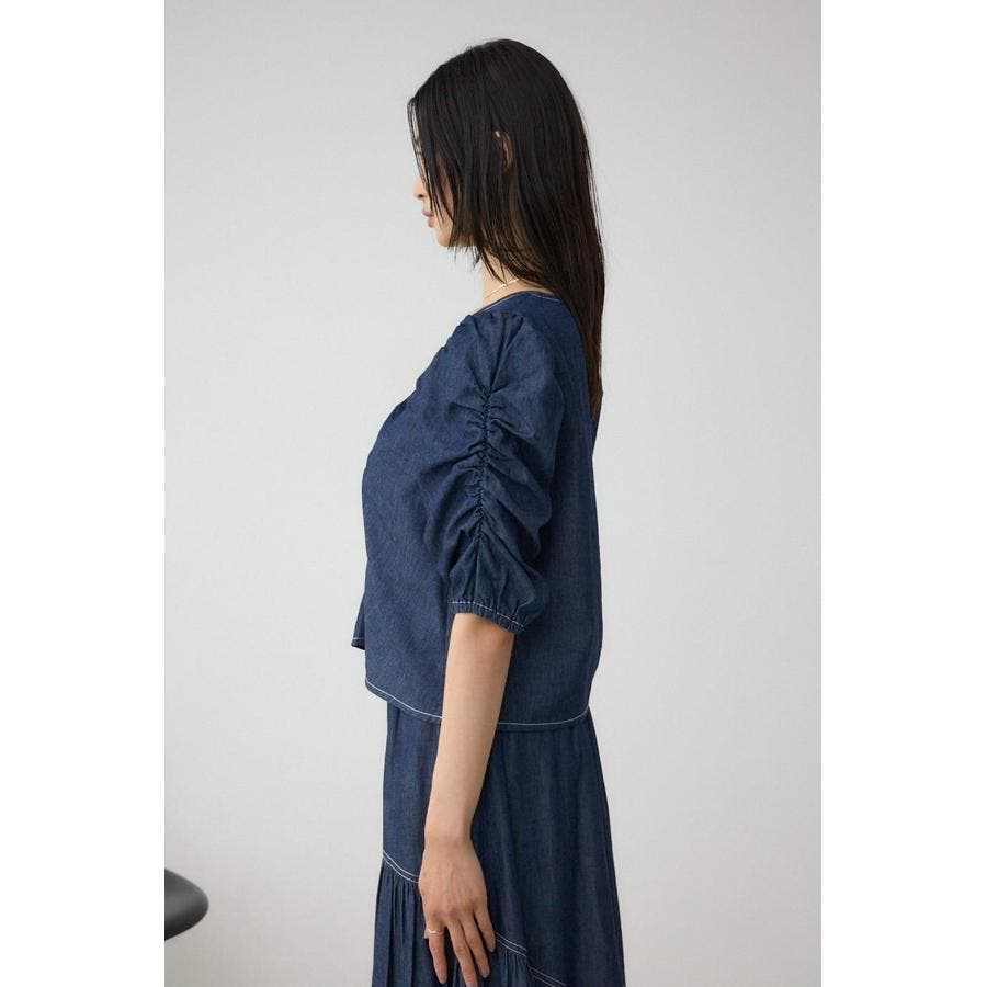 ギャザーを袖とフロントに施したAZULらしいデニムブラウス。