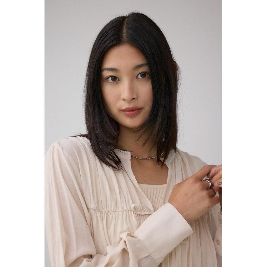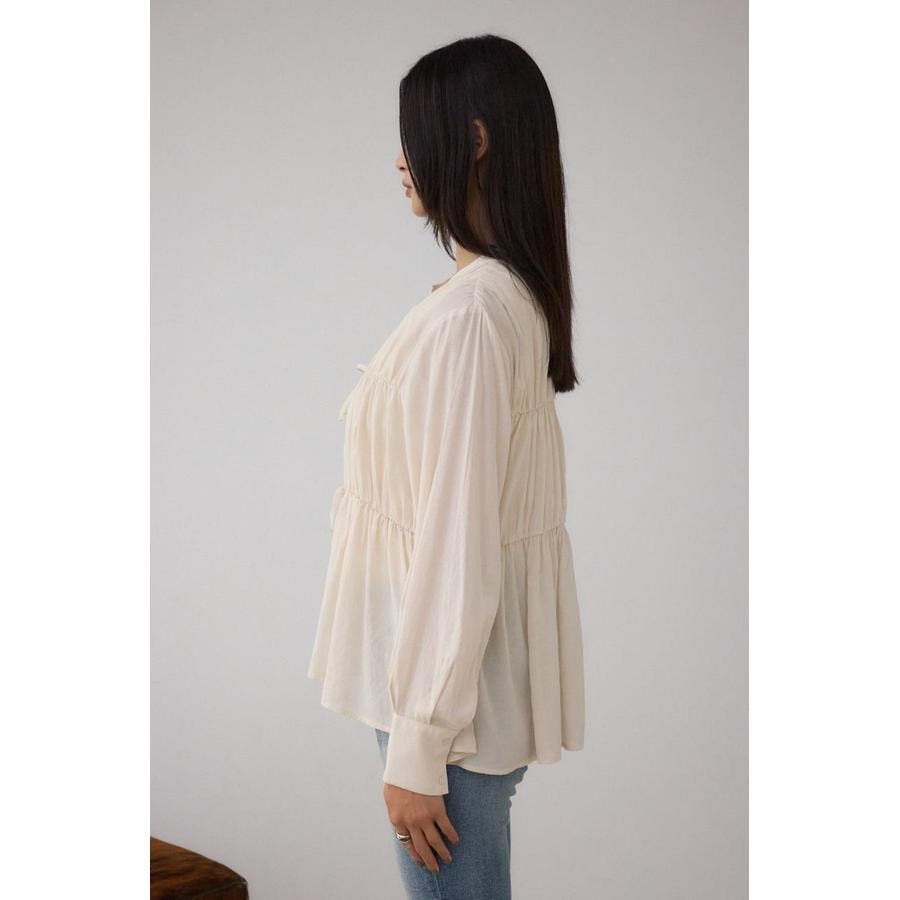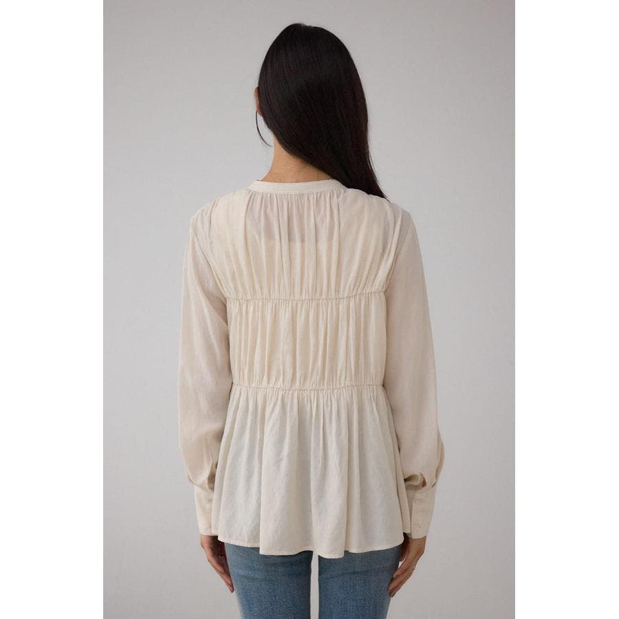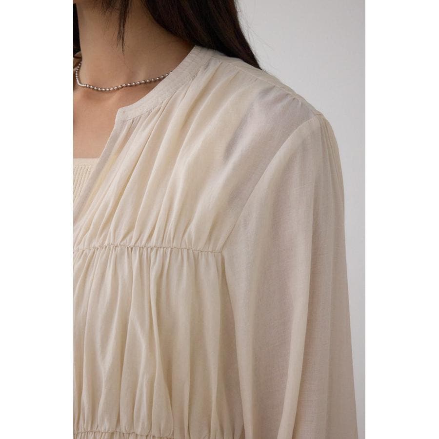 すっきりとしたVネックデザインで、ギャザーデザインが女性らしい印象をプラスします。