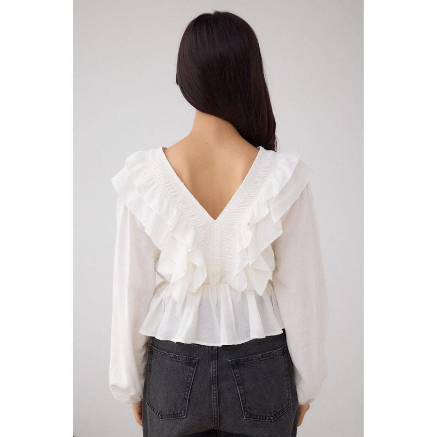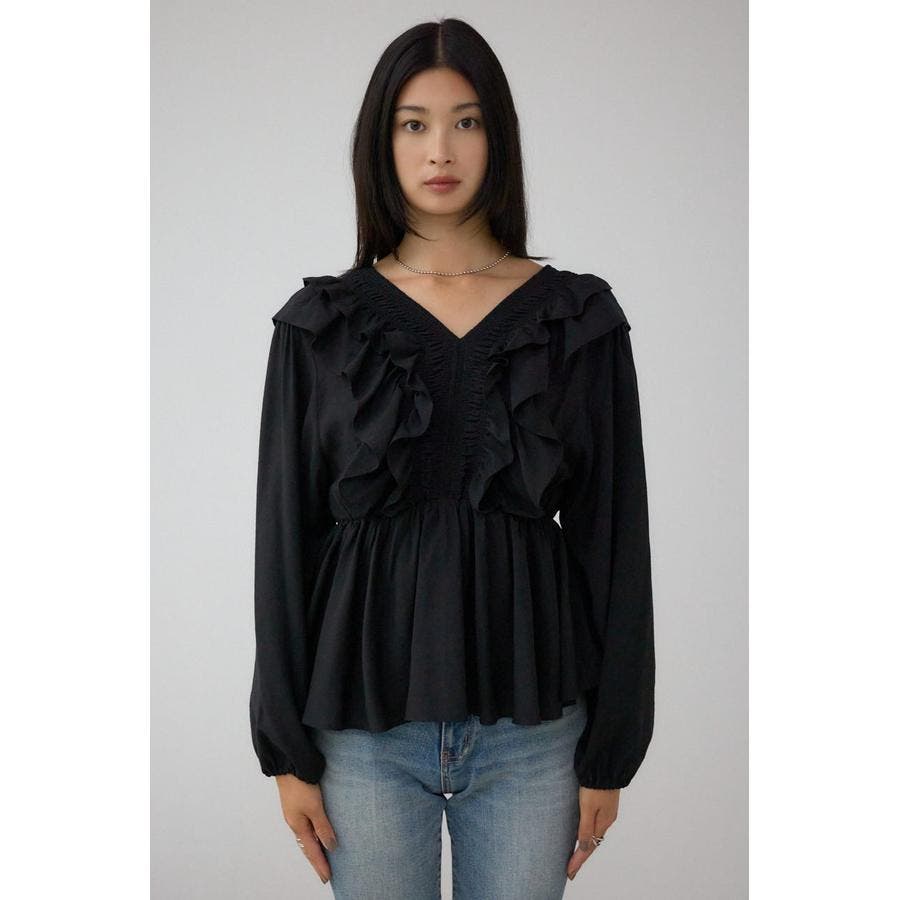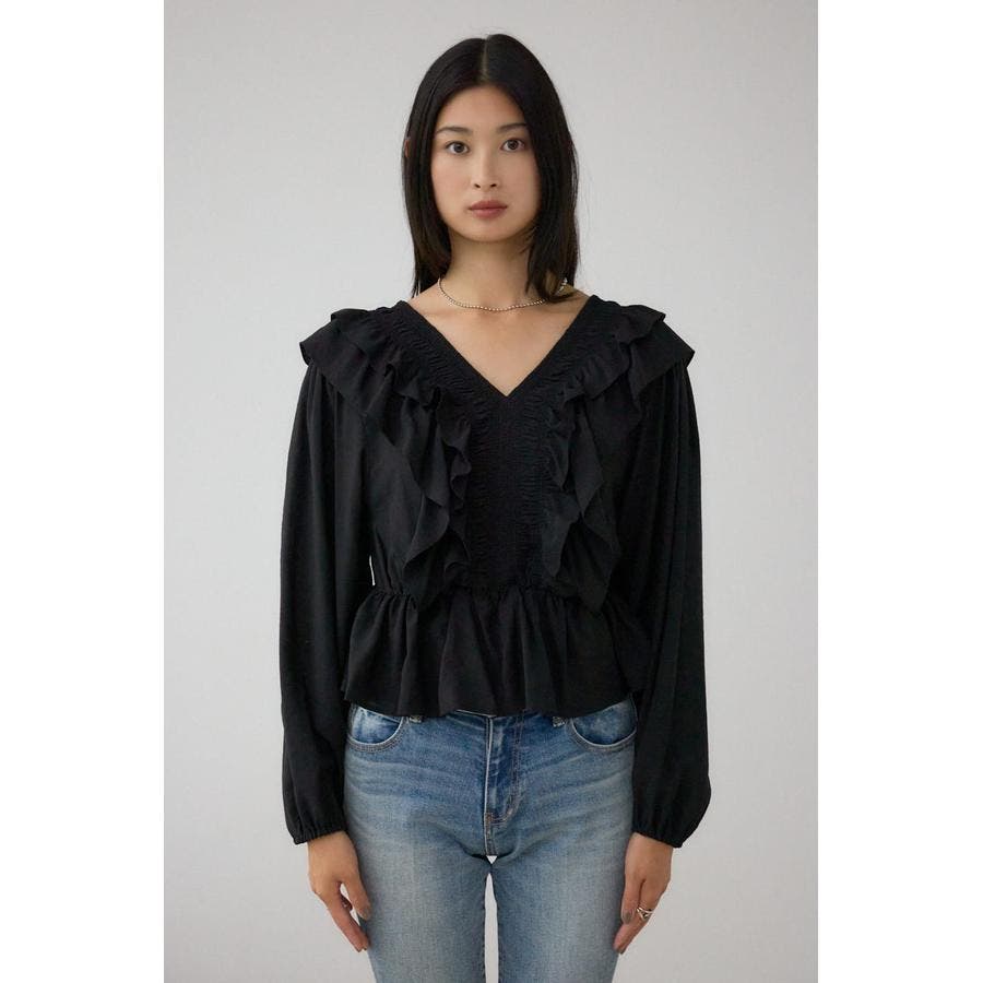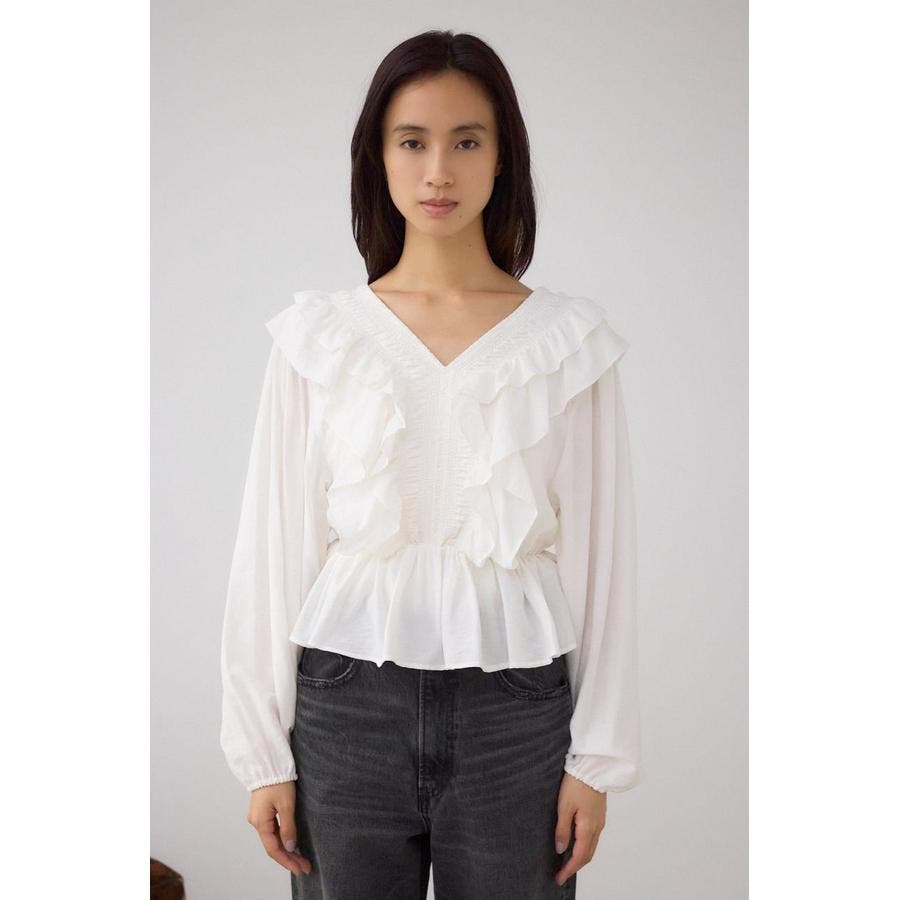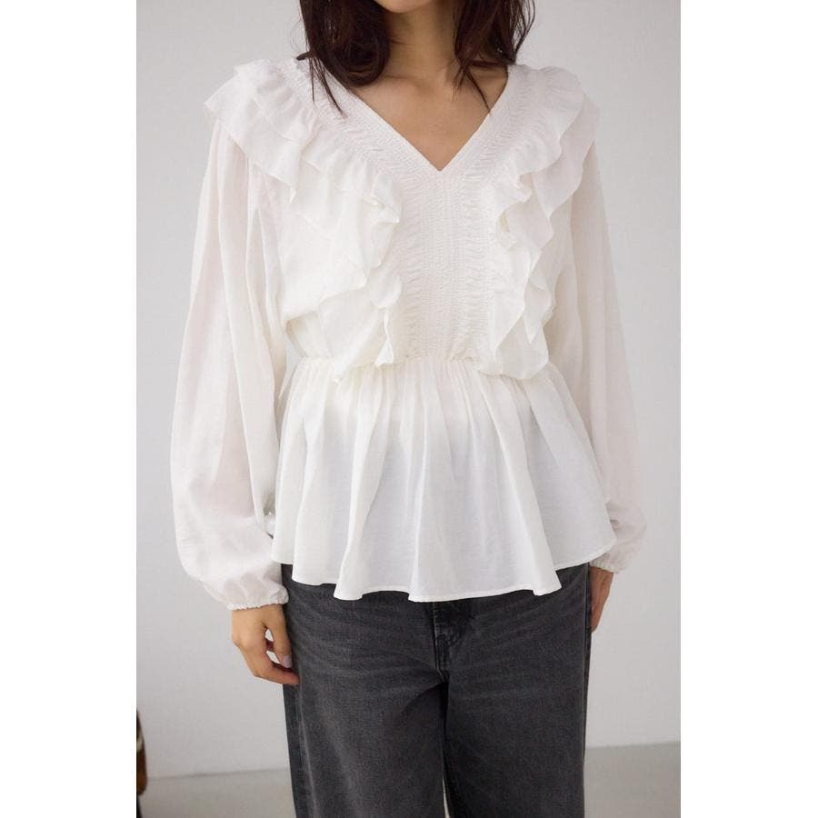 贅沢にボリュームを出したラッフルと、シャーリングがポイントのブラウス。