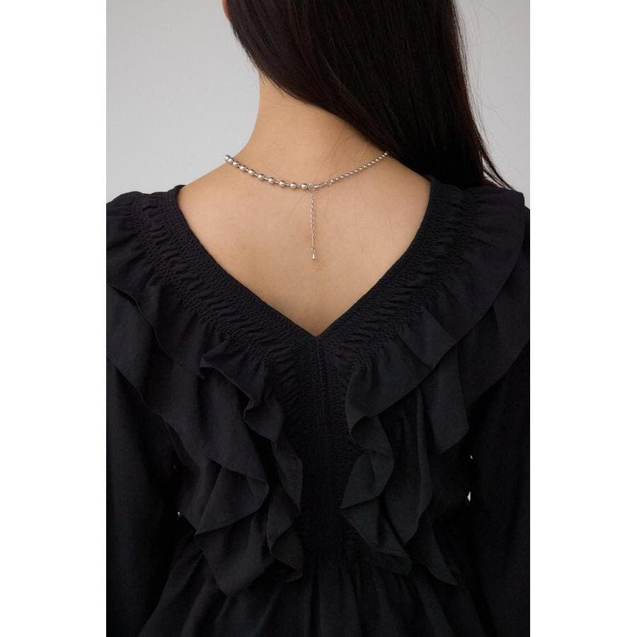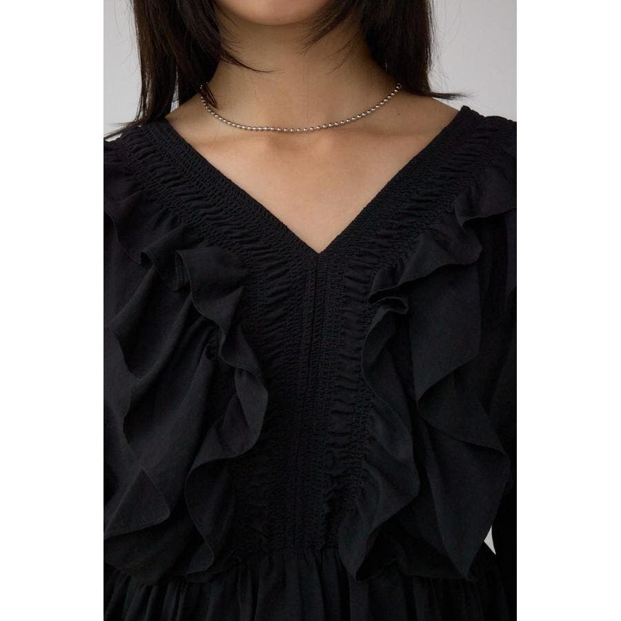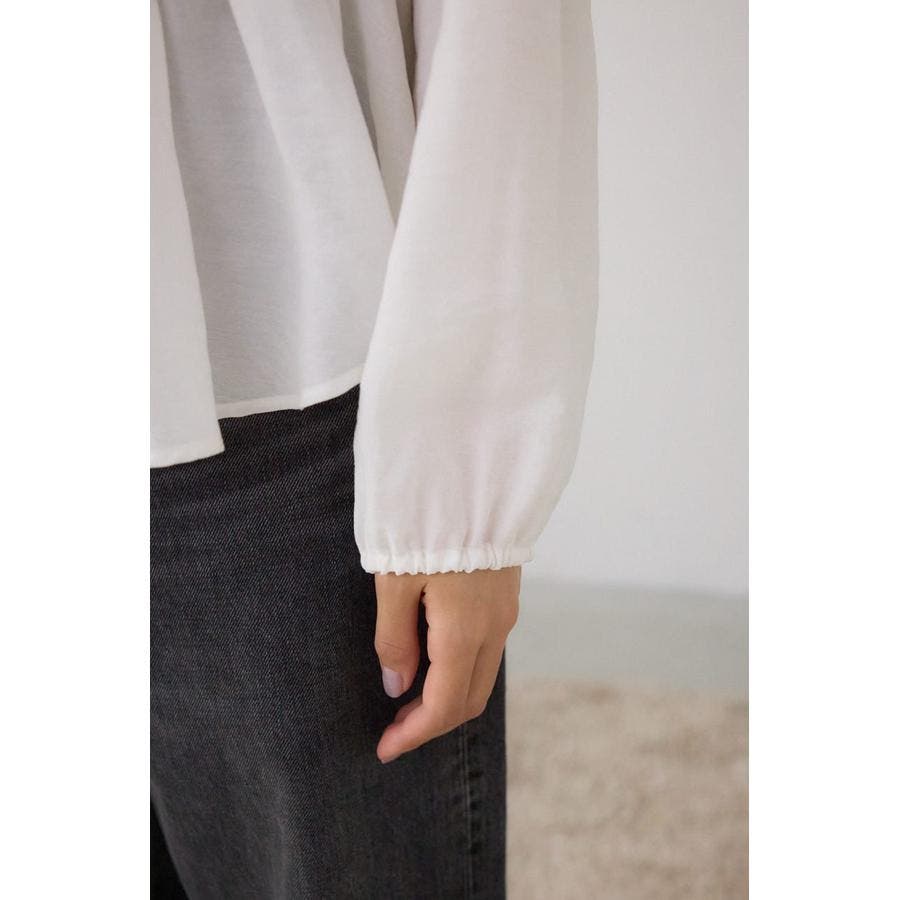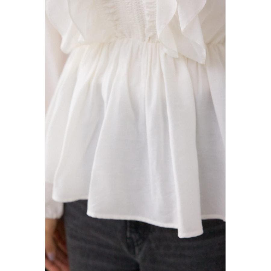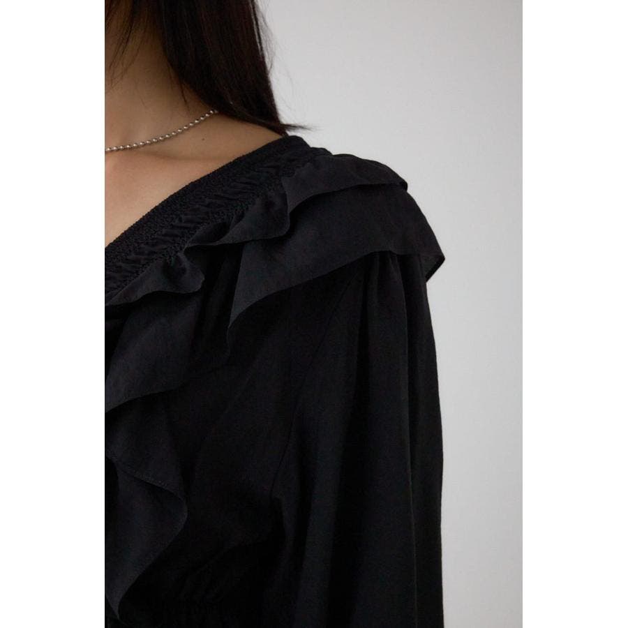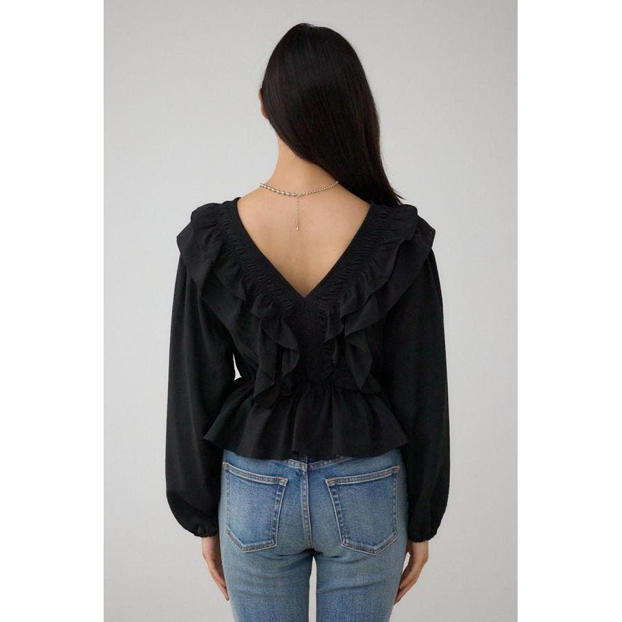 贅沢にボリュームを出したラッフルと、シャーリングがポイントのブラウス。