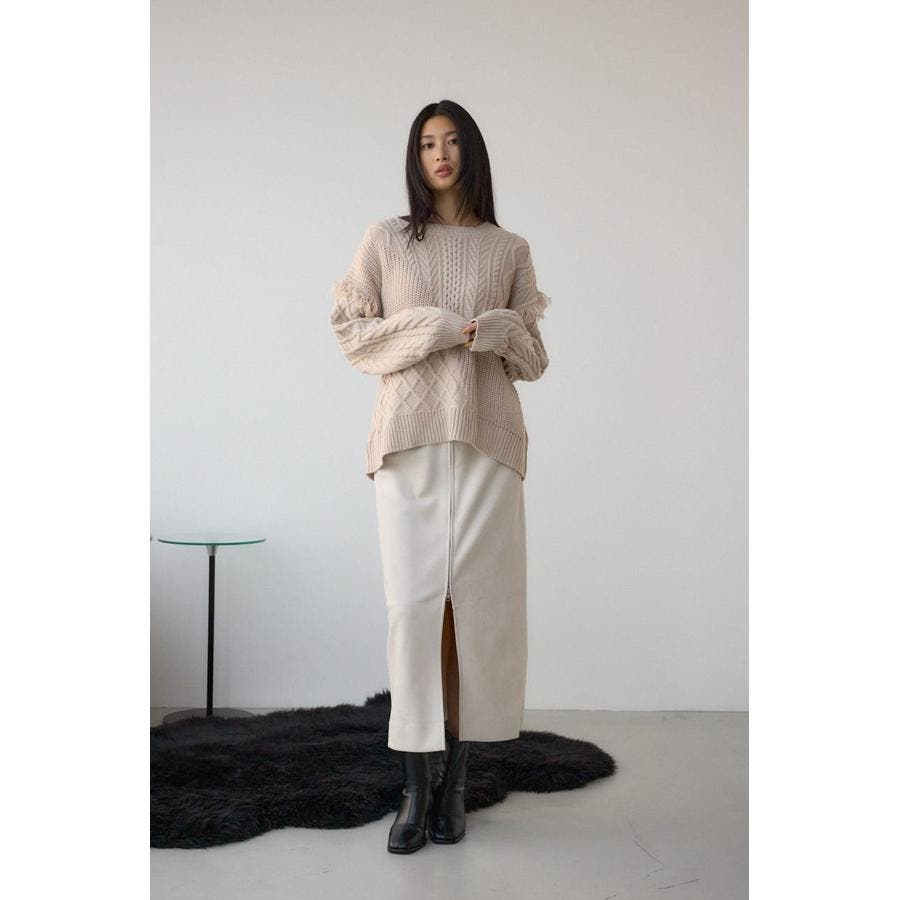 ざっくりニットをアウトにして着こなすことで、ゆる×タイトの絶妙なこなれバランスが完成。