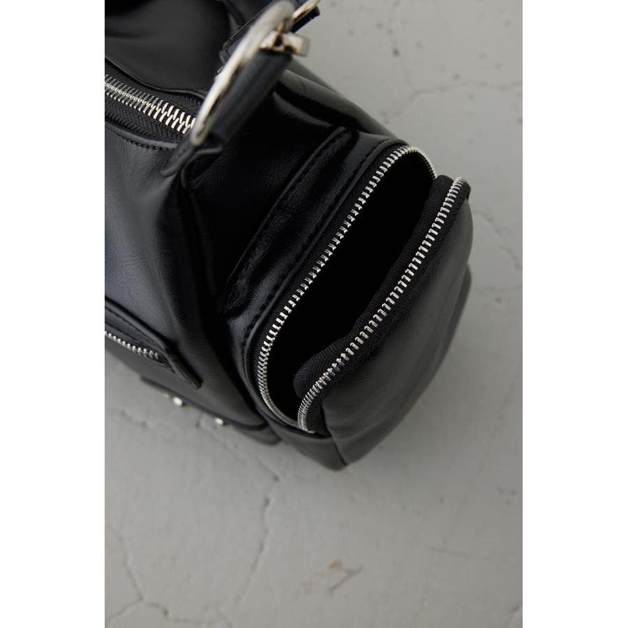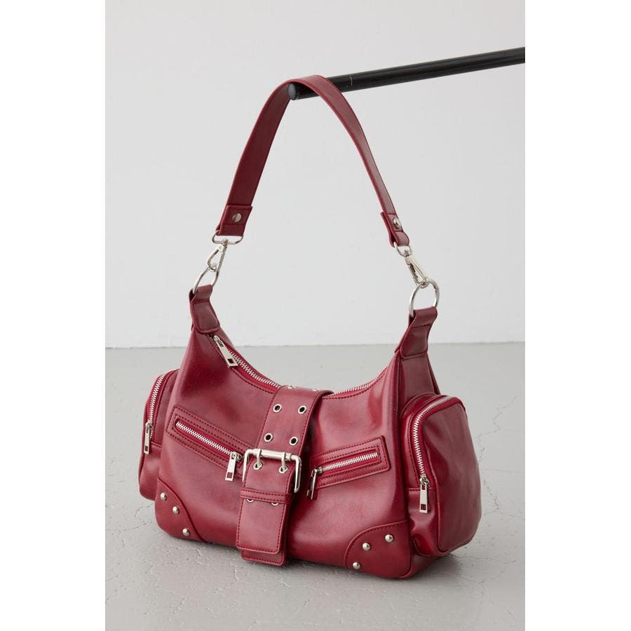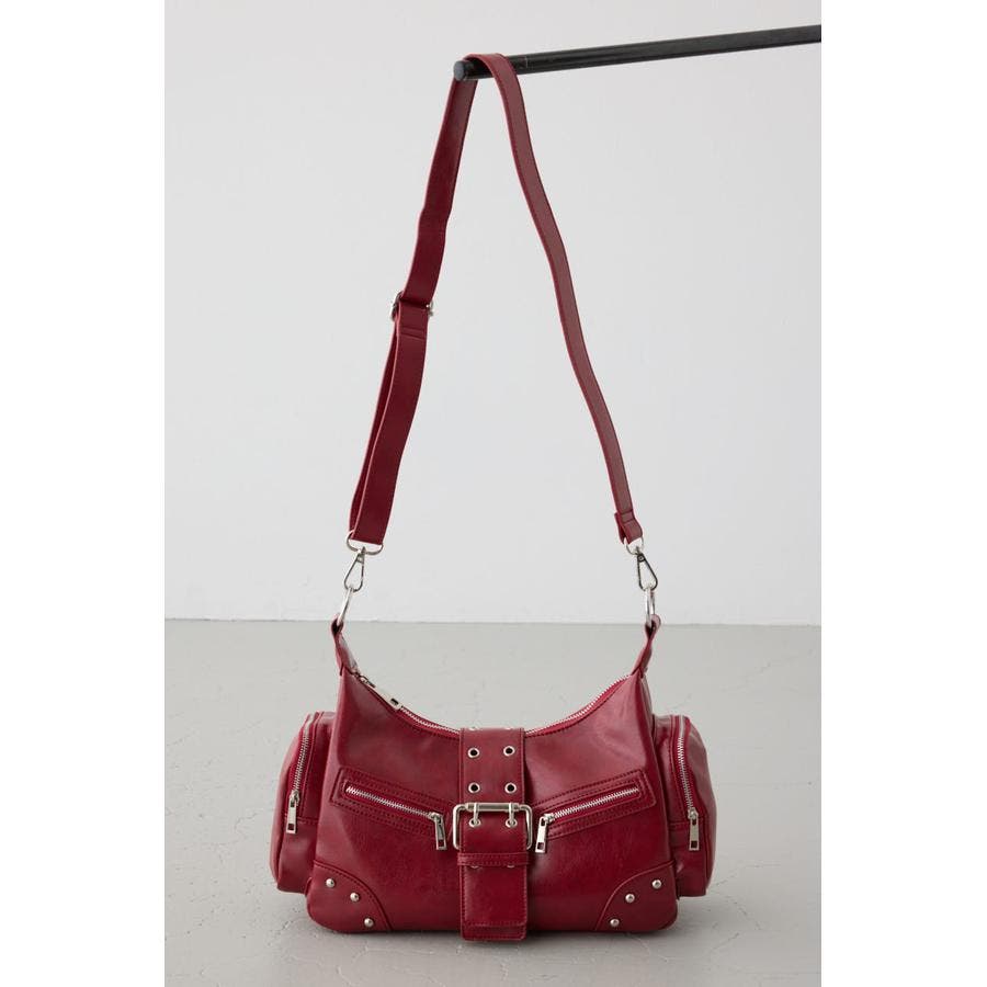 センターのワイドベルトとフロントの大きなバックルが、バッグ全体にアクセントをプラスします。