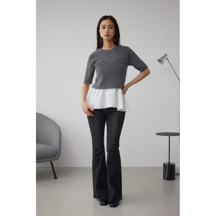 短丈のニットトップスにトレンドのペプラムデザインカットインナーをあわせて簡単にこなれたスタイリングに。