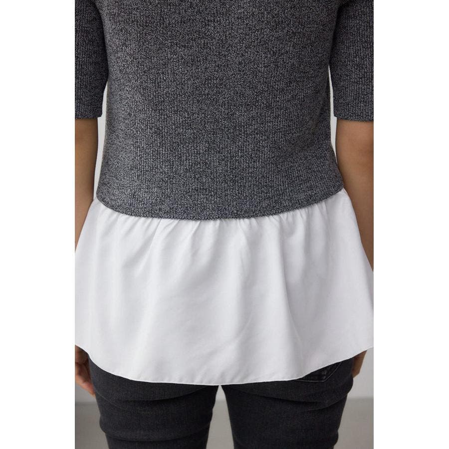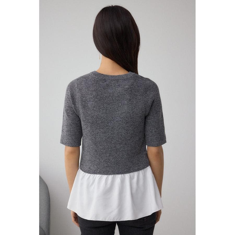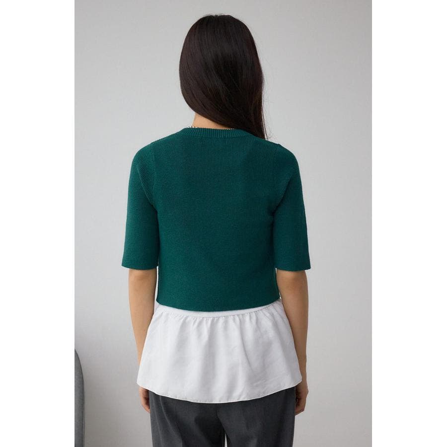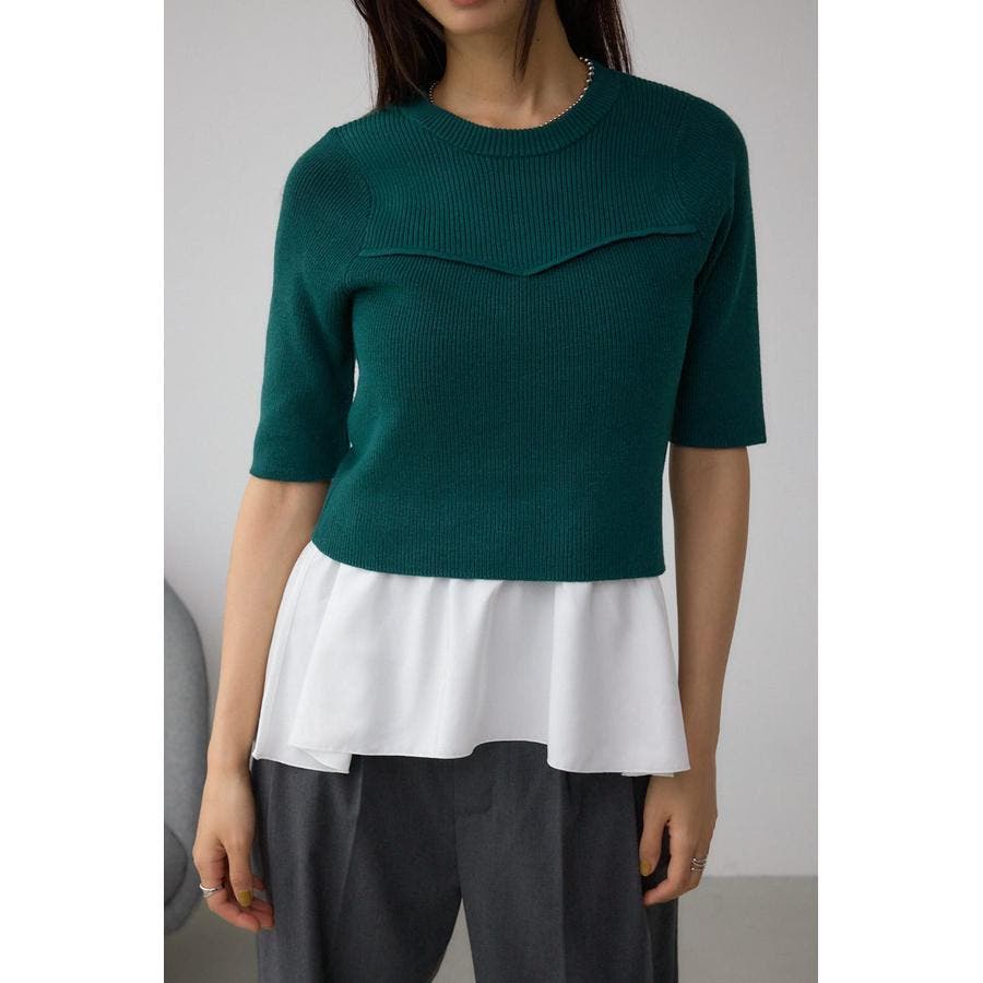 インナーのペプラムデザインタンクトップと5分袖のデザインリブニットがセットになったニットです。