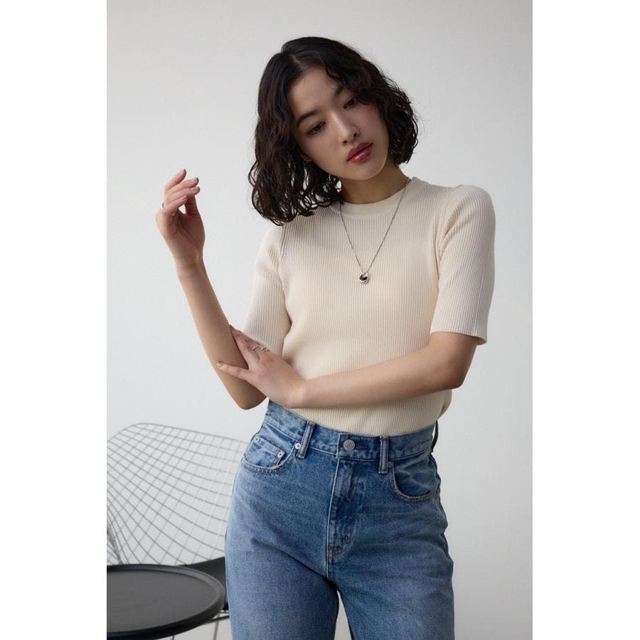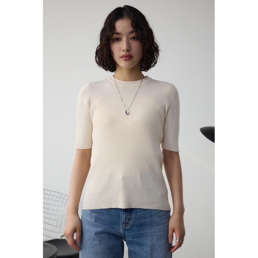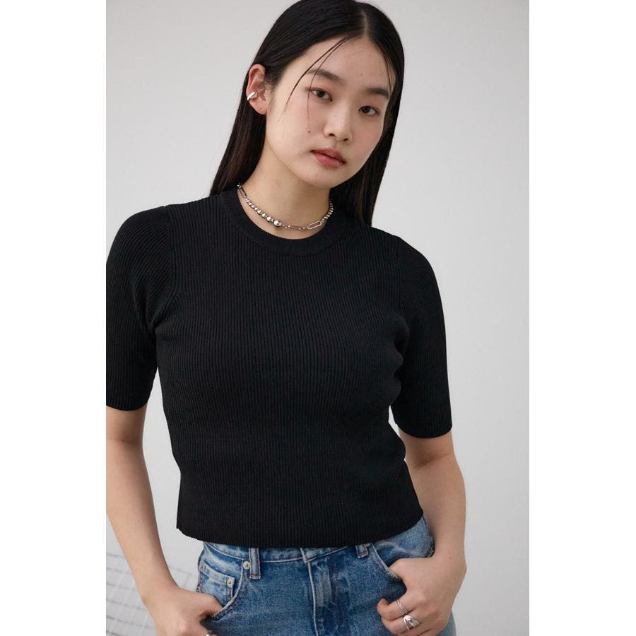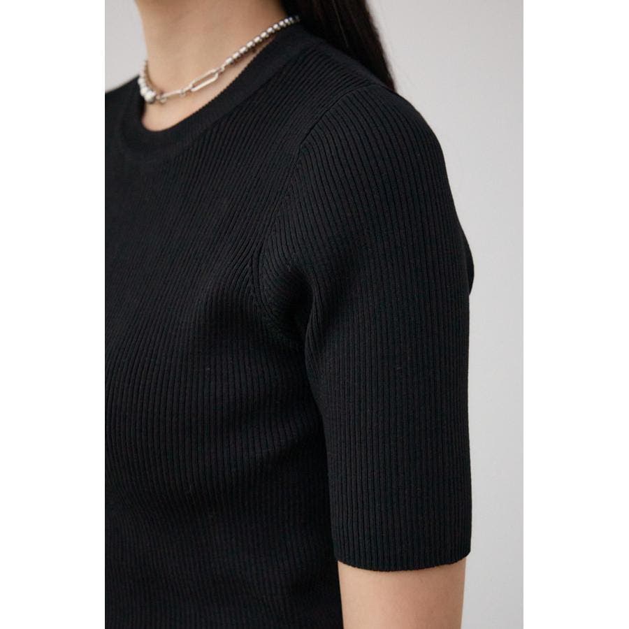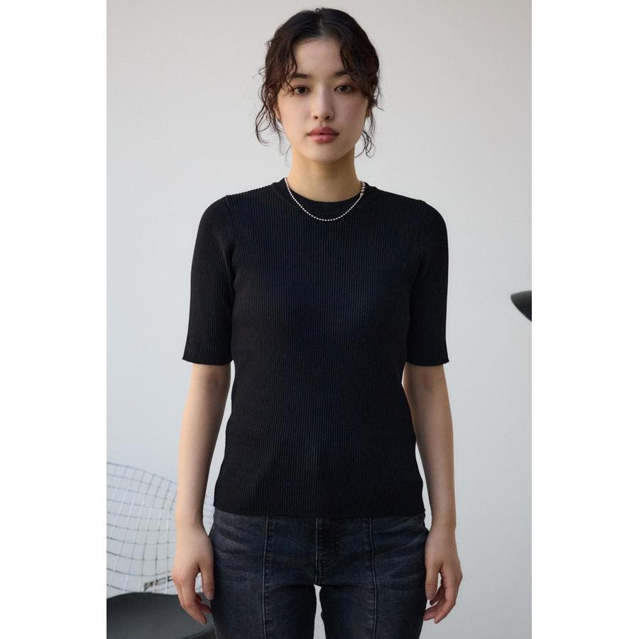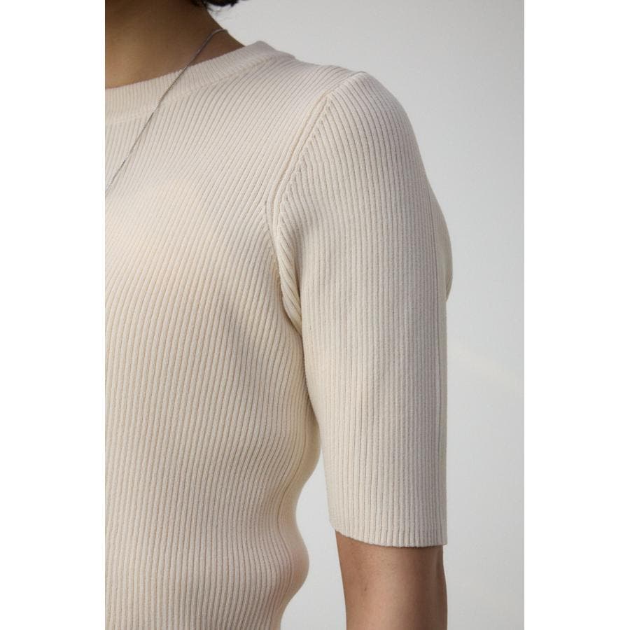 タイトシルエットのクルーネックデザインのリブニットトップス。