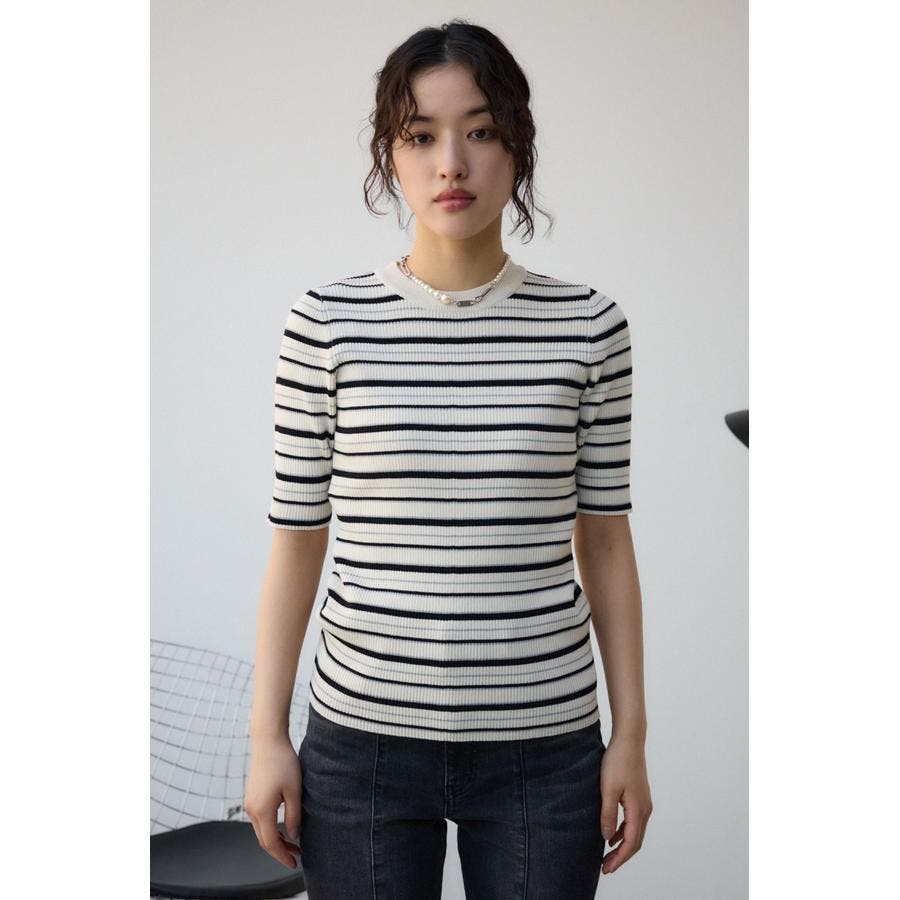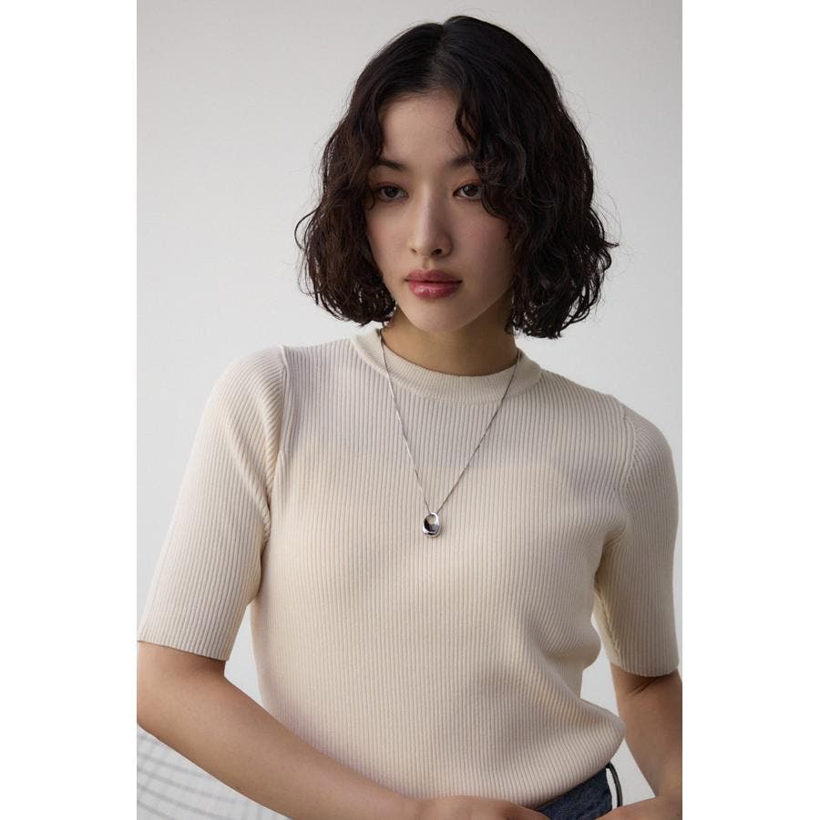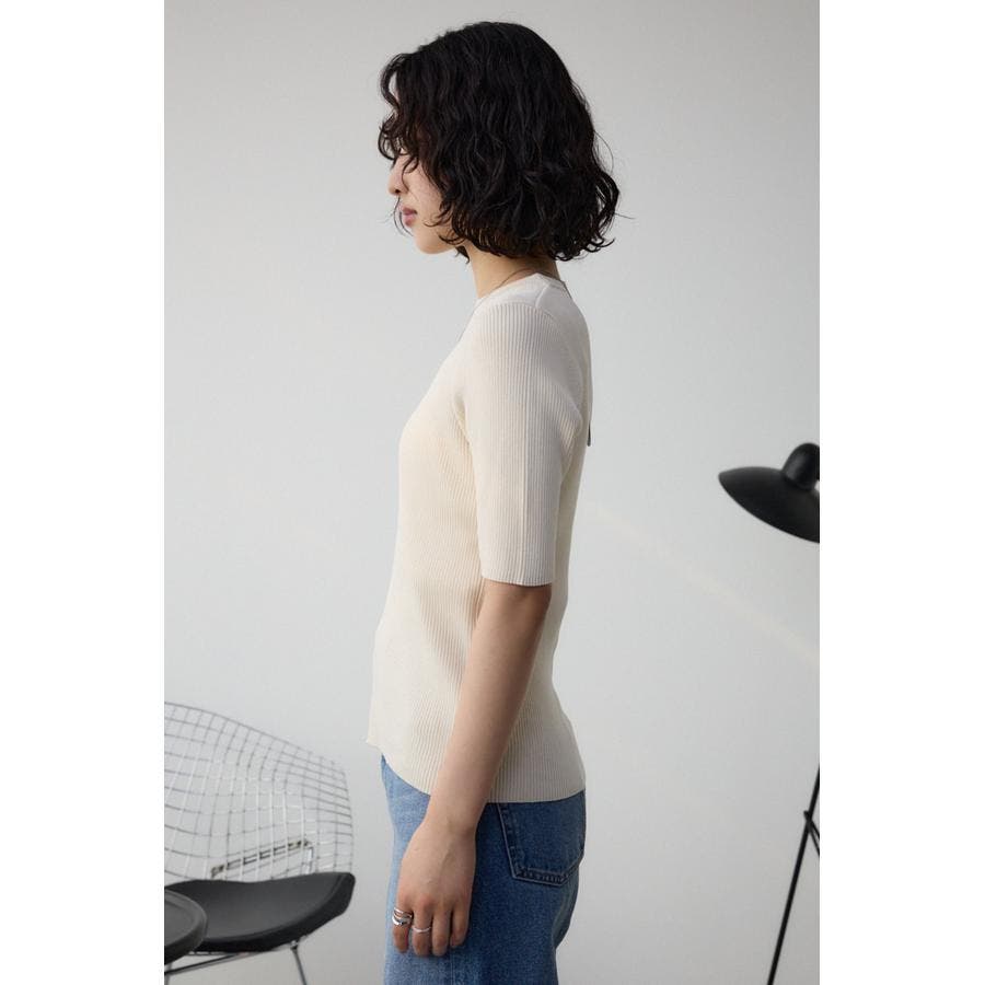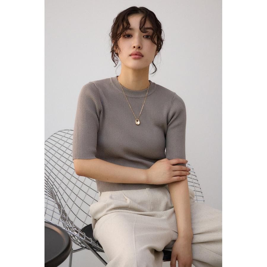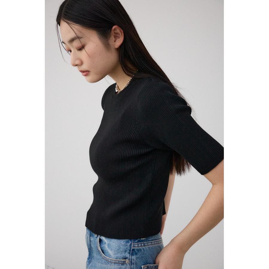 タイトシルエットのクルーネックデザインのリブニットトップス。