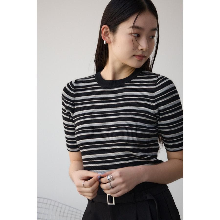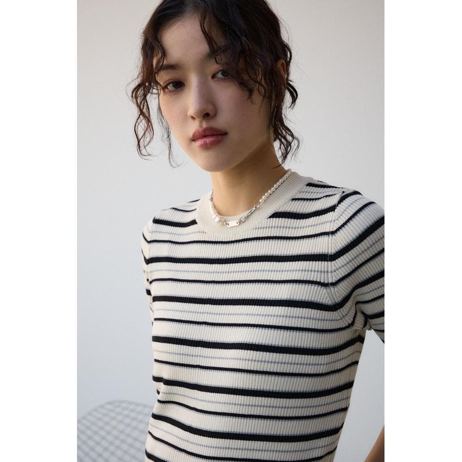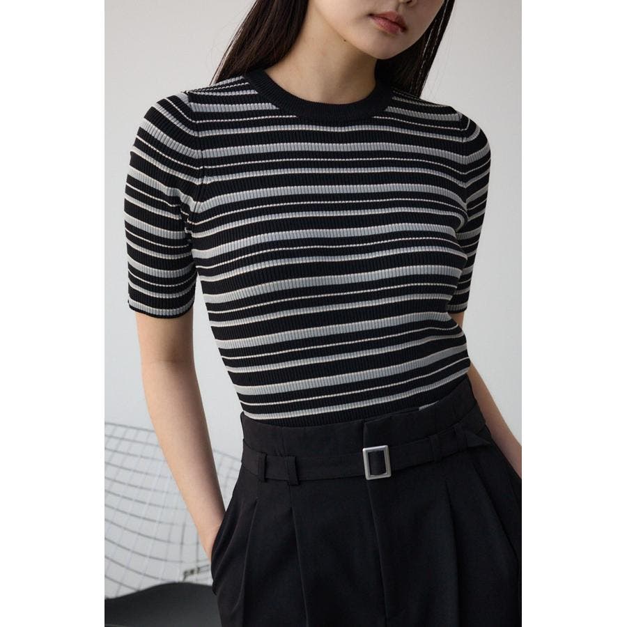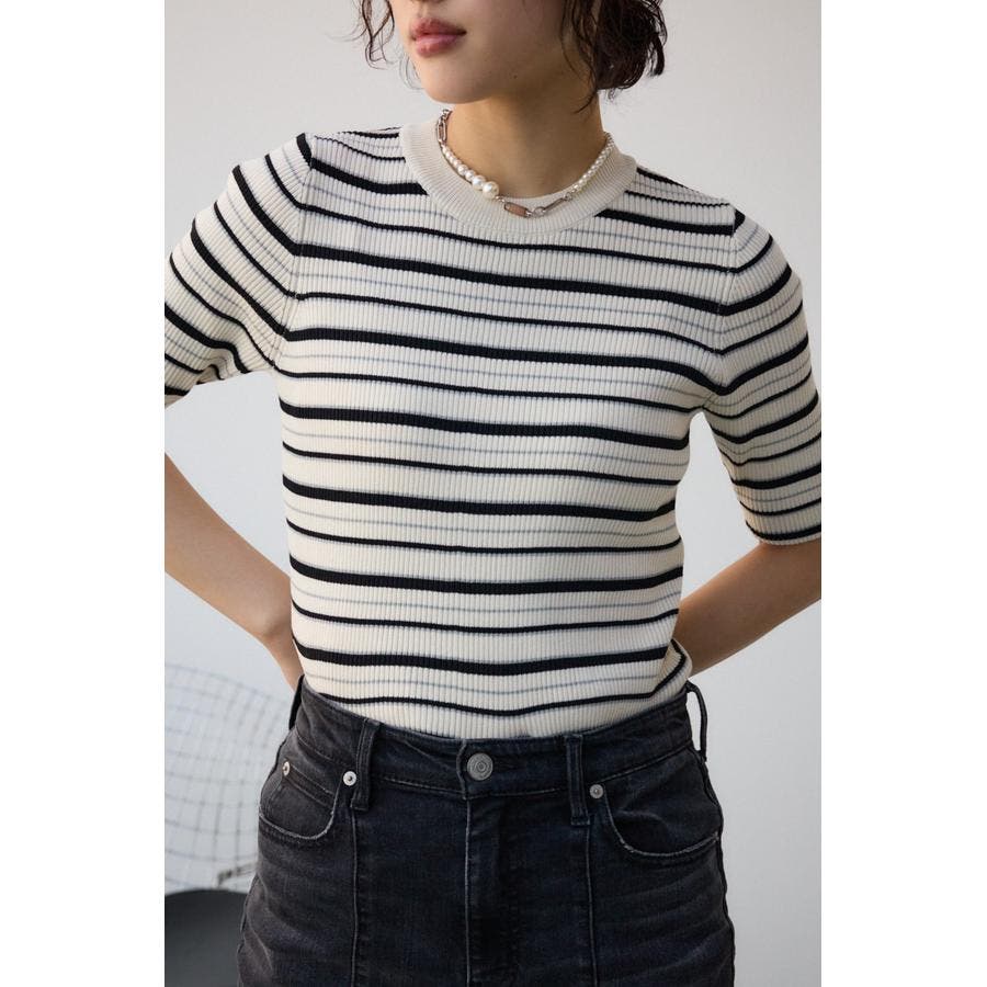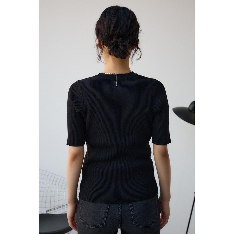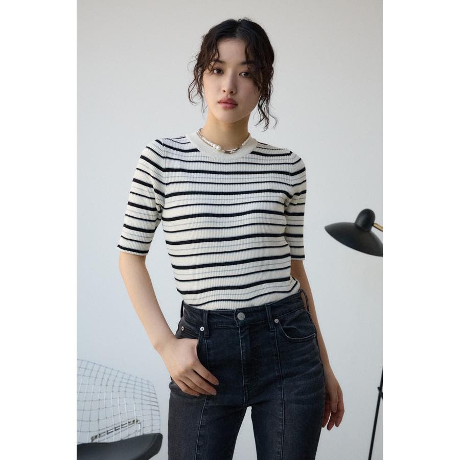 タイトシルエットのクルーネックデザインのリブニットトップス。
