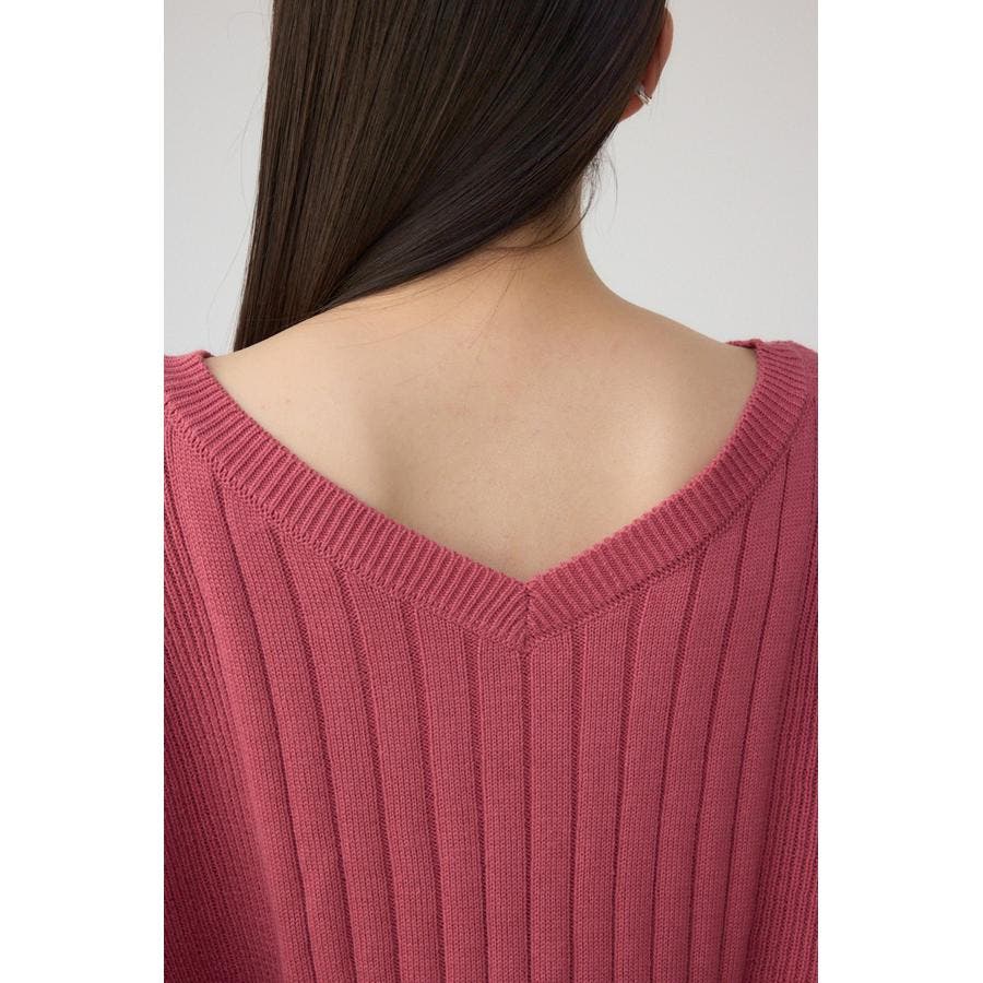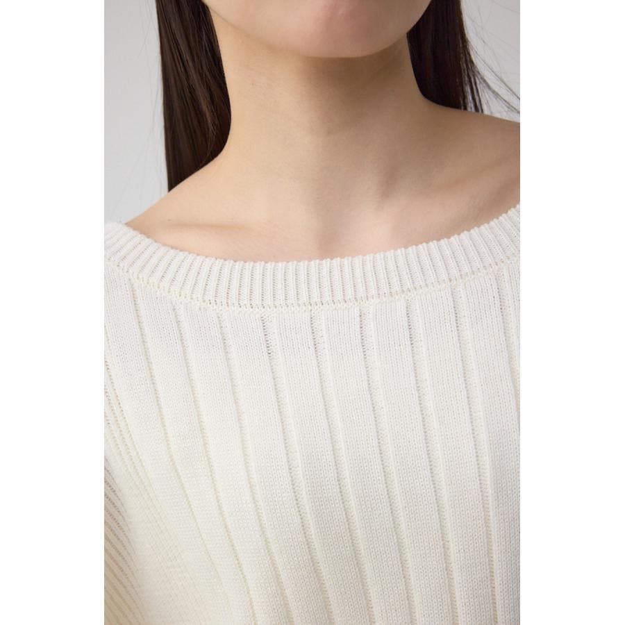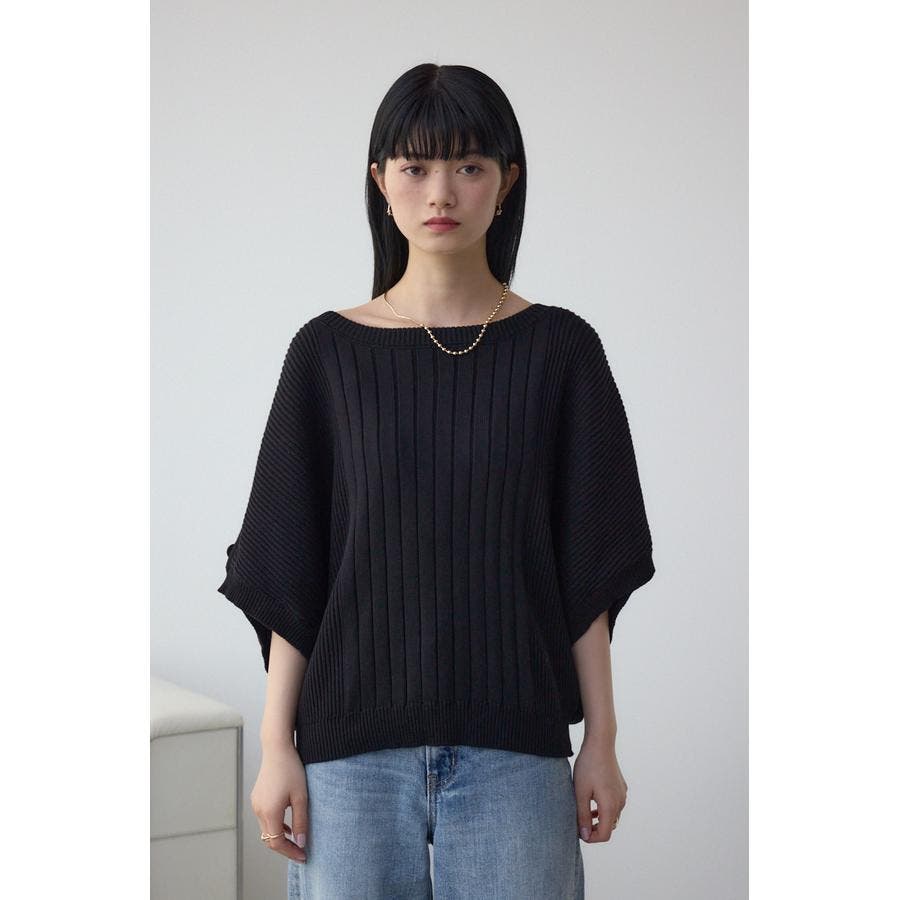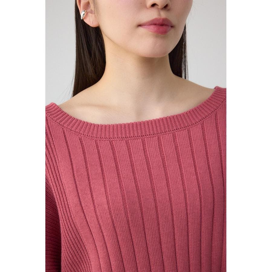 鎖骨が綺麗にみえるネックラインと脇にかけて細くなるリブ編みで細見え効果あり。