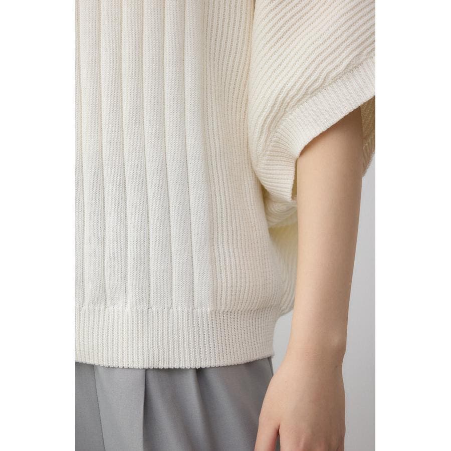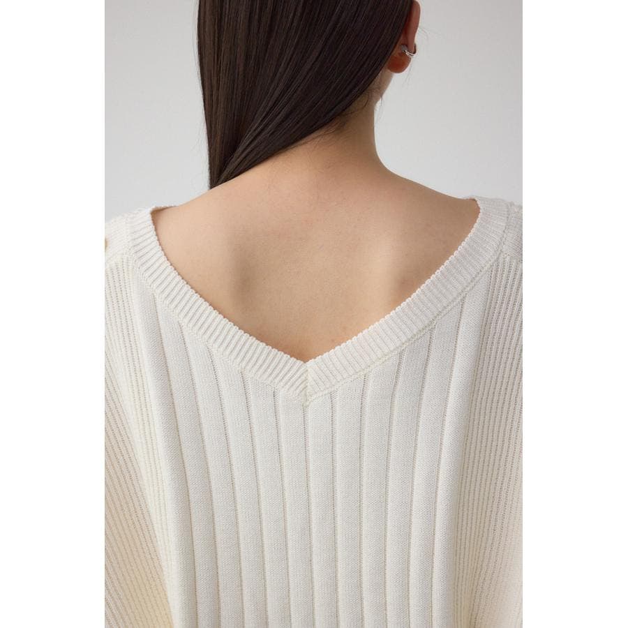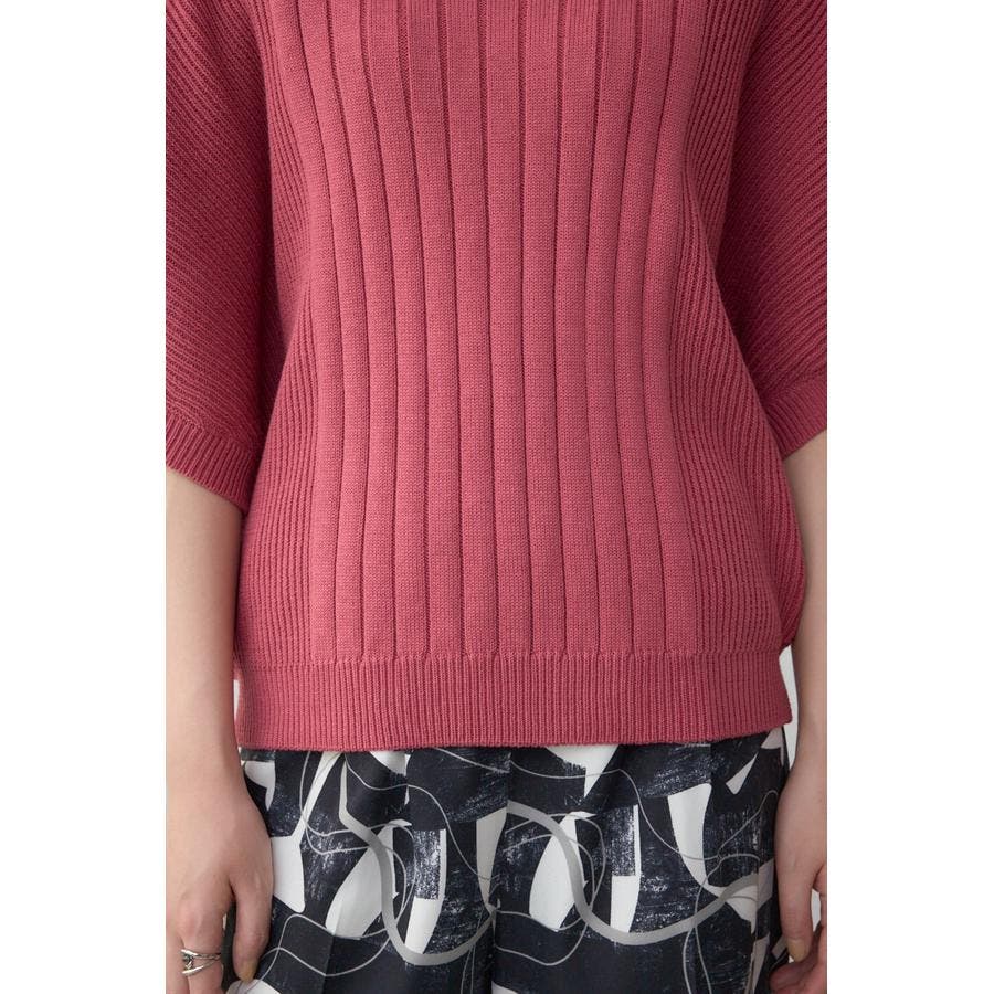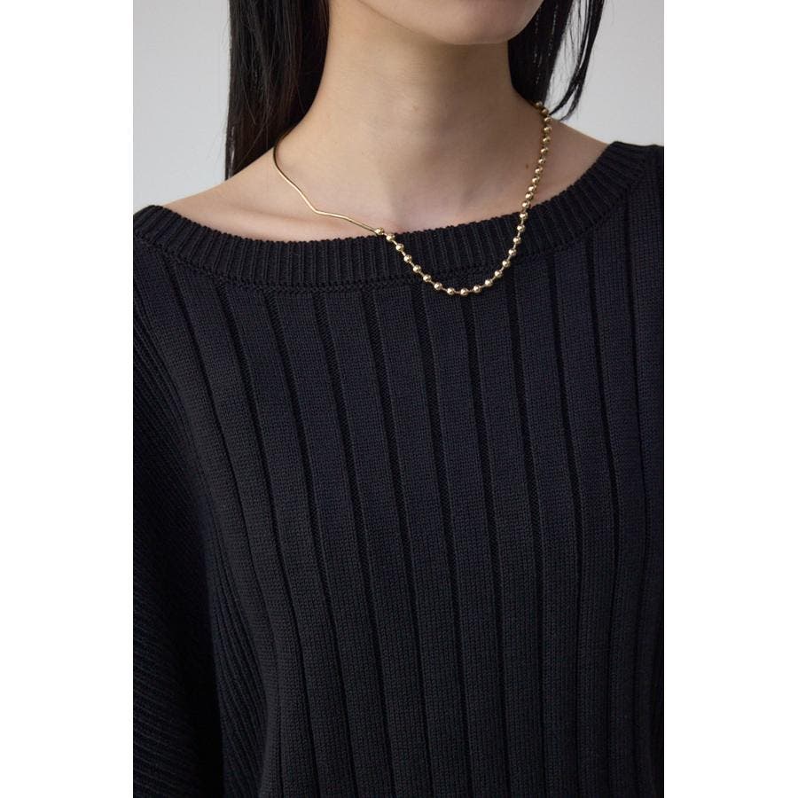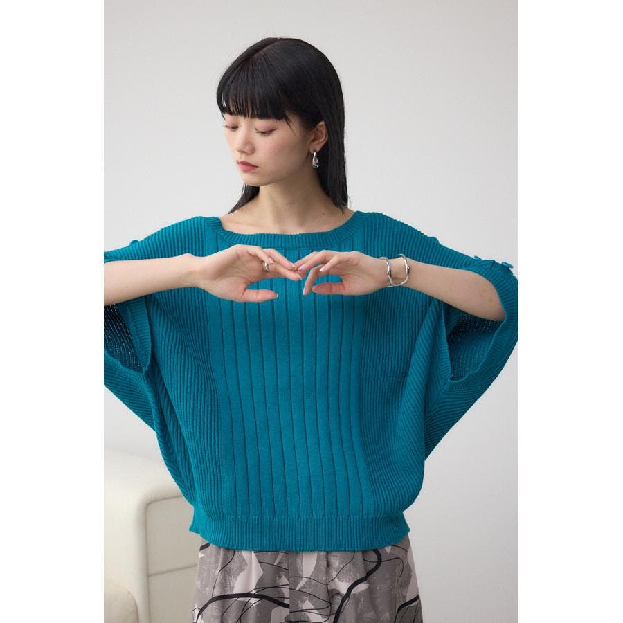 鎖骨が綺麗にみえるネックラインと脇にかけて細くなるリブ編みで細見え効果あり。