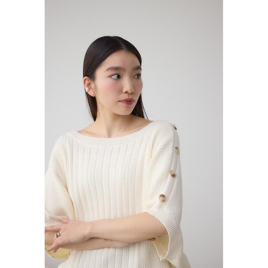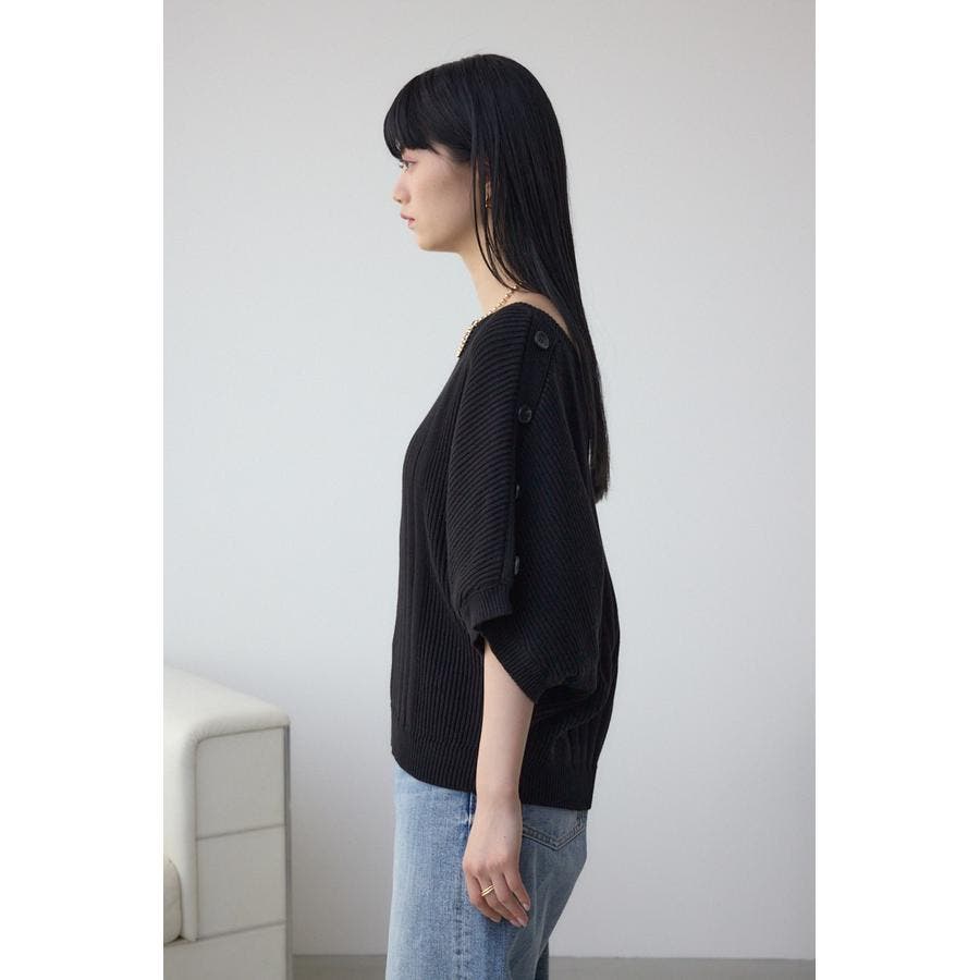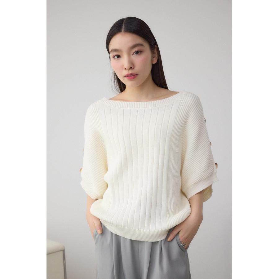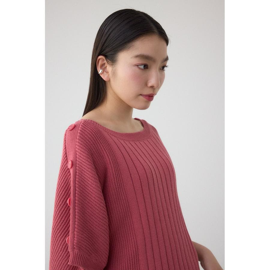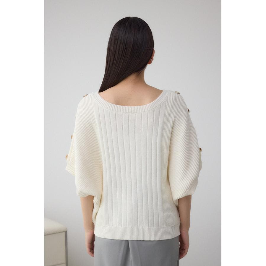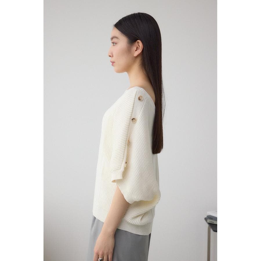 肩のボタンデザインが目を惹くデザインニット。